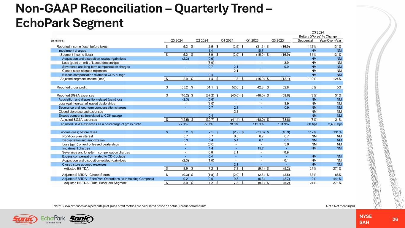 NYSE SAH GAAP Income Statement – Quarterly Trend – EchoPark Segment 25 NM = Not MeaningfulNote: Gross profit per unit metrics are calculated based on actual unrounded amounts. Q3 2024 Better / (Worse) % Change (In millions, except unit and per unit data) Q3 2024 Q2 2024 Q1 2024 Q4 2023 Q3 2023 Sequential Year-Over-Year Revenues: Used vehicles 470.3$ 448.9$ 482.9$ 492.5$ 554.8$ 5% (15%) Wholesale vehicles 23.8 21.9 28.7 22.6 26.6 9% (11%) Total vehicles 494.1 470.8 511.5 515.1 581.4 5% (15%) Finance, insurance and other, net ("F&I") 50.8 46.5 47.9 41.5 45.3 9% 12% Total revenues 544.9 517.3 559.4 556.6 626.7 5% (13%) Gross profit: Used vehicles 4.4 4.7 5.3 1.7 7.3 (7%) (40%) Wholesale vehicles 0.0 (0.1) (0.6) (0.4) 0.2 100% (100%) Total vehicles 4.4 4.6 4.7 1.3 7.5 (5%) (41%) Finance, insurance and other, net 50.8 46.5 47.9 41.5 45.3 9% 12% Total gross profit 55.2 51.1 52.6 42.8 52.8 8% 5% SG&A expenses (40.2) (37.2) (45.6) (48.0) (58.6) (8%) 31% Impairment charges - (1.4) - (15.7) - NM NM Depreciation and amortization (5.4) (5.6) (5.5) (6.2) (6.1) 3% 11% Operating income (loss) 9.6 6.9 1.5 (27.1) (11.9) 40% 181% Interest expense, floor plan (3.7) (3.8) (3.8) (3.8) (4.3) 2% 14% Interest expense, other, net (0.7) (0.7) (0.7) (0.7) (0.7) (5%) 0% Other income (expense), net - 0.1 0.1 - - NM NM Income (loss) before taxes 5.2$ 2.5$ (2.9)$ (31.6)$ (16.9)$ 112% 131% Unit sales volume: Used vehicles 17,757 16,641 17,981 17,562 19,050 7% (7%) Wholesale vehicles 2,720 2,593 2,994 2,621 2,740 5% (1%) Gross profit per unit ("GPU"): Total used vehicle and F&I 3,111$ 3,078$ 2,955$ 2,461$ 2,767$ 1% 12%