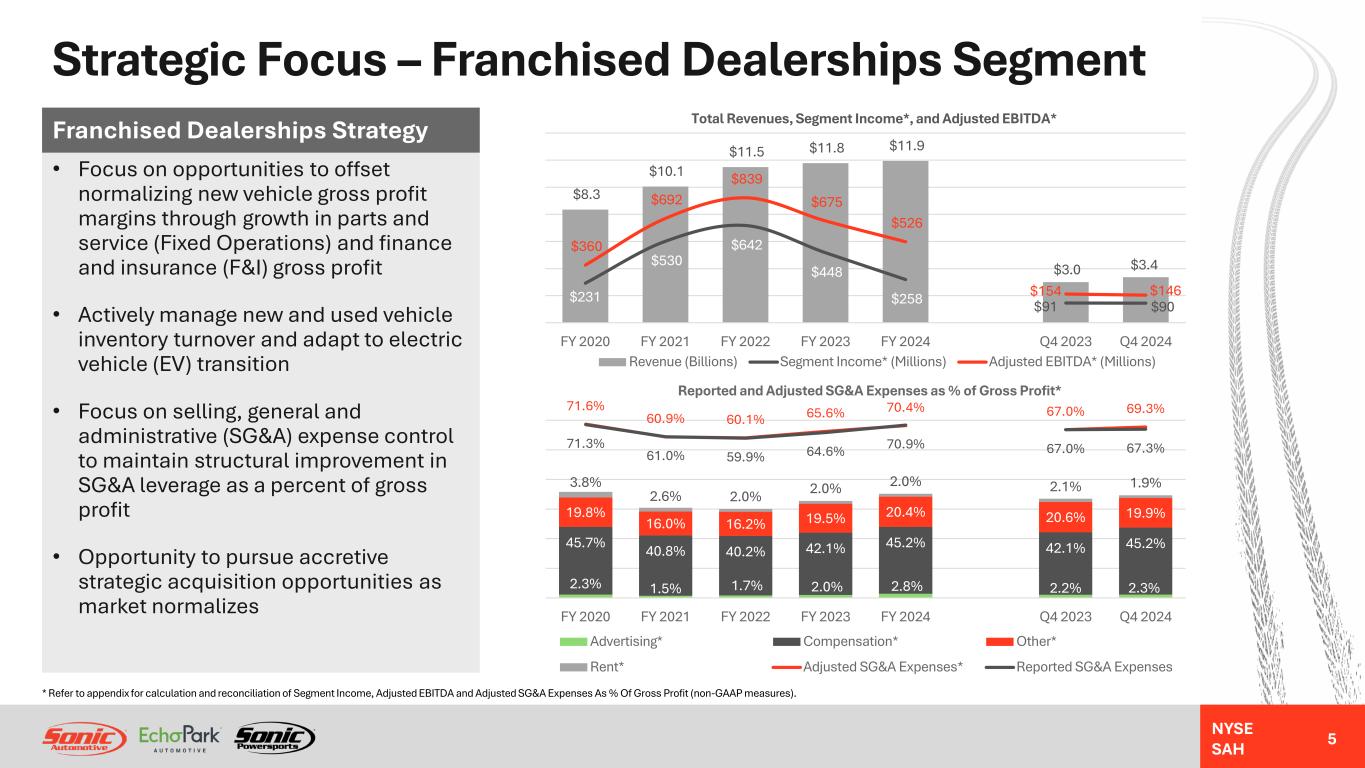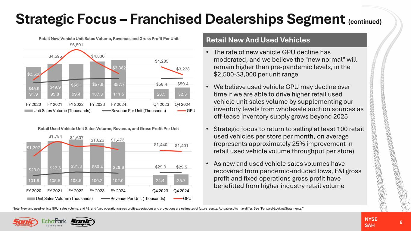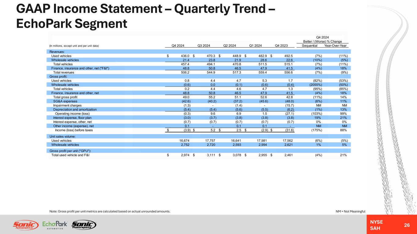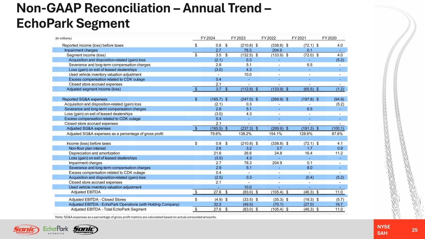 NYSE SAH GAAP Income Statement – Annual Trend – EchoPark Segment 24 NM = Not MeaningfulNote: Gross profit per unit metrics are calculated based on actual unrounded amounts. FY 2024 Better / (Worse) % Change (In millions, except unit, per unit, and per share data) FY 2024 FY 2023 FY 2022 FY 2021 FY 2020 Year-Over-Year Revenues: Total new vehicles -$ 1.0$ 9.2$ 9.0$ -$ (100%) Used vehicles 1,838.0 2,143.8 2,116.8 2,032.6 1,258.2 (14%) Wholesale vehicles 95.8 111.7 227.0 92.9 18.2 (14%) Total vehicles 1,933.8 2,256.5 2,353.0 2,134.5 1,276.4 (14%) Finance, insurance and other, net ("F&I") 194.0 177.9 166.4 193.7 132.1 9% Total revenues 2,127.8 2,434.4 2,463.0 2,345.3 1,419.0 (13%) Gross profit: Total new vehicles - 0.1 1.1 1.1 - (100%) Used vehicles 15.2 (17.1) 4.4 (55.2) (18.0) 189% Wholesale vehicles (1.3) 0.9 4.2 7.4 (0.2) (251%) Total vehicles 13.9 (16.1) 9.7 (46.7) (18.2) 186% Finance, insurance and other, net 194.0 177.9 166.4 193.7 132.1 9% Total gross profit 207.9 161.8 175.1 148.8 114.0 29% SG&A expenses (165.7) (247.0) (269.9) (197.8) (94.9) 33% Impairment charges (2.7) (78.3) (204.9) (0.1) - NM Depreciation and amortization (21.8) (26.6) (24.6) (16.3) (11.0) 18% Operating income (loss) 17.7 (190.1) (324.3) (65.4) 8.1 109% Interest expense, floor plan (14.2) (17.4) (10.6) (5.0) (3.2) 18% Interest expense, other, net (2.7) (3.2) (3.9) (1.7) (0.9) 16% Other income (expense), net - (0.1) - - - NM Income (loss) before taxes 0.8$ (210.8)$ (338.8)$ (72.1)$ 4.0$ 100% Unit sales volume: Retail new vehicles - 11 152 128 - (100%) Used vehicles 69,053 73,676 64,107 77,835 57,161 (6%) Wholesale vehicles 11,059 11,512 11,236 11,667 7,178 (4%) Gross profit per unit ("GPU"): Retail new vehicles N/A 6,934$ 7,510$ 8,303$ N/A NM Total used vehicle and F&I 3,029$ 2,183$ 2,657$ 1,762$ 2,013$ 39%