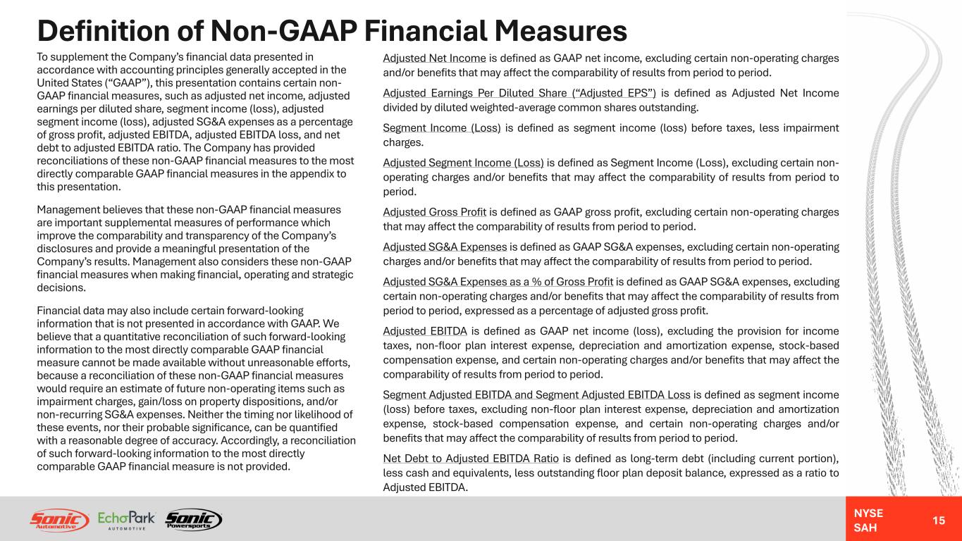 NYSE SAH Definition of Non-GAAP Financial Measures 15 Adjusted Net Income is defined as GAAP net income, excluding certain non-operating charges and/or benefits that may affect the comparability of results from period to period. Adjusted Earnings Per Diluted Share (“Adjusted EPS”) is defined as Adjusted Net Income divided by diluted weighted-average common shares outstanding. Segment Income (Loss) is defined as segment income (loss) before taxes, less impairment charges. Adjusted Segment Income (Loss) is defined as Segment Income (Loss), excluding certain non- operating charges and/or benefits that may affect the comparability of results from period to period. Adjusted Gross Profit is defined as GAAP gross profit, excluding certain non-operating charges that may affect the comparability of results from period to period. Adjusted SG&A Expenses is defined as GAAP SG&A expenses, excluding certain non-operating charges and/or benefits that may affect the comparability of results from period to period. Adjusted SG&A Expenses as a % of Gross Profit is defined as GAAP SG&A expenses, excluding certain non-operating charges and/or benefits that may affect the comparability of results from period to period, expressed as a percentage of adjusted gross profit. Adjusted EBITDA is defined as GAAP net income (loss), excluding the provision for income taxes, non-floor plan interest expense, depreciation and amortization expense, stock-based compensation expense, and certain non-operating charges and/or benefits that may affect the comparability of results from period to period. Segment Adjusted EBITDA and Segment Adjusted EBITDA Loss is defined as segment income (loss) before taxes, excluding non-floor plan interest expense, depreciation and amortization expense, stock-based compensation expense, and certain non-operating charges and/or benefits that may affect the comparability of results from period to period. Net Debt to Adjusted EBITDA Ratio is defined as long-term debt (including current portion), less cash and equivalents, less outstanding floor plan deposit balance, expressed as a ratio to Adjusted EBITDA. To supplement the Company’s financial data presented in accordance with accounting principles generally accepted in the United States (“GAAP”), this presentation contains certain non- GAAP financial measures, such as adjusted net income, adjusted earnings per diluted share, segment income (loss), adjusted segment income (loss), adjusted SG&A expenses as a percentage of gross profit, adjusted EBITDA, adjusted EBITDA loss, and net debt to adjusted EBITDA ratio. The Company has provided reconciliations of these non-GAAP financial measures to the most directly comparable GAAP financial measures in the appendix to this presentation. Management believes that these non-GAAP financial measures are important supplemental measures of performance which improve the comparability and transparency of the Company’s disclosures and provide a meaningful presentation of the Company’s results. Management also considers these non-GAAP financial measures when making financial, operating and strategic decisions. Financial data may also include certain forward-looking information that is not presented in accordance with GAAP. We believe that a quantitative reconciliation of such forward-looking information to the most directly comparable GAAP financial measure cannot be made available without unreasonable efforts, because a reconciliation of these non-GAAP financial measures would require an estimate of future non-operating items such as impairment charges, gain/loss on property dispositions, and/or non-recurring SG&A expenses. Neither the timing nor likelihood of these events, nor their probable significance, can be quantified with a reasonable degree of accuracy. Accordingly, a reconciliation of such forward-looking information to the most directly comparable GAAP financial measure is not provided.