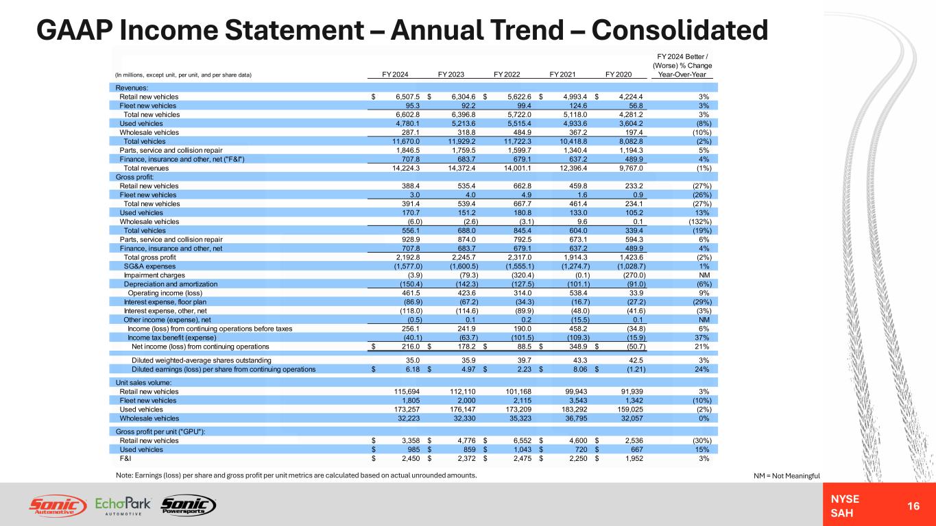 NYSE SAH GAAP Income Statement – Annual Trend – Consolidated 16 NM = Not MeaningfulNote: Earnings (loss) per share and gross profit per unit metrics are calculated based on actual unrounded amounts. FY 2024 Better / (Worse) % Change (In millions, except unit, per unit, and per share data) FY 2024 FY 2023 FY 2022 FY 2021 FY 2020 Year-Over-Year Revenues: Retail new vehicles 6,507.5$ 6,304.6$ 5,622.6$ 4,993.4$ 4,224.4$ 3% Fleet new vehicles 95.3 92.2 99.4 124.6 56.8 3% Total new vehicles 6,602.8 6,396.8 5,722.0 5,118.0 4,281.2 3% Used vehicles 4,780.1 5,213.6 5,515.4 4,933.6 3,604.2 (8%) Wholesale vehicles 287.1 318.8 484.9 367.2 197.4 (10%) Total vehicles 11,670.0 11,929.2 11,722.3 10,418.8 8,082.8 (2%) Parts, service and collision repair 1,846.5 1,759.5 1,599.7 1,340.4 1,194.3 5% Finance, insurance and other, net ("F&I") 707.8 683.7 679.1 637.2 489.9 4% Total revenues 14,224.3 14,372.4 14,001.1 12,396.4 9,767.0 (1%) Gross profit: Retail new vehicles 388.4 535.4 662.8 459.8 233.2 (27%) Fleet new vehicles 3.0 4.0 4.9 1.6 0.9 (26%) Total new vehicles 391.4 539.4 667.7 461.4 234.1 (27%) Used vehicles 170.7 151.2 180.8 133.0 105.2 13% Wholesale vehicles (6.0) (2.6) (3.1) 9.6 0.1 (132%) Total vehicles 556.1 688.0 845.4 604.0 339.4 (19%) Parts, service and collision repair 928.9 874.0 792.5 673.1 594.3 6% Finance, insurance and other, net 707.8 683.7 679.1 637.2 489.9 4% Total gross profit 2,192.8 2,245.7 2,317.0 1,914.3 1,423.6 (2%) SG&A expenses (1,577.0) (1,600.5) (1,555.1) (1,274.7) (1,028.7) 1% Impairment charges (3.9) (79.3) (320.4) (0.1) (270.0) NM Depreciation and amortization (150.4) (142.3) (127.5) (101.1) (91.0) (6%) Operating income (loss) 461.5 423.6 314.0 538.4 33.9 9% Interest expense, floor plan (86.9) (67.2) (34.3) (16.7) (27.2) (29%) Interest expense, other, net (118.0) (114.6) (89.9) (48.0) (41.6) (3%) Other income (expense), net (0.5) 0.1 0.2 (15.5) 0.1 NM Income (loss) from continuing operations before taxes 256.1 241.9 190.0 458.2 (34.8) 6% Income tax benefit (expense) (40.1) (63.7) (101.5) (109.3) (15.9) 37% Net income (loss) from continuing operations 216.0$ 178.2$ 88.5$ 348.9$ (50.7)$ 21% Diluted weighted-average shares outstanding 35.0 35.9 39.7 43.3 42.5 3% Diluted earnings (loss) per share from continuing operations 6.18$ 4.97$ 2.23$ 8.06$ (1.21)$ 24% Unit sales volume: Retail new vehicles 115,694 112,110 101,168 99,943 91,939 3% Fleet new vehicles 1,805 2,000 2,115 3,543 1,342 (10%) Used vehicles 173,257 176,147 173,209 183,292 159,025 (2%) Wholesale vehicles 32,223 32,330 35,323 36,795 32,057 0% Gross profit per unit ("GPU"): Retail new vehicles 3,358$ 4,776$ 6,552$ 4,600$ 2,536$ (30%) Used vehicles 985$ 859$ 1,043$ 720$ 667$ 15% F&I 2,450$ 2,372$ 2,475$ 2,250$ 1,952$ 3%