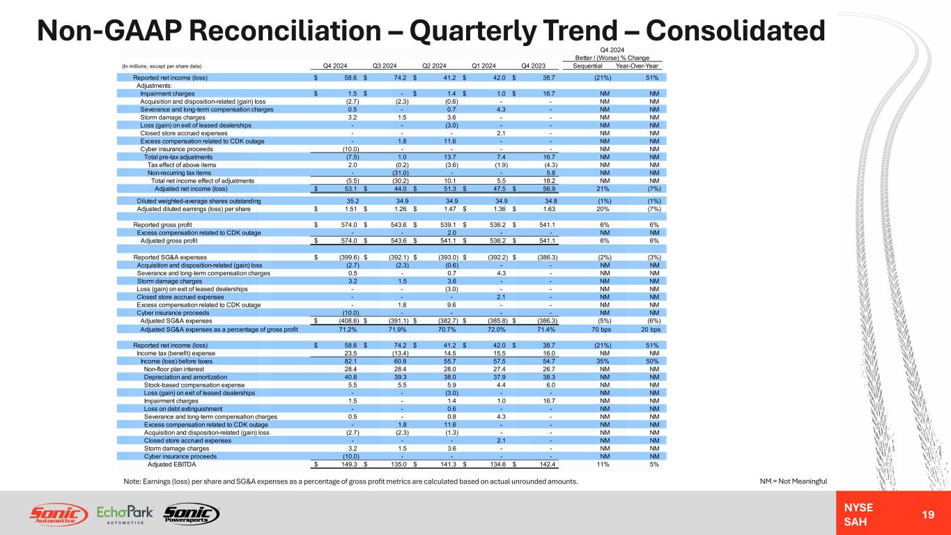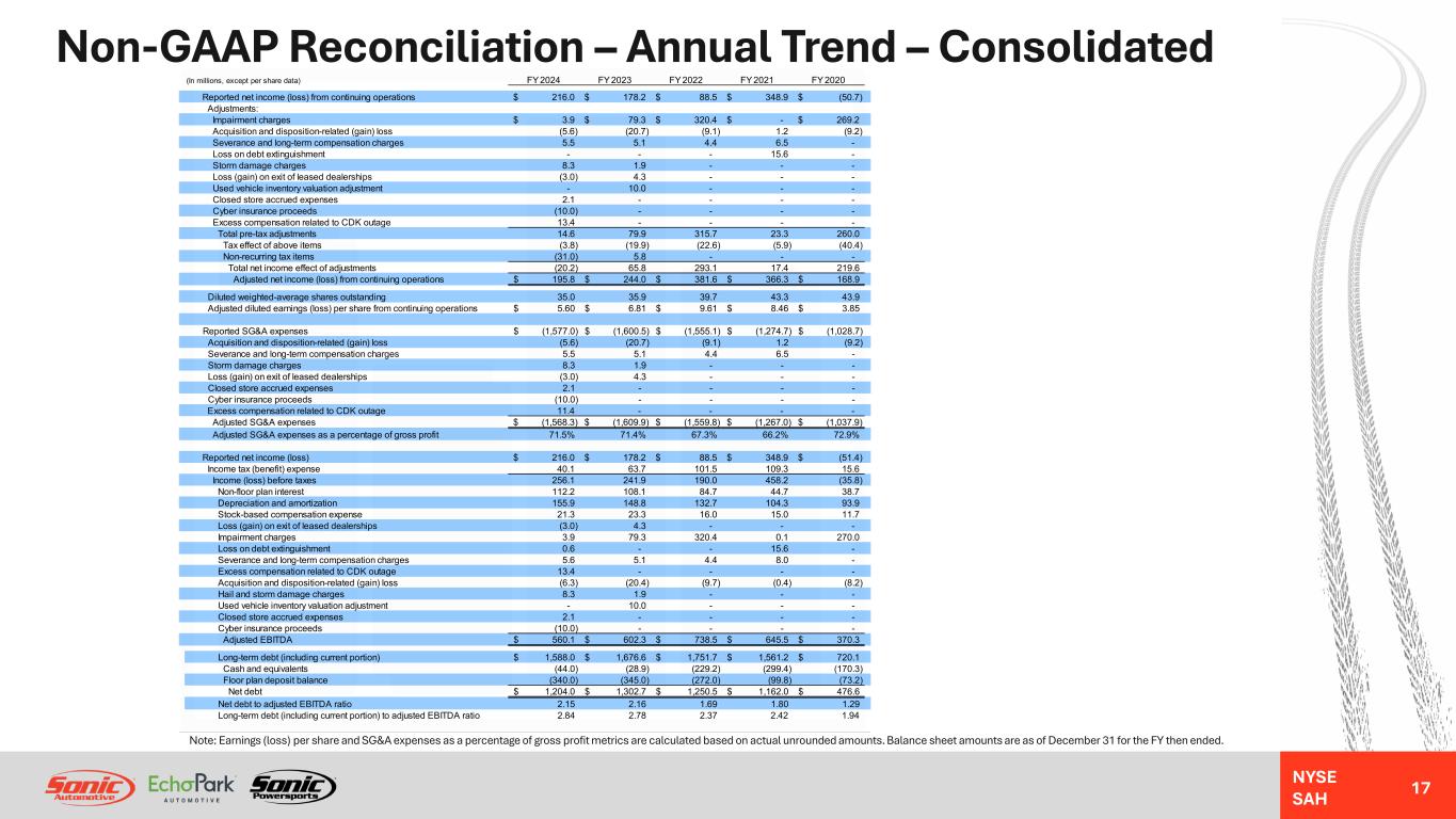 NYSE SAH Non-GAAP Reconciliation – Annual Trend – Consolidated 17 Note: Earnings (loss) per share and SG&A expenses as a percentage of gross profit metrics are calculated based on actual unrounded amounts. Balance sheet amounts are as of December 31 for the FY then ended. (In millions, except per share data) FY 2024 FY 2023 FY 2022 FY 2021 FY 2020 Reported net income (loss) from continuing operations 216.0$ 178.2$ 88.5$ 348.9$ (50.7)$ Adjustments: Impairment charges 3.9$ 79.3$ 320.4$ -$ 269.2$ Acquisition and disposition-related (gain) loss (5.6) (20.7) (9.1) 1.2 (9.2) Severance and long-term compensation charges 5.5 5.1 4.4 6.5 - Loss on debt extinguishment - - - 15.6 - Storm damage charges 8.3 1.9 - - - Loss (gain) on exit of leased dealerships (3.0) 4.3 - - - Used vehicle inventory valuation adjustment - 10.0 - - - Closed store accrued expenses 2.1 - - - - Cyber insurance proceeds (10.0) - - - - Excess compensation related to CDK outage 13.4 - - - - Total pre-tax adjustments 14.6 79.9 315.7 23.3 260.0 Tax effect of above items (3.8) (19.9) (22.6) (5.9) (40.4) Non-recurring tax items (31.0) 5.8 - - - Total net income effect of adjustments (20.2) 65.8 293.1 17.4 219.6 Adjusted net income (loss) from continuing operations 195.8$ 244.0$ 381.6$ 366.3$ 168.9$ Diluted weighted-average shares outstanding 35.0 35.9 39.7 43.3 43.9 Adjusted diluted earnings (loss) per share from continuing operations 5.60$ 6.81$ 9.61$ 8.46$ 3.85$ Reported SG&A expenses (1,577.0)$ (1,600.5)$ (1,555.1)$ (1,274.7)$ (1,028.7)$ Acquisition and disposition-related (gain) loss (5.6) (20.7) (9.1) 1.2 (9.2) Severance and long-term compensation charges 5.5 5.1 4.4 6.5 - Storm damage charges 8.3 1.9 - - - Loss (gain) on exit of leased dealerships (3.0) 4.3 - - - Closed store accrued expenses 2.1 - - - - Cyber insurance proceeds (10.0) - - - - Excess compensation related to CDK outage 11.4 - - - - Adjusted SG&A expenses (1,568.3)$ (1,609.9)$ (1,559.8)$ (1,267.0)$ (1,037.9)$ Adjusted SG&A expenses as a percentage of gross profit 71.5% 71.4% 67.3% 66.2% 72.9% Reported net income (loss) 216.0$ 178.2$ 88.5$ 348.9$ (51.4)$ Income tax (benefit) expense 40.1 63.7 101.5 109.3 15.6 Income (loss) before taxes 256.1 241.9 190.0 458.2 (35.8) Non-floor plan interest 112.2 108.1 84.7 44.7 38.7 Depreciation and amortization 155.9 148.8 132.7 104.3 93.9 Stock-based compensation expense 21.3 23.3 16.0 15.0 11.7 Loss (gain) on exit of leased dealerships (3.0) 4.3 - - - Impairment charges 3.9 79.3 320.4 0.1 270.0 Loss on debt extinguishment 0.6 - - 15.6 - Severance and long-term compensation charges 5.6 5.1 4.4 8.0 - Excess compensation related to CDK outage 13.4 - - - - Acquisition and disposition-related (gain) loss (6.3) (20.4) (9.7) (0.4) (8.2) Hail and storm damage charges 8.3 1.9 - - - Used vehicle inventory valuation adjustment - 10.0 - - - Closed store accrued expenses 2.1 - - - - Cyber insurance proceeds (10.0) - - - - Adjusted EBITDA 560.1$ 602.3$ 738.5$ 645.5$ 370.3$ Long-term debt (including current portion) 1,588.0$ 1,676.6$ 1,751.7$ 1,561.2$ 720.1$ Cash and equivalents (44.0) (28.9) (229.2) (299.4) (170.3) Floor plan deposit balance (340.0) (345.0) (272.0) (99.8) (73.2) Net debt 1,204.0$ 1,302.7$ 1,250.5$ 1,162.0$ 476.6$ Net debt to adjusted EBITDA ratio 2.15 2.16 1.69 1.80 1.29 Long-term debt (including current portion) to adjusted EBITDA ratio 2.84 2.78 2.37 2.42 1.94