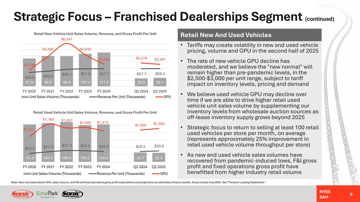 NYSE SAH Strategic Focus – Franchised Dealerships Segment • Manage tariff impact on inventory and pricing strategy to maintain market share • Focus on opportunities to offset normalizing new vehicle gross profit margins through growth in parts and service (Fixed Operations) and finance and insurance (F&I) gross profit • Actively manage new and used vehicle inventory turnover and adapt to electric vehicle (EV) transition • Focus on selling, general and administrative (SG&A) expense control to maintain structural improvement in SG&A leverage as a percent of gross profit • Opportunity to pursue accretive strategic acquisition opportunities as market normalizes Franchised Dealerships Strategy $8.3 $10.1 $11.5 $11.8 $11.9 $2.9 $3.1 $231 $530 $642 $448 $258 $53 $92 $360 $692 $839 $675 $526 $132 $154 FY 2020 FY 2021 FY 2022 FY 2023 FY 2024 Q2 2024 Q2 2025 Total Revenues, Segment Income*, and Adjusted EBITDA* Revenue (Billions) Segment Income* (Millions) Adjusted EBITDA* (Millions) * Refer to appendix for calculation and reconciliation of Segment Income, Adjusted EBITDA and Adjusted SG&A Expenses As % Of Gross Profit (non-GAAP measures). 5 2.3% 1.5% 1.7% 2.0% 2.8% 3.0% 3.2% 45.7% 40.8% 40.2% 42.1% 45.2% 44.3% 44.0% 19.8% 16.0% 16.2% 19.5% 20.4% 20.4% 19.9% 3.8% 2.6% 2.0% 2.0% 2.0% 2.2% 1.8% 71.6% 60.9% 60.1% 65.6% 70.4% 69.9% 68.9% 71.3% 61.0% 59.9% 64.6% 70.9% 72.9% 68.3% FY 2020 FY 2021 FY 2022 FY 2023 FY 2024 Q2 2024 Q2 2025 Reported and Adjusted SG&A Expenses as % of Gross Profit* Advertising* Compensation* Other* Rent* Adjusted SG&A Expenses* Reported SG&A Expenses