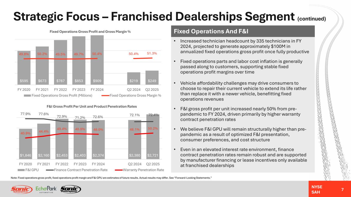 NYSE SAH Strategic Focus – Franchised Dealerships Segment (continued) 6 91.9 99.8 99.4 107.3 111.5 26.5 28.1 $45.9 $49.9 $56.1 $57.9 $57.7 $57.7 $58.4 $2,536 $4,595 $6,591 $4,836 $3,382 $3,579 $3,391 FY 2020 FY 2021 FY 2022 FY 2023 FY 2024 Q2 2024 Q2 2025 Retail New Vehicle Unit Sales Volume, Revenue, and Gross Profit Per Unit Unit Sales Volume (Thousands) Revenue Per Unit (Thousands) GPU 101.9 105.5 108.5 100.2 102.0 25.7 25.0 $23.0 $27.5 $31.3 $30.4 $28.6 $28.5 $29.9 $1,207 $1,784 $1,607 $1,626 $1,473 $1,508 $1,583 FY 2020 FY 2021 FY 2022 FY 2023 FY 2024 Q2 2024 Q2 2025 Retail Used Vehicle Unit Sales Volume, Revenue, and Gross Profit Per Unit Unit Sales Volume (Thousands) Revenue Per Unit (Thousands) GPU Retail New And Used Vehicles • Tariffs may create volatility in new and used vehicle pricing, volume and GPU in the second half of 2025 • The rate of new vehicle GPU decline has moderated, and we believe the "new normal" will remain higher than pre-pandemic levels, in the $2,500-$3,000 per unit range, subject to tariff impact on inventory levels, pricing and demand • We believe used vehicle GPU may decline over time if we are able to drive higher retail used vehicle unit sales volume by supplementing our inventory levels from wholesale auction sources as off-lease inventory supply grows beyond 2025 • Strategic focus to return to selling at least 100 retail used vehicles per store per month, on average (represents approximately 25% improvement in retail used vehicle volume throughput per store) • As new and used vehicle sales volumes have recovered from pandemic-induced lows, F&I gross profit and fixed operations gross profit have benefitted from higher industry retail volume Note: New and used vehicle GPU, sales volume, and F&I and fixed operations gross profit expectations and projections are estimates of future results. Actual results may differ. See “Forward-Looking Statements.”