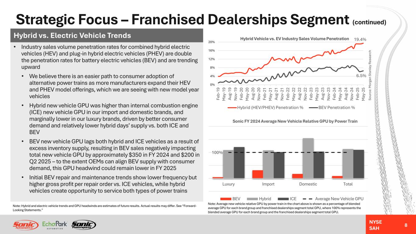 NYSE SAH Strategic Focus – Franchised Dealerships Segment (continued) 7 Fixed Operations And F&I • Increased technician headcount by 335 technicians in FY 2024, projected to generate approximately $100M in annualized fixed operations gross profit once fully productive • Fixed operations parts and labor cost inflation is generally passed along to customers, supporting stable fixed operations profit margins over time • Vehicle affordability challenges may drive consumers to choose to repair their current vehicle to extend its life rather than replace it with a newer vehicle, benefitting fixed operations revenues • F&I gross profit per unit increased nearly 50% from pre- pandemic to FY 2024, driven primarily by higher warranty contract penetration rates • We believe F&I GPU will remain structurally higher than pre- pandemic as a result of optimized F&I presentation, consumer preferences, and cost structure • Even in an elevated interest rate environment, finance contract penetration rates remain robust and are supported by manufacturer financing or lease incentives only available at franchised dealerships $1,846 $2,160 $2,453 $2,403 $2,374 $2,380 $2,721 77.9% 77.6% 72.9% 71.2% 72.6% 72.1% 72.4% 40.9% 44.4% 49.4% 48.9% 48.0% 48.1% 50.2% FY 2020 FY 2021 FY 2022 FY 2023 FY 2024 Q2 2024 Q2 2025 F&I Gross Profit Per Unit and Product Penetration Rates F&I GPU Finance Contract Penetration Rate Warranty Penetration Rate Note: Fixed operations gross profit, fixed operations profit margin and F&I GPU are estimates of future results. Actual results may differ. See “Forward-Looking Statements.” $595 $673 $787 $853 $909 $219 $249 49.8% 50.2% 49.5% 49.7% 50.4% 50.4% 51.3% FY 2020 FY 2021 FY 2022 FY 2023 FY 2024 Q2 2024 Q2 2025 Fixed Operations Gross Profit and Gross Margin % Fixed Operations Gross Profit (Millions) Fixed Operations Gross Margin %