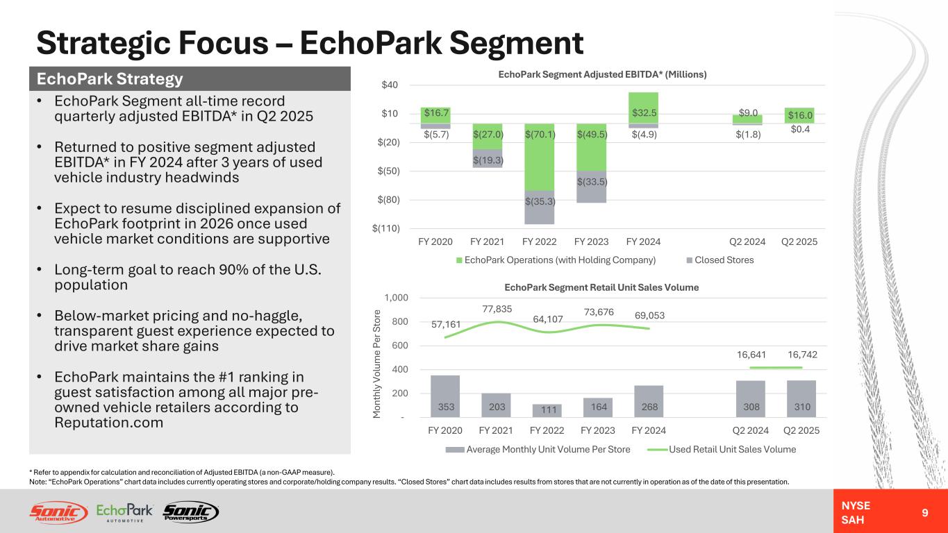 NYSE SAH Strategic Focus – Franchised Dealerships Segment (continued) Hybrid vs. Electric Vehicle Trends • Industry sales volume penetration rates for combined hybrid electric vehicles (HEV) and plug-in hybrid electric vehicles (PHEV) are double the penetration rates for battery electric vehicles (BEV) and are trending upward • We believe there is an easier path to consumer adoption of alternative power trains as more manufacturers expand their HEV and PHEV model offerings, which we are seeing with new model year vehicles • Hybrid new vehicle GPU was higher than internal combustion engine (ICE) new vehicle GPU in our import and domestic brands, and marginally lower in our luxury brands, driven by better consumer demand and relatively lower hybrid days’ supply vs. both ICE and BEV • BEV new vehicle GPU lags both hybrid and ICE vehicles as a result of excess inventory supply, resulting in BEV sales negatively impacting total new vehicle GPU by approximately $350 in FY 2024 and $200 in Q2 2025 – to the extent OEMs can align BEV supply with consumer demand, this GPU headwind could remain lower in FY 2025 • Initial BEV repair and maintenance trends show lower frequency but higher gross profit per repair order vs. ICE vehicles, while hybrid vehicles create opportunity to service both types of power trains 19.4% 6.5% 0% 4% 8% 12% 16% 20% Fe b- 19 M ay -1 9 Au g- 19 N ov -1 9 Fe b- 20 M ay -2 0 Au g- 20 N ov -2 0 Fe b- 21 M ay -2 1 Au g- 21 N ov -2 1 Fe b- 22 M ay -2 2 Au g- 22 N ov -2 2 Fe b- 23 M ay -2 3 Au g- 23 N ov -2 3 Fe b- 24 M ay -2 4 Au g- 24 N ov -2 4 Fe b- 25 M ay -2 5 Hybrid Vehicle vs. EV Industry Sales Volume Penetration Hybrid (HEV/PHEV) Penetration % BEV Penetration % So ur ce : M or ga n St an le y R es ea rc h 8 100% Luxury Import Domestic Total Sonic FY 2024 Average New Vehicle Relative GPU by Power Train BEV Hybrid ICE Average New Vehicle GPU Note: Average new vehicle relative GPU by power train in the chart above is shown as a percentage of blended average GPU for each brand group and franchised dealerships segment total GPU, where 100% represents the blended average GPU for each brand group and the franchised dealerships segment total GPU. Note: Hybrid and electric vehicle trends and GPU headwinds are estimates of future results. Actual results may differ. See “Forward- Looking Statements.”