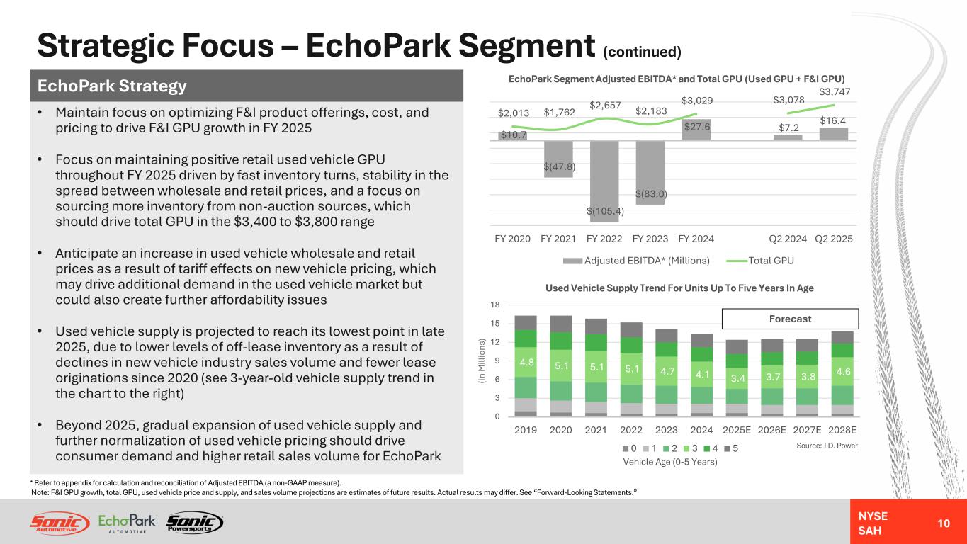 NYSE SAH Strategic Focus – EchoPark Segment • EchoPark Segment all-time record quarterly adjusted EBITDA* in Q2 2025 • Returned to positive segment adjusted EBITDA* in FY 2024 after 3 years of used vehicle industry headwinds • Expect to resume disciplined expansion of EchoPark footprint in 2026 once used vehicle market conditions are supportive • Long-term goal to reach 90% of the U.S. population • Below-market pricing and no-haggle, transparent guest experience expected to drive market share gains • EchoPark maintains the #1 ranking in guest satisfaction among all major pre- owned vehicle retailers according to Reputation.com EchoPark Strategy * Refer to appendix for calculation and reconciliation of Adjusted EBITDA (a non-GAAP measure). Note: “EchoPark Operations” chart data includes currently operating stores and corporate/holding company results. “Closed Stores” chart data includes results from stores that are not currently in operation as of the date of this presentation. $16.7 $(27.0) $(70.1) $(49.5) $32.5 $9.0 $16.0 $(5.7) $(19.3) $(35.3) $(33.5) $(4.9) $(1.8) $0.4 $(110) $(80) $(50) $(20) $10 $40 FY 2020 FY 2021 FY 2022 FY 2023 FY 2024 Q2 2024 Q2 2025 EchoPark Segment Adjusted EBITDA* (Millions) EchoPark Operations (with Holding Company) Closed Stores 353 203 111 164 268 308 310 57,161 77,835 64,107 73,676 69,053 16,641 16,742 - 200 400 600 800 1,000 FY 2020 FY 2021 FY 2022 FY 2023 FY 2024 Q2 2024 Q2 2025 M on th ly V ol um e Pe r S to re EchoPark Segment Retail Unit Sales Volume Average Monthly Unit Volume Per Store Used Retail Unit Sales Volume 9