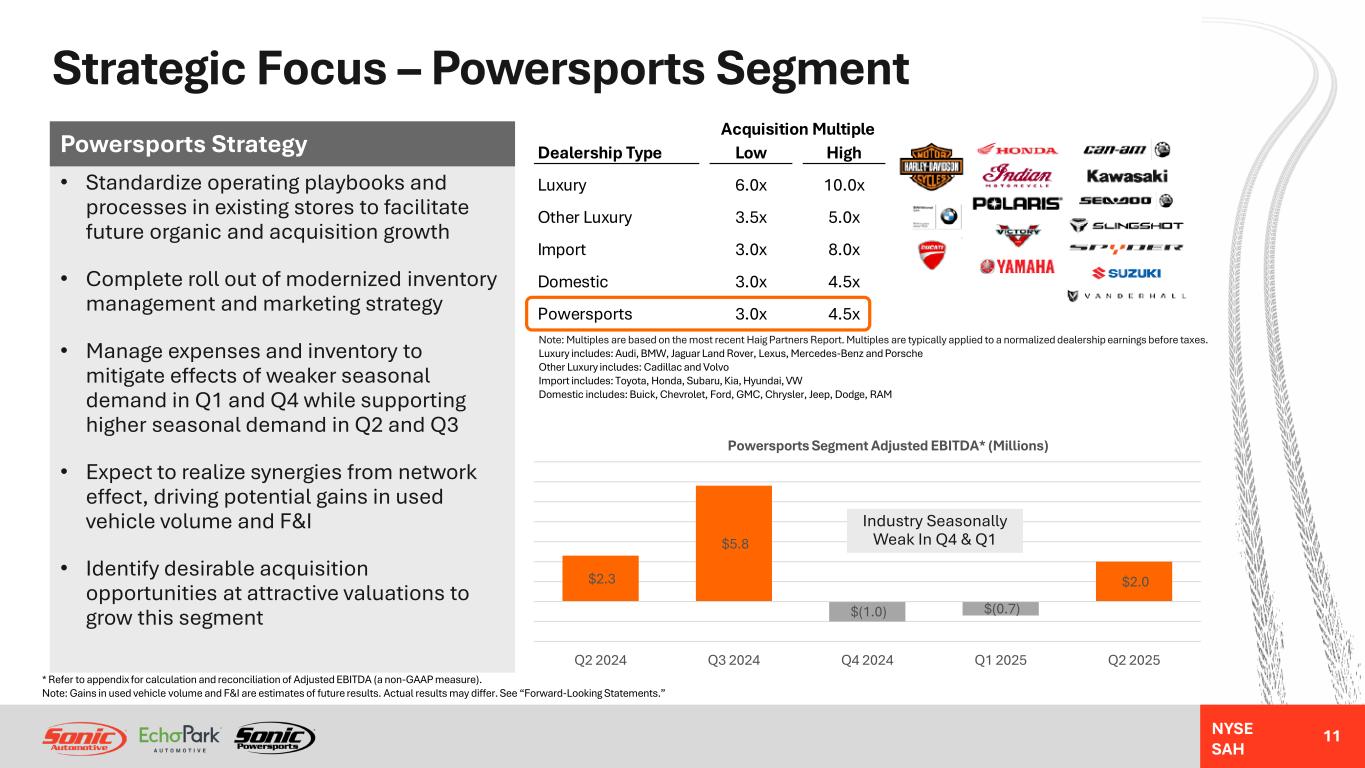 NYSE SAH Strategic Focus – EchoPark Segment (continued) 10 • Maintain focus on optimizing F&I product offerings, cost, and pricing to drive F&I GPU growth in FY 2025 • Focus on maintaining positive retail used vehicle GPU throughout FY 2025 driven by fast inventory turns, stability in the spread between wholesale and retail prices, and a focus on sourcing more inventory from non-auction sources, which should drive total GPU in the $3,400 to $3,800 range • Anticipate an increase in used vehicle wholesale and retail prices as a result of tariff effects on new vehicle pricing, which may drive additional demand in the used vehicle market but could also create further affordability issues • Used vehicle supply is projected to reach its lowest point in late 2025, due to lower levels of off-lease inventory as a result of declines in new vehicle industry sales volume and fewer lease originations since 2020 (see 3-year-old vehicle supply trend in the chart to the right) • Beyond 2025, gradual expansion of used vehicle supply and further normalization of used vehicle pricing should drive consumer demand and higher retail sales volume for EchoPark EchoPark Strategy $10.7 $(47.8) $(105.4) $(83.0) $27.6 $7.2 $16.4 $2,013 $1,762 $2,657 $2,183 $3,029 $3,078 $3,747 FY 2020 FY 2021 FY 2022 FY 2023 FY 2024 Q2 2024 Q2 2025 EchoPark Segment Adjusted EBITDA* and Total GPU (Used GPU + F&I GPU) Adjusted EBITDA* (Millions) Total GPU Source: J.D. Power Vehicle Age (0-5 Years) * Refer to appendix for calculation and reconciliation of Adjusted EBITDA (a non-GAAP measure). Note: F&I GPU growth, total GPU, used vehicle price and supply, and sales volume projections are estimates of future results. Actual results may differ. See “Forward-Looking Statements.” 4.8 5.1 5.1 5.1 4.7 4.1 3.4 3.7 3.8 4.6 0 3 6 9 12 15 18 2019 2020 2021 2022 2023 2024 2025E 2026E 2027E 2028E (In M ill io ns ) Used Vehicle Supply Trend For Units Up To Five Years In Age 0 1 2 3 4 5 Forecast