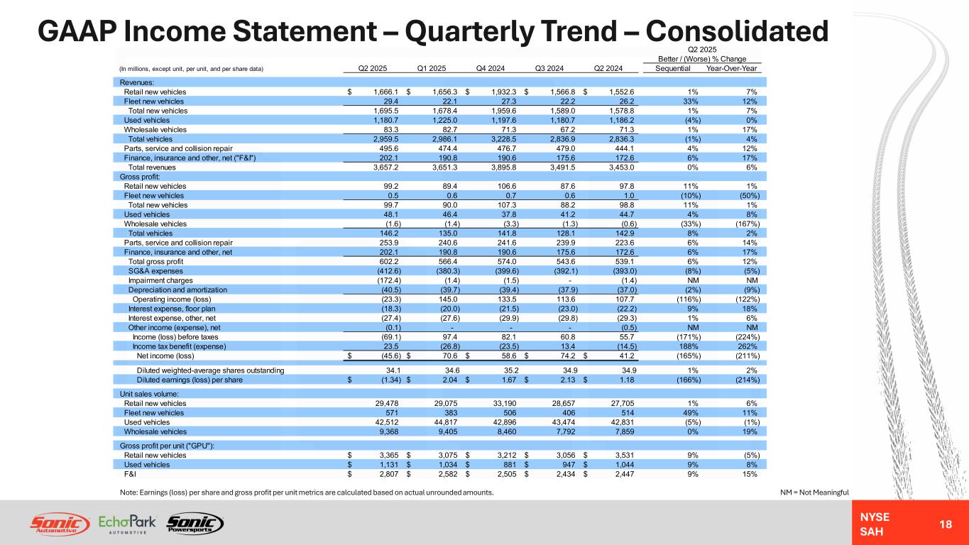 NYSE SAH Non-GAAP Reconciliation – Annual Trend – Consolidated 17 Note: Earnings (loss) per share and SG&A expenses as a percentage of gross profit metrics are calculated based on actual unrounded amounts. Balance sheet amounts are as of December 31 for the FY then ended, and as of June 30, 2025 for the LTM Q2 2025 period. (In millions, except per share data) LTM Q2 2025 FY 2024 FY 2023 FY 2022 FY 2021 FY 2020 Reported net income (loss) from continuing operations 216.0$ 178.2$ 88.5$ 348.9$ (50.7)$ Adjustments: Impairment charges 3.9$ 79.3$ 320.4$ -$ 269.2$ Acquisition and disposition-related (gain) loss (5.6) (20.7) (9.1) 1.2 (9.2) Severance and long-term compensation charges 5.5 5.1 4.4 6.5 - Loss on debt extinguishment - - - 15.6 - Storm damage charges 8.3 1.9 - - - Loss (gain) on exit of leased dealerships (3.0) 4.3 - - - Used vehicle inventory valuation adjustment - 10.0 - - - Closed store accrued expenses 2.1 - - - - Cyber insurance proceeds (10.0) - - - - Excess compensation related to CDK outage 13.4 - - - - Total pre-tax adjustments 14.6 79.9 315.7 23.3 260.0 Tax effect of above items (3.8) (19.9) (22.6) (5.9) (40.4) Non-recurring tax items (31.0) 5.8 - - - Total net income effect of adjustments (20.2) 65.8 293.1 17.4 219.6 Adjusted net income (loss) from continuing operations 195.8$ 244.0$ 381.6$ 366.3$ 168.9$ Diluted weighted-average shares outstanding 35.0 35.9 39.7 43.3 43.9 Adjusted diluted earnings (loss) per share from continuing operations 5.60$ 6.81$ 9.61$ 8.46$ 3.85$ Reported gross profit 2,192.8$ 2,245.7$ 2,317.0$ 1,914.3$ 1,423.6$ Excess compensation related to CDK outage 2.0 - - - - Adjusted gross profit 2,194.8$ 2,245.7$ 2,317.0$ 1,914.3$ 1,423.6$ Reported SG&A expenses (1,577.0)$ (1,600.5)$ (1,555.1)$ (1,274.7)$ (1,028.7)$ Acquisition and disposition-related (gain) loss (5.6) (20.7) (9.1) 1.2 (9.2) Severance and long-term compensation charges 5.5 5.1 4.4 6.5 - Storm damage charges 8.3 1.9 - - - Loss (gain) on exit of leased dealerships (3.0) 4.3 - - - Closed store accrued expenses 2.1 - - - - Cyber insurance proceeds (10.0) - - - - Excess compensation related to CDK outage 11.4 - - - - Adjusted SG&A expenses (1,568.3)$ (1,609.9)$ (1,559.8)$ (1,267.0)$ (1,037.9)$ Adjusted SG&A expenses as a percentage of gross profit 71.5% 71.4% 67.3% 66.2% 72.9% Reported net income (loss) 153.3$ 216.0$ 178.2$ 88.5$ 348.9$ (51.4)$ Income tax (benefit) expense 17.9 40.1 63.7 101.5 109.3 15.6 Income (loss) before taxes 171.2 256.1 241.9 190.0 458.2 (35.8) Non-floor plan interest 108.7 112.2 108.1 84.7 44.7 38.7 Depreciation and amortization 163.6 155.9 148.8 132.7 104.3 93.9 Stock-based compensation expense 22.5 21.3 23.3 16.0 15.0 11.7 Loss (gain) on exit of leased dealerships - (3.0) 4.3 - - - Impairment charges 175.3 3.9 79.3 320.4 0.1 270.0 Loss on debt extinguishment - 0.6 - - 15.6 - Severance and long-term compensation charges 0.5 5.6 5.1 4.4 8.0 - Excess compensation related to CDK outage 1.8 13.4 - - - - Acquisition and disposition-related (gain) loss (2.4) (6.3) (20.4) (9.7) (0.4) (8.2) Hail and storm damage charges 9.7 8.3 1.9 - - - Used vehicle inventory valuation adjustment - - 10.0 - - - Closed store accrued expenses - 2.1 - - - - Cyber insurance proceeds (50.0) (10.0) - - - - Adjusted EBITDA 600.9$ 560.1$ 602.3$ 738.5$ 645.5$ 370.3$ Long-term debt (including current portion) 1,520.4$ 1,588.0$ 1,676.6$ 1,751.7$ 1,561.2$ 720.1$ Cash and equivalents (110.4) (44.0) (28.9) (229.2) (299.4) (170.3) Floor plan deposit balance (100.0) (340.0) (345.0) (272.0) (99.8) (73.2) Net debt 1,310.0$ 1,204.0$ 1,302.7$ 1,250.5$ 1,162.0$ 476.6$ Net debt to adjusted EBITDA ratio 2.18 2.15 2.16 1.69 1.80 1.29 Long-term debt (including current portion) to adjusted EBITDA ratio 2.53 2.84 2.78 2.37 2.42 1.94