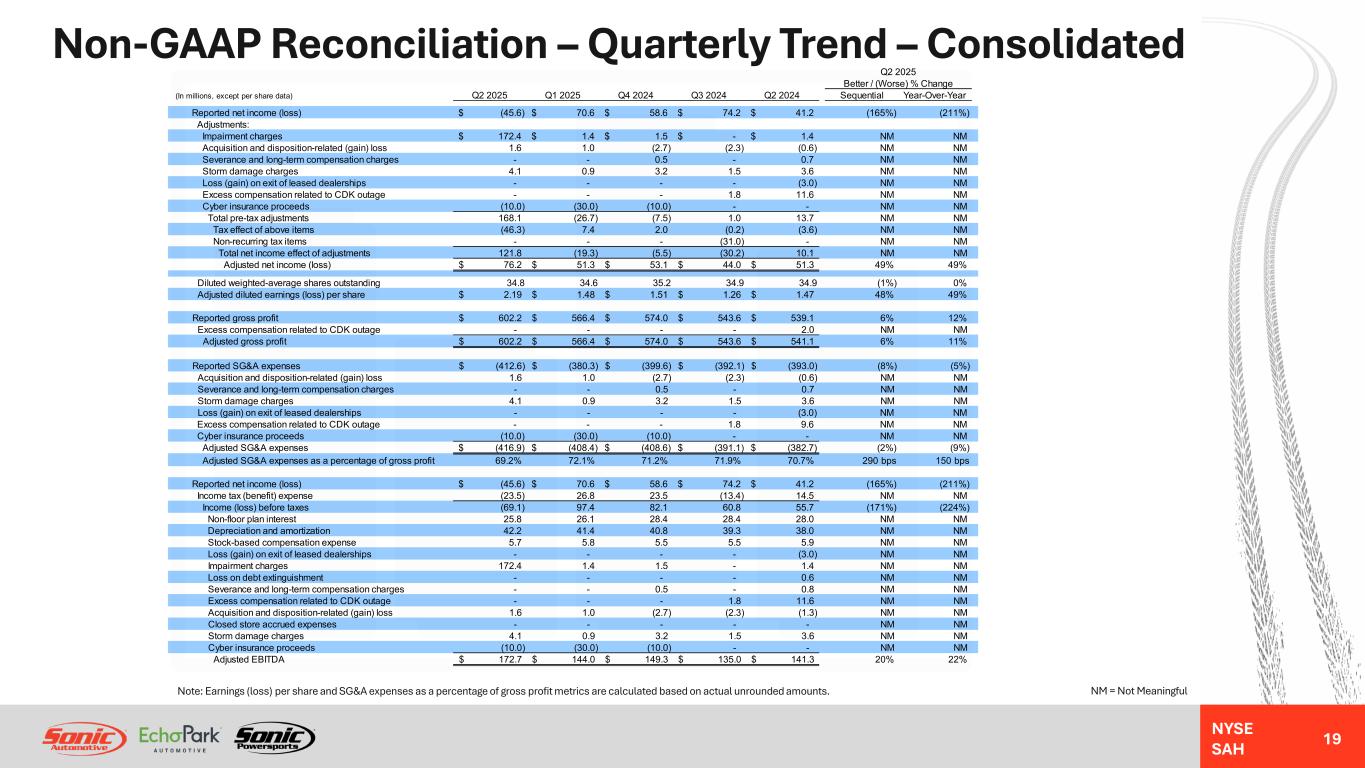 NYSE SAH GAAP Income Statement – Quarterly Trend – Consolidated 18 NM = Not MeaningfulNote: Earnings (loss) per share and gross profit per unit metrics are calculated based on actual unrounded amounts. Q2 2025 Better / (Worse) % Change (In millions, except unit, per unit, and per share data) Q2 2025 Q1 2025 Q4 2024 Q3 2024 Q2 2024 Sequential Year-Over-Year Revenues: Retail new vehicles 1,666.1$ 1,656.3$ 1,932.3$ 1,566.8$ 1,552.6$ 1% 7% Fleet new vehicles 29.4 22.1 27.3 22.2 26.2 33% 12% Total new vehicles 1,695.5 1,678.4 1,959.6 1,589.0 1,578.8 1% 7% Used vehicles 1,180.7 1,225.0 1,197.6 1,180.7 1,186.2 (4%) 0% Wholesale vehicles 83.3 82.7 71.3 67.2 71.3 1% 17% Total vehicles 2,959.5 2,986.1 3,228.5 2,836.9 2,836.3 (1%) 4% Parts, service and collision repair 495.6 474.4 476.7 479.0 444.1 4% 12% Finance, insurance and other, net ("F&I") 202.1 190.8 190.6 175.6 172.6 6% 17% Total revenues 3,657.2 3,651.3 3,895.8 3,491.5 3,453.0 0% 6% Gross profit: Retail new vehicles 99.2 89.4 106.6 87.6 97.8 11% 1% Fleet new vehicles 0.5 0.6 0.7 0.6 1.0 (10%) (50%) Total new vehicles 99.7 90.0 107.3 88.2 98.8 11% 1% Used vehicles 48.1 46.4 37.8 41.2 44.7 4% 8% Wholesale vehicles (1.6) (1.4) (3.3) (1.3) (0.6) (33%) (167%) Total vehicles 146.2 135.0 141.8 128.1 142.9 8% 2% Parts, service and collision repair 253.9 240.6 241.6 239.9 223.6 6% 14% Finance, insurance and other, net 202.1 190.8 190.6 175.6 172.6 6% 17% Total gross profit 602.2 566.4 574.0 543.6 539.1 6% 12% SG&A expenses (412.6) (380.3) (399.6) (392.1) (393.0) (8%) (5%) Impairment charges (172.4) (1.4) (1.5) - (1.4) NM NM Depreciation and amortization (40.5) (39.7) (39.4) (37.9) (37.0) (2%) (9%) Operating income (loss) (23.3) 145.0 133.5 113.6 107.7 (116%) (122%) Interest expense, floor plan (18.3) (20.0) (21.5) (23.0) (22.2) 9% 18% Interest expense, other, net (27.4) (27.6) (29.9) (29.8) (29.3) 1% 6% Other income (expense), net (0.1) - - - (0.5) NM NM Income (loss) before taxes (69.1) 97.4 82.1 60.8 55.7 (171%) (224%) Income tax benefit (expense) 23.5 (26.8) (23.5) 13.4 (14.5) 188% 262% Net income (loss) (45.6)$ 70.6$ 58.6$ 74.2$ 41.2$ (165%) (211%) Diluted weighted-average shares outstanding 34.1 34.6 35.2 34.9 34.9 1% 2% Diluted earnings (loss) per share (1.34)$ 2.04$ 1.67$ 2.13$ 1.18$ (166%) (214%) Unit sales volume: Retail new vehicles 29,478 29,075 33,190 28,657 27,705 1% 6% Fleet new vehicles 571 383 506 406 514 49% 11% Used vehicles 42,512 44,817 42,896 43,474 42,831 (5%) (1%) Wholesale vehicles 9,368 9,405 8,460 7,792 7,859 0% 19% Gross profit per unit ("GPU"): Retail new vehicles 3,365$ 3,075$ 3,212$ 3,056$ 3,531$ 9% (5%) Used vehicles 1,131$ 1,034$ 881$ 947$ 1,044$ 9% 8% F&I 2,807$ 2,582$ 2,505$ 2,434$ 2,447$ 9% 15%
