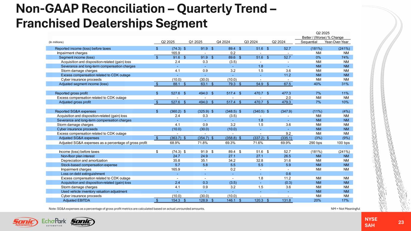 NYSE SAH GAAP Income Statement – Quarterly Trend – Franchised Dealerships Segment 22 NM = Not MeaningfulNote: Gross profit per unit metrics are calculated based on actual unrounded amounts. Q2 2025 Better / (Worse) % Change (In millions, except unit and per unit data) Q2 2025 Q1 2025 Q4 2024 Q3 2024 Q2 2024 Sequential Year-Over-Year Revenues: Retail new vehicles 1,639.1$ 1,636.9$ 1,914.8$ 1,539.9$ 1,530.9$ 0% 7% Fleet new vehicles 29.5 22.1 27.2 22.2 26.2 34% 13% Total new vehicles 1,668.6 1,659.0 1,942.0 1,562.1 1,557.1 1% 7% Used vehicles 744.9 745.6 757.0 701.4 732.1 0% 2% Wholesale vehicles 57.8 54.6 49.8 42.4 48.4 6% 19% Total vehicles 2,471.3 2,459.2 2,748.8 2,305.9 2,337.6 0% 6% Parts, service and collision repair 484.9 467.4 469.7 458.9 434.4 4% 12% Finance, insurance and other, net ("F&I") 144.3 130.6 140.5 122.4 124.2 11% 16% Total revenues 3,100.5 3,057.2 3,359.0 2,887.2 2,896.2 1% 7% Gross profit: Retail new vehicles 95.2 86.7 104.4 83.5 94.9 10% 0% Fleet new vehicles 0.6 0.6 0.7 0.6 1.0 9% (40%) Total new vehicles 95.8 87.3 105.1 84.1 95.9 10% 0% Used vehicles 39.5 39.9 36.0 34.6 38.7 (1%) 2% Wholesale vehicles (0.9) (1.0) (2.7) (1.1) (0.5) 4% (80%) Total vehicles 134.4 126.2 138.4 117.6 134.1 6% 0% Parts, service and collision repair 248.9 237.2 238.5 230.7 219.0 5% 14% Finance, insurance and other, net 144.3 130.6 140.5 122.4 124.2 11% 16% Total gross profit 527.6 494.0 517.4 470.7 477.3 7% 11% SG&A expenses (360.2) (325.9) (348.5) (340.5) (347.9) (11%) (4%) Impairment charges (165.9) - (0.2) - - NM NM Depreciation and amortization (34.1) (33.4) (32.7) (31.5) (30.4) (2%) (12%) Operating income (loss) (32.6) 134.7 136.0 98.7 99.0 (124%) (133%) Interest expense, floor plan (15.3) (16.3) (18.0) (18.6) (18.0) 6% 15% Interest expense, other, net (26.3) (26.6) (28.6) (28.5) (27.8) 1% 5% Other income (expense), net (0.1) 0.1 - - (0.5) NM NM Income (loss) before taxes (74.3)$ 91.9$ 89.4$ 51.6$ 52.7$ (181%) (241%) Unit sales volume: Retail new vehicles 28,084 28,082 32,250 27,391 26,512 0% 6% Fleet new vehicles 571 383 506 406 514 49% 11% Used vehicles 24,953 25,441 25,702 24,940 25,668 (2%) (3%) Wholesale vehicles 6,213 6,195 5,692 4,973 5,248 0% 18% Gross profit per unit ("GPU"): Retail new vehicles 3,391$ 3,089$ 3,238$ 3,047$ 3,579$ 10% (5%) Used vehicles 1,583$ 1,568$ 1,401$ 1,386$ 1,508$ 1% 5% F&I 2,721$ 2,439$ 2,424$ 2,340$ 2,380$ 12% 14%
