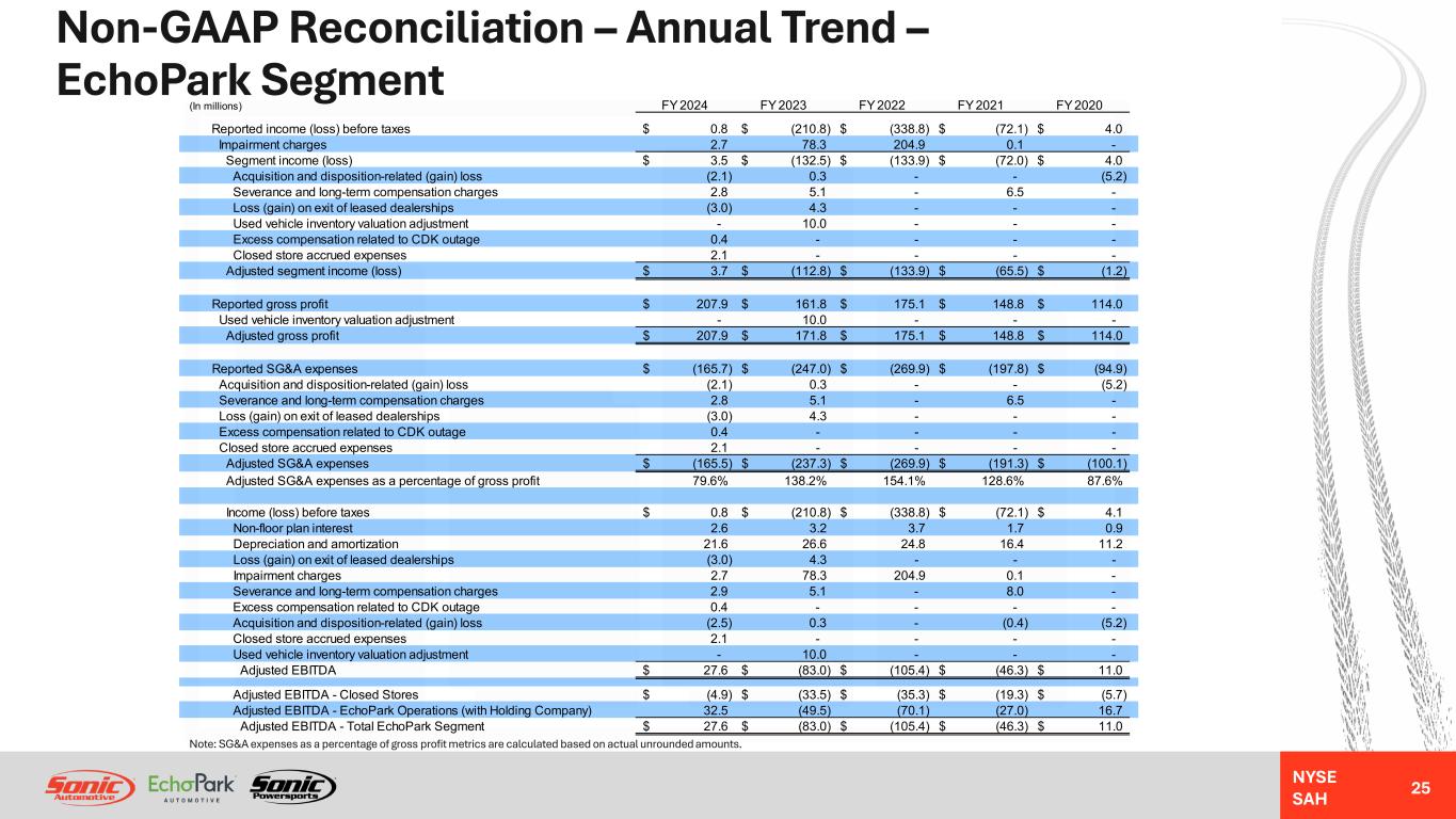 NYSE SAH GAAP Income Statement – Annual Trend – EchoPark Segment 24 NM = Not MeaningfulNote: Gross profit per unit metrics are calculated based on actual unrounded amounts. FY 2024 Better / (Worse) % Change (In millions, except unit, per unit, and per share data) FY 2024 FY 2023 FY 2022 FY 2021 FY 2020 Year-Over-Year Revenues: Total new vehicles -$ 1.0$ 9.2$ 9.0$ -$ (100%) Used vehicles 1,838.0 2,143.8 2,116.8 2,032.6 1,258.2 (14%) Wholesale vehicles 95.8 111.7 227.0 92.9 18.2 (14%) Total vehicles 1,933.8 2,256.5 2,353.0 2,134.5 1,276.4 (14%) Finance, insurance and other, net ("F&I") 194.0 177.9 166.4 193.7 132.1 9% Total revenues 2,127.8 2,434.4 2,463.0 2,345.3 1,419.0 (13%) Gross profit: Total new vehicles - 0.1 1.1 1.1 - (100%) Used vehicles 15.2 (17.1) 4.4 (55.2) (18.0) 189% Wholesale vehicles (1.3) 0.9 4.2 7.4 (0.2) (251%) Total vehicles 13.9 (16.1) 9.7 (46.7) (18.2) 186% Finance, insurance and other, net 194.0 177.9 166.4 193.7 132.1 9% Total gross profit 207.9 161.8 175.1 148.8 114.0 29% SG&A expenses (165.7) (247.0) (269.9) (197.8) (94.9) 33% Impairment charges (2.7) (78.3) (204.9) (0.1) - NM Depreciation and amortization (21.8) (26.6) (24.6) (16.3) (11.0) 18% Operating income (loss) 17.7 (190.1) (324.3) (65.4) 8.1 109% Interest expense, floor plan (14.2) (17.4) (10.6) (5.0) (3.2) 18% Interest expense, other, net (2.7) (3.2) (3.9) (1.7) (0.9) 16% Other income (expense), net - (0.1) - - - NM Income (loss) before taxes 0.8$ (210.8)$ (338.8)$ (72.1)$ 4.0$ 100% Unit sales volume: Retail new vehicles - 11 152 128 - (100%) Used vehicles 69,053 73,676 64,107 77,835 57,161 (6%) Wholesale vehicles 11,059 11,512 11,236 11,667 7,178 (4%) Gross profit per unit ("GPU"): Retail new vehicles N/A 6,934$ 7,510$ 8,303$ N/A NM Total used vehicle and F&I 3,029$ 2,183$ 2,657$ 1,762$ 2,013$ 39%