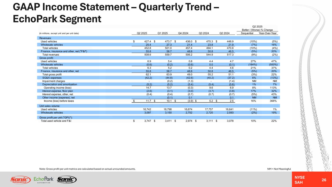 NYSE SAH Non-GAAP Reconciliation – Annual Trend – EchoPark Segment 25 Note: SG&A expenses as a percentage of gross profit metrics are calculated based on actual unrounded amounts. (In millions) FY 2024 FY 2023 FY 2022 FY 2021 FY 2020 Reported income (loss) before taxes 0.8$ (210.8)$ (338.8)$ (72.1)$ 4.0$ Impairment charges 2.7 78.3 204.9 0.1 - Segment income (loss) 3.5$ (132.5)$ (133.9)$ (72.0)$ 4.0$ Acquisition and disposition-related (gain) loss (2.1) 0.3 - - (5.2) Severance and long-term compensation charges 2.8 5.1 - 6.5 - Loss (gain) on exit of leased dealerships (3.0) 4.3 - - - Used vehicle inventory valuation adjustment - 10.0 - - - Excess compensation related to CDK outage 0.4 - - - - Closed store accrued expenses 2.1 - - - - Adjusted segment income (loss) 3.7$ (112.8)$ (133.9)$ (65.5)$ (1.2)$ Reported gross profit 207.9$ 161.8$ 175.1$ 148.8$ 114.0$ Used vehicle inventory valuation adjustment - 10.0 - - - Adjusted gross profit 207.9$ 171.8$ 175.1$ 148.8$ 114.0$ Reported SG&A expenses (165.7)$ (247.0)$ (269.9)$ (197.8)$ (94.9)$ Acquisition and disposition-related (gain) loss (2.1) 0.3 - - (5.2) Severance and long-term compensation charges 2.8 5.1 - 6.5 - Loss (gain) on exit of leased dealerships (3.0) 4.3 - - - Excess compensation related to CDK outage 0.4 - - - - Closed store accrued expenses 2.1 - - - - Adjusted SG&A expenses (165.5)$ (237.3)$ (269.9)$ (191.3)$ (100.1)$ Adjusted SG&A expenses as a percentage of gross profit 79.6% 138.2% 154.1% 128.6% 87.6% Income (loss) before taxes 0.8$ (210.8)$ (338.8)$ (72.1)$ 4.1$ Non-floor plan interest 2.6 3.2 3.7 1.7 0.9 Depreciation and amortization 21.6 26.6 24.8 16.4 11.2 Loss (gain) on exit of leased dealerships (3.0) 4.3 - - - Impairment charges 2.7 78.3 204.9 0.1 - Severance and long-term compensation charges 2.9 5.1 - 8.0 - Excess compensation related to CDK outage 0.4 - - - - Acquisition and disposition-related (gain) loss (2.5) 0.3 - (0.4) (5.2) Closed store accrued expenses 2.1 - - - - Used vehicle inventory valuation adjustment - 10.0 - - - Adjusted EBITDA 27.6$ (83.0)$ (105.4)$ (46.3)$ 11.0$ Adjusted EBITDA - Closed Stores (4.9)$ (33.5)$ (35.3)$ (19.3)$ (5.7)$ Adjusted EBITDA - EchoPark Operations (with Holding Company) 32.5 (49.5) (70.1) (27.0) 16.7 Adjusted EBITDA - Total EchoPark Segment 27.6$ (83.0)$ (105.4)$ (46.3)$ 11.0$