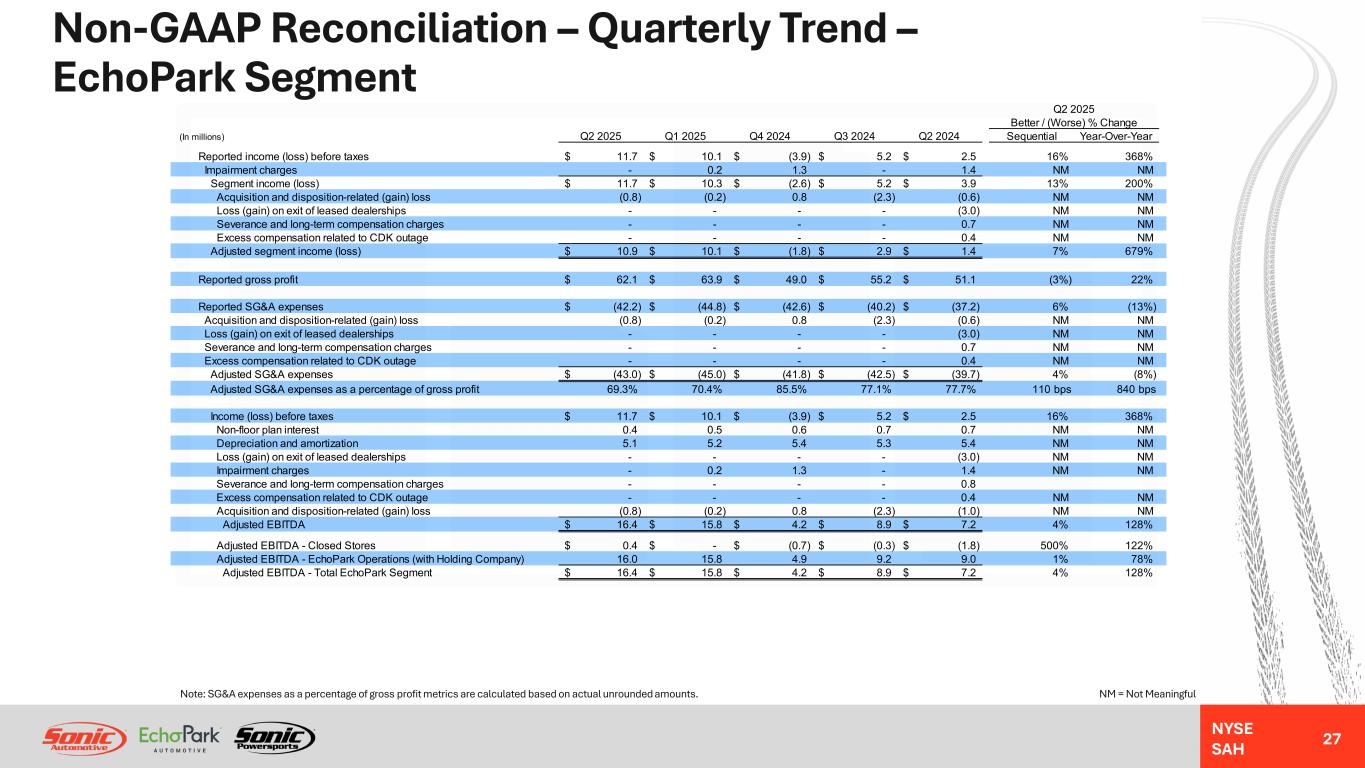 NYSE SAH GAAP Income Statement – Quarterly Trend – EchoPark Segment 26 NM = Not MeaningfulNote: Gross profit per unit metrics are calculated based on actual unrounded amounts. Q2 2025 Better / (Worse) % Change (In millions, except unit and per unit data) Q2 2025 Q1 2025 Q4 2024 Q3 2024 Q2 2024 Sequential Year-Over-Year Revenues: Used vehicles 427.4$ 473.7$ 436.0$ 470.3$ 448.9$ (10%) (5%) Wholesale vehicles 25.4 27.3 21.4 23.8 21.9 (7%) 16% Total vehicles 452.8 501.0 457.4 494.1 470.8 (10%) (4%) Finance, insurance and other, net ("F&I") 55.8 58.7 48.8 50.8 46.5 (5%) 20% Total revenues 508.6 559.7 506.2 544.9 517.3 (9%) (2%) Gross profit: Used vehicles 6.9 5.4 0.8 4.4 4.7 27% 47% Wholesale vehicles (0.6) (0.2) (0.6) 0.0 (0.1) (184%) (500%) Total vehicles 6.3 5.2 0.2 4.4 4.6 21% 37% Finance, insurance and other, net 55.8 58.7 48.8 50.8 46.5 (5%) 20% Total gross profit 62.1 63.9 49.0 55.2 51.1 (3%) 22% SG&A expenses (42.2) (44.8) (42.6) (40.2) (37.2) 6% (13%) Impairment charges - (0.2) (1.3) - (1.4) NM NM Depreciation and amortization (5.2) (5.2) (5.4) (5.4) (5.6) 1% 7% Operating income (loss) 14.7 13.7 (0.3) 9.6 6.9 8% 113% Interest expense, floor plan (2.6) (3.1) (3.0) (3.7) (3.8) 17% 32% Interest expense, other, net (0.4) (0.4) (0.7) (0.7) (0.7) (5%) 43% Other income (expense), net - (0.1) 0.1 - 0.1 NM NM Income (loss) before taxes 11.7$ 10.1$ (3.9)$ 5.2$ 2.5$ 16% 368% Unit sales volume: Used vehicles 16,742 18,798 16,674 17,757 16,641 (11%) 1% Wholesale vehicles 3,097 3,150 2,752 2,720 2,593 (2%) 19% Gross profit per unit ("GPU"): Total used vehicle and F&I 3,747$ 3,411$ 2,974$ 3,111$ 3,078$ 10% 22%