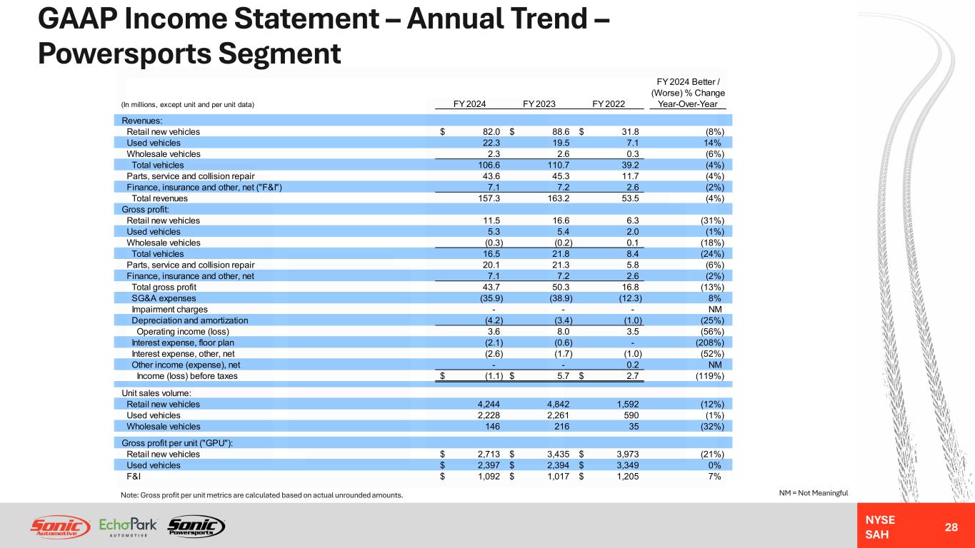 NYSE SAH Non-GAAP Reconciliation – Quarterly Trend – EchoPark Segment 27 NM = Not MeaningfulNote: SG&A expenses as a percentage of gross profit metrics are calculated based on actual unrounded amounts. Q2 2025 Better / (Worse) % Change (In millions) Q2 2025 Q1 2025 Q4 2024 Q3 2024 Q2 2024 Sequential Year-Over-Year Reported income (loss) before taxes 11.7$ 10.1$ (3.9)$ 5.2$ 2.5$ 16% 368% Impairment charges - 0.2 1.3 - 1.4 NM NM Segment income (loss) 11.7$ 10.3$ (2.6)$ 5.2$ 3.9$ 13% 200% Acquisition and disposition-related (gain) loss (0.8) (0.2) 0.8 (2.3) (0.6) NM NM Loss (gain) on exit of leased dealerships - - - - (3.0) NM NM Severance and long-term compensation charges - - - - 0.7 NM NM Excess compensation related to CDK outage - - - - 0.4 NM NM Adjusted segment income (loss) 10.9$ 10.1$ (1.8)$ 2.9$ 1.4$ 7% 679% Reported gross profit 62.1$ 63.9$ 49.0$ 55.2$ 51.1$ (3%) 22% Reported SG&A expenses (42.2)$ (44.8)$ (42.6)$ (40.2)$ (37.2)$ 6% (13%) Acquisition and disposition-related (gain) loss (0.8) (0.2) 0.8 (2.3) (0.6) NM NM Loss (gain) on exit of leased dealerships - - - - (3.0) NM NM Severance and long-term compensation charges - - - - 0.7 NM NM Excess compensation related to CDK outage - - - - 0.4 NM NM Adjusted SG&A expenses (43.0)$ (45.0)$ (41.8)$ (42.5)$ (39.7)$ 4% (8%) Adjusted SG&A expenses as a percentage of gross profit 69.3% 70.4% 85.5% 77.1% 77.7% 110 bps 840 bps Income (loss) before taxes 11.7$ 10.1$ (3.9)$ 5.2$ 2.5$ 16% 368% Non-floor plan interest 0.4 0.5 0.6 0.7 0.7 NM NM Depreciation and amortization 5.1 5.2 5.4 5.3 5.4 NM NM Loss (gain) on exit of leased dealerships - - - - (3.0) NM NM Impairment charges - 0.2 1.3 - 1.4 NM NM Severance and long-term compensation charges - - - - 0.8 Excess compensation related to CDK outage - - - - 0.4 NM NM Acquisition and disposition-related (gain) loss (0.8) (0.2) 0.8 (2.3) (1.0) NM NM Adjusted EBITDA 16.4$ 15.8$ 4.2$ 8.9$ 7.2$ 4% 128% Adjusted EBITDA - Closed Stores 0.4$ -$ (0.7)$ (0.3)$ (1.8)$ 500% 122% Adjusted EBITDA - EchoPark Operations (with Holding Company) 16.0 15.8 4.9 9.2 9.0 1% 78% Adjusted EBITDA - Total EchoPark Segment 16.4$ 15.8$ 4.2$ 8.9$ 7.2$ 4% 128%