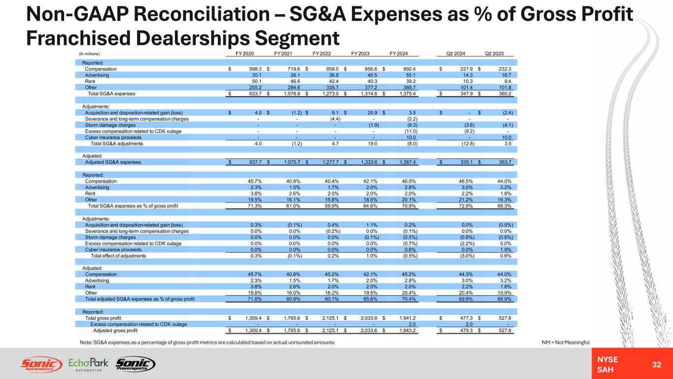 NYSE SAH Non-GAAP Reconciliation – Quarterly Trend – Powersports Segment 31 NM = Not MeaningfulNote: SG&A expenses as a percentage of gross profit metrics are calculated based on actual unrounded amounts. Q2 2025 Better / (Worse) % Change (In millions) Q2 2025 Q1 2025 Q4 2024 Q3 2024 Q2 2024 Sequential Year-Over-Year Reported income (loss) before taxes (6.5)$ (4.6)$ (3.4)$ 4.0$ 0.5$ (40%) (1400%) Impairment charges 6.5 1.1 - - - NM NM Segment income (loss) -$ (3.5)$ (3.4)$ 4.0$ 0.5$ 100% (100%) Long-term compensation charges - - 0.5 - - NM NM Acquisition and disposition-related (gain) loss - 0.9 - - - NM NM Adjusted segment income (loss) -$ (2.6)$ (2.9)$ 4.0$ 0.5$ 528% 1200% Reported gross profit 12.5$ 8.5$ 7.5$ 17.7$ 10.7$ 46% 17% Reported SG&A expenses (10.2)$ (9.6)$ (8.5)$ (11.3)$ (7.9)$ (6%) (29%) Long-term compensation charges - - 0.5 - - NM NM Acquisition and disposition-related (gain) loss - 0.9 - - - NM NM Adjusted SG&A expenses (10.2)$ (8.7)$ (8.0)$ (11.3)$ (7.9)$ (17%) (28%) Adjusted SG&A expenses as a percentage of gross profit 81.1% 102.0% 106.6% 63.7% 73.7% 2,090 bps (740) bps Income (loss) before taxes (6.5)$ (4.6)$ (3.4)$ 4.0$ 0.5$ (40%) (1400%) Non-floor plan interest 0.7 0.7 0.7 0.6 0.8 NM NM Depreciation and amortization 1.3 1.2 1.2 1.2 1.0 NM NM Impairment charges 6.5 1.1 - - - NM NM Long-term compensation charges - - 0.5 - - NM NM Acquisition and disposition-related (gain) loss - 0.9 - - - NM NM Adjusted EBITDA 2.0$ (0.7)$ (1.0)$ 5.8$ 2.3$ (386%) (13%)