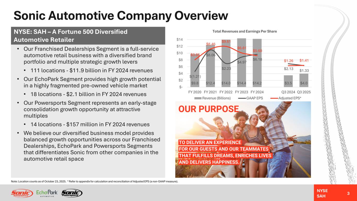 NYSE SAH Forward-Looking Statements This presentation contains “forward-looking statements” within the meaning of the Private Securities Litigation Reform Act of 1995. These statements relate to future events, are not historical facts and are based on our current expectations and assumptions regarding our business, the economy and other future conditions. These statements can generally be identified by lead-in words such as “may,” “will,” “should,” “could,” “believe,” “expect,” “estimate,” “anticipate,” “intend,” “plan,” “project,” “foresee” and other similar words or phrases. Statements that describe our Company’s objectives, plans or goals are also forward-looking statements. Examples of such forward-looking information we may be discussing in this presentation include, without limitation, the potential impact of tariffs on new vehicle pricing, inventory levels, and consumer demand, our anticipated future new vehicle unit sales volume, revenues and profitability (including per unit data), our anticipated future used vehicle unit sales volume, revenues and profitability (including per unit data), future levels of consumer demand for new and used vehicles, our anticipated future parts, service and collision repair (“Fixed Operations”) gross profit, our anticipated future finance and insurance (“F&I”) gross profit, our anticipated expense reductions, targeted increases to our technician headcount, hybrid and electric vehicle trends and related GPU headwinds, long-term annual revenue and profitability targets, anticipated future growth capital expenditures, profitability and pricing expectations in our EchoPark Segment, EchoPark’s omnichannel strategy, anticipated future EchoPark population coverage, anticipated future EchoPark revenue and unit sales volume, anticipated future performance and growth of our Franchised Dealerships Segment, anticipated growth and profitability of our Powersports Segment, anticipated liquidity positions, anticipated industry new vehicle sales volume, anticipated industry used vehicle supply, the implementation of growth and operating strategies, including acquisitions of dealerships and properties, anticipated future acquisition synergies, the return of capital to stockholders, anticipated future success and impacts from the implementation of our strategic initiatives, and earnings per share expectations. You are cautioned that these forward-looking statements are not guarantees of future performance, involve risks and uncertainties and actual results may differ materially from those projected in the forward-looking statements as a result of various factors. These risks and uncertainties include, without limitation, risks associated with tariffs, import product restrictions and foreign trade risks, economic conditions in the markets in which we operate, supply chain disruptions and manufacturing delays, labor shortages, the impacts of inflation and fluctuations in interest rates, new and used vehicle industry sales volume, the success of our operational strategies, the rate and timing of overall economic expansion or contraction, and the other risk factors described in the Company’s Annual Report on Form 10-K for the year ended December 31, 2024 and other reports and information filed with the United States Securities and Exchange Commission (the “SEC”). These forward-looking statements, risks, uncertainties and additional factors speak only as of the date of this presentation. We undertake no obligation to update any such statements, except as required under federal securities laws and the rules and regulations of the SEC. 2