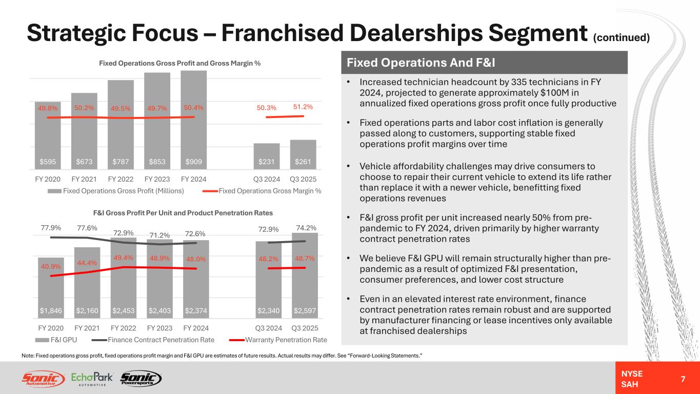 NYSE SAH Strategic Focus – Franchised Dealerships Segment (continued) 6 91.9 99.8 99.4 107.3 111.5 27.4 30.4 $45.9 $49.9 $56.1 $57.9 $57.7 $56.2 $60.3 $2,536 $4,595 $6,591 $4,836 $3,382 $3,047 $3,001 FY 2020 FY 2021 FY 2022 FY 2023 FY 2024 Q3 2024 Q3 2025 Retail New Vehicle Unit Sales Volume, Revenue, and Gross Profit Per Unit Unit Sales Volume (Thousands) Revenue Per Unit (Thousands) GPU 101.9 105.5 108.5 100.2 102.0 24.9 26.4 $23.0 $27.5 $31.3 $30.4 $28.6 $28.1 $30.2 $1,207 $1,784 $1,607 $1,626 $1,473 $1,386 $1,528 FY 2020 FY 2021 FY 2022 FY 2023 FY 2024 Q3 2024 Q3 2025 Retail Used Vehicle Unit Sales Volume, Revenue, and Gross Profit Per Unit Unit Sales Volume (Thousands) Revenue Per Unit (Thousands) GPU Retail New And Used Vehicles • Tariffs may create volatility in new and used vehicle pricing, volume and GPU in Q4 2025 and beyond • The rate of new vehicle GPU decline has moderated, and we believe the "new normal" will remain higher than pre-pandemic levels, in the $2,500-$3,000 per unit range, subject to tariff impact on inventory levels, pricing and demand • We believe used vehicle GPU may decline over time if we are able to drive higher retail used vehicle unit sales volume by supplementing our inventory levels from wholesale auction sources as off-lease inventory supply grows beyond 2025 • Strategic focus to return to selling at least 100 retail used vehicles per store per month, on average (represents approximately 25% improvement in retail used vehicle volume throughput per store) • As new and used vehicle sales volumes have recovered from pandemic-induced lows, F&I gross profit and fixed operations gross profit have benefitted from higher industry retail volume Note: New and used vehicle GPU, sales volume, and F&I and fixed operations gross profit expectations and projections are estimates of future results. Actual results may differ. See “Forward-Looking Statements.”