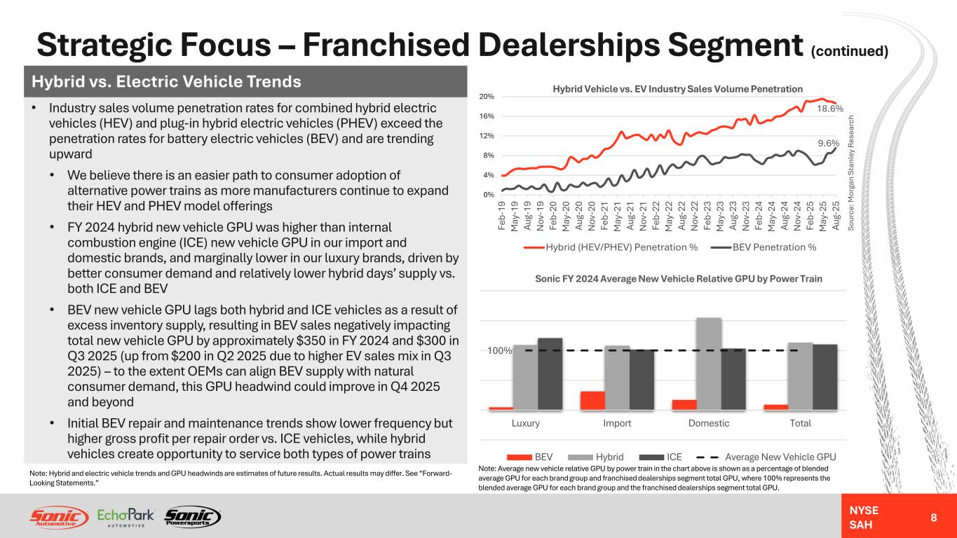NYSE SAH Strategic Focus – Franchised Dealerships Segment (continued) 7 Fixed Operations And F&I • Increased technician headcount by 335 technicians in FY 2024, projected to generate approximately $100M in annualized fixed operations gross profit once fully productive • Fixed operations parts and labor cost inflation is generally passed along to customers, supporting stable fixed operations profit margins over time • Vehicle affordability challenges may drive consumers to choose to repair their current vehicle to extend its life rather than replace it with a newer vehicle, benefitting fixed operations revenues • F&I gross profit per unit increased nearly 50% from pre- pandemic to FY 2024, driven primarily by higher warranty contract penetration rates • We believe F&I GPU will remain structurally higher than pre- pandemic as a result of optimized F&I presentation, consumer preferences, and lower cost structure • Even in an elevated interest rate environment, finance contract penetration rates remain robust and are supported by manufacturer financing or lease incentives only available at franchised dealerships $1,846 $2,160 $2,453 $2,403 $2,374 $2,340 $2,597 77.9% 77.6% 72.9% 71.2% 72.6% 72.9% 74.2% 40.9% 44.4% 49.4% 48.9% 48.0% 48.2% 48.7% FY 2020 FY 2021 FY 2022 FY 2023 FY 2024 Q3 2024 Q3 2025 F&I Gross Profit Per Unit and Product Penetration Rates F&I GPU Finance Contract Penetration Rate Warranty Penetration Rate Note: Fixed operations gross profit, fixed operations profit margin and F&I GPU are estimates of future results. Actual results may differ. See “Forward-Looking Statements.” $595 $673 $787 $853 $909 $231 $261 49.8% 50.2% 49.5% 49.7% 50.4% 50.3% 51.2% FY 2020 FY 2021 FY 2022 FY 2023 FY 2024 Q3 2024 Q3 2025 Fixed Operations Gross Profit and Gross Margin % Fixed Operations Gross Profit (Millions) Fixed Operations Gross Margin %