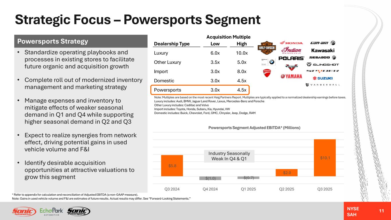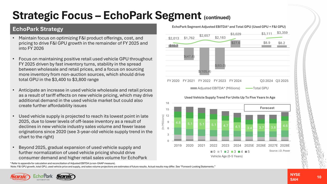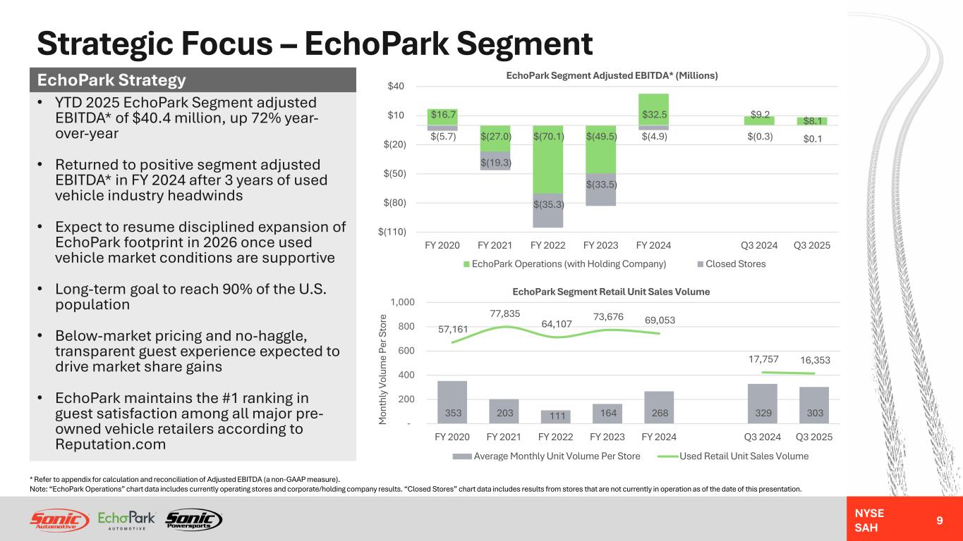 NYSE SAH Strategic Focus – EchoPark Segment • YTD 2025 EchoPark Segment adjusted EBITDA* of $40.4 million, up 72% year- over-year • Returned to positive segment adjusted EBITDA* in FY 2024 after 3 years of used vehicle industry headwinds • Expect to resume disciplined expansion of EchoPark footprint in 2026 once used vehicle market conditions are supportive • Long-term goal to reach 90% of the U.S. population • Below-market pricing and no-haggle, transparent guest experience expected to drive market share gains • EchoPark maintains the #1 ranking in guest satisfaction among all major pre- owned vehicle retailers according to Reputation.com EchoPark Strategy * Refer to appendix for calculation and reconciliation of Adjusted EBITDA (a non-GAAP measure). Note: “EchoPark Operations” chart data includes currently operating stores and corporate/holding company results. “Closed Stores” chart data includes results from stores that are not currently in operation as of the date of this presentation. $16.7 $(27.0) $(70.1) $(49.5) $32.5 $9.2 $8.1 $(5.7) $(19.3) $(35.3) $(33.5) $(4.9) $(0.3) $0.1 $(110) $(80) $(50) $(20) $10 $40 FY 2020 FY 2021 FY 2022 FY 2023 FY 2024 Q3 2024 Q3 2025 EchoPark Segment Adjusted EBITDA* (Millions) EchoPark Operations (with Holding Company) Closed Stores 353 203 111 164 268 329 303 57,161 77,835 64,107 73,676 69,053 17,757 16,353 - 200 400 600 800 1,000 FY 2020 FY 2021 FY 2022 FY 2023 FY 2024 Q3 2024 Q3 2025 M on th ly V ol um e Pe r S to re EchoPark Segment Retail Unit Sales Volume Average Monthly Unit Volume Per Store Used Retail Unit Sales Volume 9