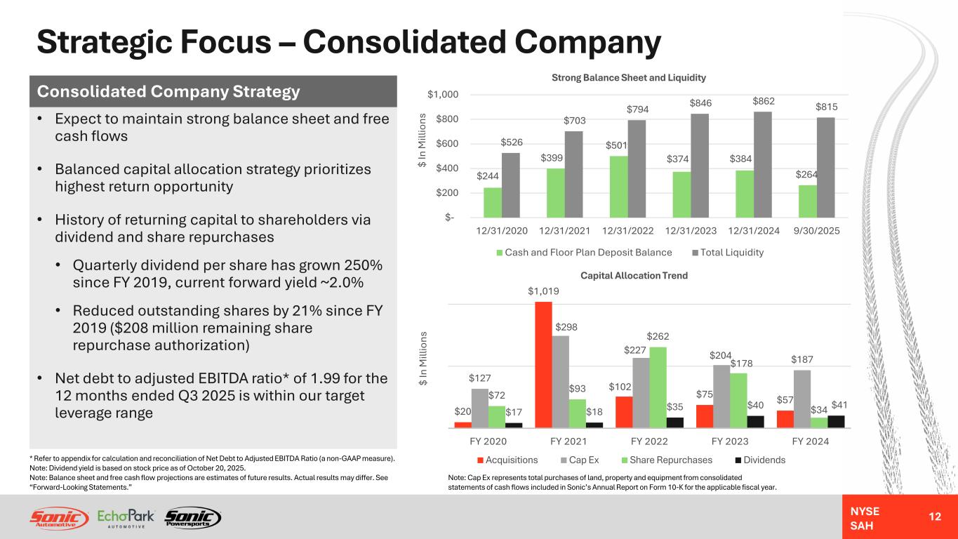 NYSE SAH 11 • Standardize operating playbooks and processes in existing stores to facilitate future organic and acquisition growth • Complete roll out of modernized inventory management and marketing strategy • Manage expenses and inventory to mitigate effects of weaker seasonal demand in Q1 and Q4 while supporting higher seasonal demand in Q2 and Q3 • Expect to realize synergies from network effect, driving potential gains in used vehicle volume and F&I • Identify desirable acquisition opportunities at attractive valuations to grow this segment Powersports Strategy Note: Multiples are based on the most recent Haig Partners Report. Multiples are typically applied to a normalized dealership earnings before taxes. Luxury includes: Audi, BMW, Jaguar Land Rover, Lexus, Mercedes-Benz and Porsche Other Luxury includes: Cadillac and Volvo Import includes: Toyota, Honda, Subaru, Kia, Hyundai, VW Domestic includes: Buick, Chevrolet, Ford, GMC, Chrysler, Jeep, Dodge, RAM Strategic Focus – Powersports Segment * Refer to appendix for calculation and reconciliation of Adjusted EBITDA (a non-GAAP measure). Note: Gains in used vehicle volume and F&I are estimates of future results. Actual results may differ. See “Forward-Looking Statements.” $5.8 $(1.0) $(0.7) $2.0 $10.1 Q3 2024 Q4 2024 Q1 2025 Q2 2025 Q3 2025 Powersports Segment Adjusted EBITDA* (Millions) Industry Seasonally Weak In Q4 & Q1 Acquisition Multiple Dealership Type Low High Luxury 6.0x 10.0x Other Luxury 3.5x 5.0x Import 3.0x 8.0x Domestic 3.0x 4.5x Powersports 3.0x 4.5x