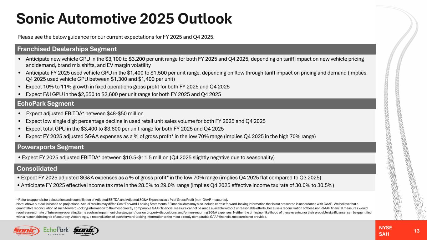 NYSE SAH Strategic Focus – Consolidated Company 12 • Expect to maintain strong balance sheet and free cash flows • Balanced capital allocation strategy prioritizes highest return opportunity • History of returning capital to shareholders via dividend and share repurchases • Quarterly dividend per share has grown 250% since FY 2019, current forward yield ~2.0% • Reduced outstanding shares by 21% since FY 2019 ($208 million remaining share repurchase authorization) • Net debt to adjusted EBITDA ratio* of 1.99 for the 12 months ended Q3 2025 is within our target leverage range Consolidated Company Strategy $244 $399 $501 $374 $384 $264 $526 $703 $794 $846 $862 $815 $- $200 $400 $600 $800 $1,000 12/31/2020 12/31/2021 12/31/2022 12/31/2023 12/31/2024 9/30/2025 $ In M ill io ns Strong Balance Sheet and Liquidity Cash and Floor Plan Deposit Balance Total Liquidity * Refer to appendix for calculation and reconciliation of Net Debt to Adjusted EBITDA Ratio (a non-GAAP measure). Note: Dividend yield is based on stock price as of October 20, 2025. Note: Balance sheet and free cash flow projections are estimates of future results. Actual results may differ. See “Forward-Looking Statements.” $20 $1,019 $102 $75 $57 $127 $298 $227 $204 $187 $72 $93 $262 $178 $34 $17 $18 $35 $40 $41 FY 2020 FY 2021 FY 2022 FY 2023 FY 2024 $ In M ill io ns Capital Allocation Trend Acquisitions Cap Ex Share Repurchases Dividends Note: Cap Ex represents total purchases of land, property and equipment from consolidated statements of cash flows included in Sonic’s Annual Report on Form 10-K for the applicable fiscal year.