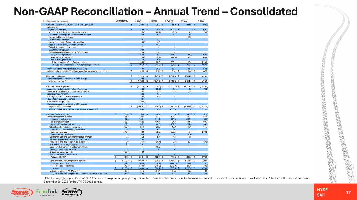 NYSE SAH Non-GAAP Reconciliation – Annual Trend – Consolidated 17 Note: Earnings (loss) per share and SG&A expenses as a percentage of gross profit metrics are calculated based on actual unrounded amounts. Balance sheet amounts are as of December 31 for the FY then ended, and as of September 30, 2025 for the LTM Q3 2025 period. (In millions, except per share data) LTM Q3 2025 FY 2024 FY 2023 FY 2022 FY 2021 FY 2020 Reported net income (loss) from continuing operations 216.0$ 178.2$ 88.5$ 348.9$ (50.7)$ Adjustments: Impairment charges 3.9$ 79.3$ 320.4$ -$ 269.2$ Acquisition and disposition-related (gain) loss (5.6) (20.7) (9.1) 1.2 (9.2) Severance and long-term compensation charges 5.5 5.1 4.4 6.5 - Loss on debt extinguishment - - - 15.6 - Storm damage charges 8.3 1.9 - - - Loss (gain) on exit of leased dealerships (3.0) 4.3 - - - Used vehicle inventory valuation adjustment - 10.0 - - - Closed store accrued expenses 2.1 - - - - Cyber insurance proceeds (10.0) - - - - Excess compensation related to CDK outage 13.4 - - - - Total pre-tax adjustments 14.6 79.9 315.7 23.3 260.0 Tax effect of above items (3.8) (19.9) (22.6) (5.9) (40.4) Non-recurring tax items (31.0) 5.8 - - - Total net income effect of adjustments (20.2) 65.8 293.1 17.4 219.6 Adjusted net income (loss) from continuing operations 195.8$ 244.0$ 381.6$ 366.3$ 168.9$ Diluted weighted-average shares outstanding 35.0 35.9 39.7 43.3 43.9 Adjusted diluted earnings (loss) per share from continuing operations 5.60$ 6.81$ 9.61$ 8.46$ 3.85$ Reported gross profit 2,192.8$ 2,245.7$ 2,317.0$ 1,914.3$ 1,423.6$ Excess compensation related to CDK outage 2.0 - - - - Adjusted gross profit 2,194.8$ 2,245.7$ 2,317.0$ 1,914.3$ 1,423.6$ Reported SG&A expenses (1,577.0)$ (1,600.5)$ (1,555.1)$ (1,274.7)$ (1,028.7)$ Acquisition and disposition-related (gain) loss (5.6) (20.7) (9.1) 1.2 (9.2) Severance and long-term compensation charges 5.5 5.1 4.4 6.5 - Storm damage charges 8.3 1.9 - - - Loss (gain) on exit of leased dealerships (3.0) 4.3 - - - Closed store accrued expenses 2.1 - - - - Cyber insurance proceeds (10.0) - - - - Excess compensation related to CDK outage 11.4 - - - - Adjusted SG&A expenses (1,568.3)$ (1,609.9)$ (1,559.8)$ (1,267.0)$ (1,037.9)$ Adjusted SG&A expenses as a percentage of gross profit 71.5% 71.4% 67.3% 66.2% 72.9% Reported net income (loss) 130.4$ 216.0$ 178.2$ 88.5$ 348.9$ (51.4)$ Income tax (benefit) expense 51.2 40.1 63.7 101.5 109.3 15.6 Income (loss) before taxes 181.6 256.1 241.9 190.0 458.2 (35.8) Non-floor plan interest 106.1 112.2 108.1 84.7 44.7 38.7 Depreciation and amortization 167.2 155.9 148.8 132.7 104.3 93.9 Stock-based compensation expense 22.8 21.3 23.3 16.0 15.0 11.7 Loss (gain) on exit of leased dealerships - (3.0) 4.3 - - - Impairment charges 175.3 3.9 79.3 320.4 0.1 270.0 Loss on debt extinguishment - 0.6 - - 15.6 - Severance and long-term compensation charges 0.5 5.6 5.1 4.4 8.0 - Excess compensation related to CDK outage - 13.4 - - - - Acquisition and disposition-related (gain) loss 2.9 (6.3) (20.4) (9.7) (0.4) (8.2) Hail and storm damage charges 8.2 8.3 1.9 - - - Used vehicle inventory valuation adjustment - - 10.0 - - - Closed store accrued expenses - 2.1 - - - - Cyber insurance proceeds (50.0) (10.0) - - - - (Gain) loss on legal settlements 0.7 - - - - - Adjusted EBITDA 615.3$ 560.1$ 602.3$ 738.5$ 645.5$ 370.3$ Long-term debt (including current portion) 1,490.2$ 1,588.0$ 1,676.6$ 1,751.7$ 1,561.2$ 720.1$ Cash and equivalents (89.4) (44.0) (28.9) (229.2) (299.4) (170.3) Floor plan deposit balance (175.0) (340.0) (345.0) (272.0) (99.8) (73.2) Net debt 1,225.8$ 1,204.0$ 1,302.7$ 1,250.5$ 1,162.0$ 476.6$ Net debt to adjusted EBITDA ratio 1.99 2.15 2.16 1.69 1.80 1.29 Long-term debt (including current portion) to adjusted EBITDA ratio 2.42 2.84 2.78 2.37 2.42 1.94