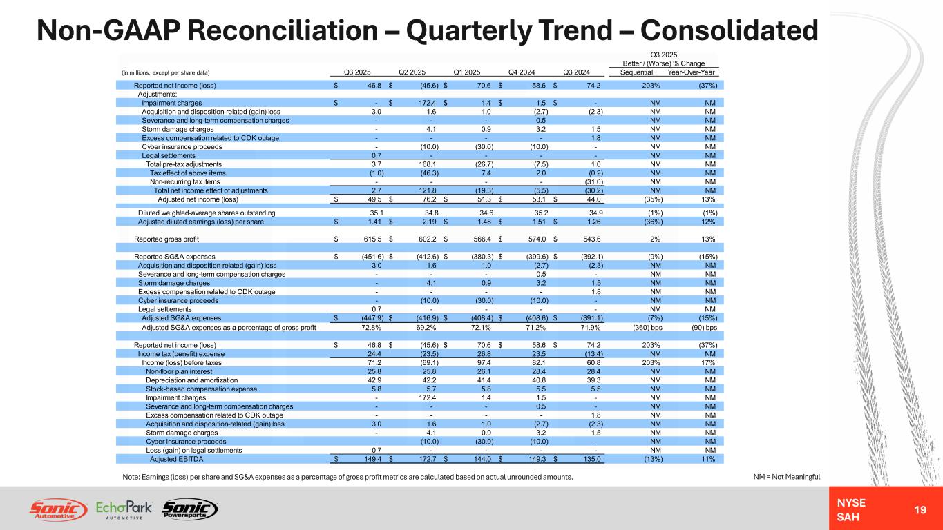 NYSE SAH GAAP Income Statement – Quarterly Trend – Consolidated 18 NM = Not MeaningfulNote: Earnings (loss) per share and gross profit per unit metrics are calculated based on actual unrounded amounts. Q3 2025 Better / (Worse) % Change (In millions, except unit, per unit, and per share data) Q3 2025 Q2 2025 Q1 2025 Q4 2024 Q3 2024 Sequential Year-Over-Year Revenues: Retail new vehicles 1,872.8$ 1,666.1$ 1,656.3$ 1,932.3$ 1,566.8$ 12% 20% Fleet new vehicles 26.0 29.4 22.1 27.3 22.2 (12%) 17% Total new vehicles 1,898.8 1,695.5 1,678.4 1,959.6 1,589.0 12% 19% Used vehicles 1,253.1 1,180.7 1,225.0 1,197.6 1,180.7 6% 6% Wholesale vehicles 84.2 83.3 82.7 71.3 67.2 1% 25% Total vehicles 3,236.1 2,959.5 2,986.1 3,228.5 2,836.9 9% 14% Parts, service and collision repair 533.9 495.6 474.4 476.7 479.0 8% 11% Finance, insurance and other, net ("F&I") 203.8 202.1 190.8 190.6 175.6 1% 16% Total revenues 3,973.8 3,657.2 3,651.3 3,895.8 3,491.5 9% 14% Gross profit: Retail new vehicles 97.4 99.2 89.4 106.6 87.6 (2%) 11% Fleet new vehicles - 0.5 0.6 0.7 0.6 (100%) (100%) Total new vehicles 97.4 99.7 90.0 107.3 88.2 (2%) 10% Used vehicles 45.2 48.1 46.4 37.8 41.2 (6%) 10% Wholesale vehicles (3.3) (1.6) (1.4) (3.3) (1.3) (113%) (154%) Total vehicles 139.3 146.2 135.0 141.8 128.1 (5%) 9% Parts, service and collision repair 272.4 253.9 240.6 241.6 239.9 7% 14% Finance, insurance and other, net 203.8 202.1 190.8 190.6 175.6 1% 16% Total gross profit 615.5 602.2 566.4 574.0 543.6 2% 13% SG&A expenses (451.6) (412.6) (380.3) (399.6) (392.1) (9%) (15%) Impairment charges - (172.4) (1.4) (1.5) - NM NM Depreciation and amortization (41.2) (40.5) (39.7) (39.4) (37.9) (1%) (9%) Operating income (loss) 122.7 (23.3) 145.0 133.5 113.6 626% 8% Interest expense, floor plan (23.9) (18.3) (20.0) (21.4) (23.0) (30%) (4%) Interest expense, other, net (27.5) (27.4) (27.6) (29.9) (29.8) 0% 8% Other income (expense), net (0.1) (0.1) - (0.1) - NM NM Income (loss) before taxes 71.2 (69.1) 97.4 82.1 60.8 203% 17% Income tax benefit (expense) (24.4) 23.5 (26.8) (23.5) 13.4 (204%) (282%) Net income (loss) 46.8$ (45.6)$ 70.6$ 58.6$ 74.2$ 203% (37%) Diluted weighted-average shares outstanding 35.1 34.1 34.6 35.2 34.9 (3%) (1%) Diluted earnings (loss) per share 1.33$ (1.34)$ 2.04$ 1.67$ 2.13$ 199% (38%) Unit sales volume: Retail new vehicles 32,086 29,478 29,075 33,190 28,657 9% 12% Fleet new vehicles 579 571 383 506 406 1% 43% Used vehicles 44,167 42,512 44,817 42,896 43,474 4% 2% Wholesale vehicles 8,957 9,368 9,405 8,460 7,792 (4%) 15% Gross profit per unit ("GPU"): Retail new vehicles 3,035$ 3,365$ 3,075$ 3,212$ 3,056$ (10%) (1%) Used vehicles 1,024$ 1,131$ 1,034$ 881$ 947$ (9%) 8% F&I 2,673$ 2,807$ 2,582$ 2,505$ 2,434$ (5%) 10%