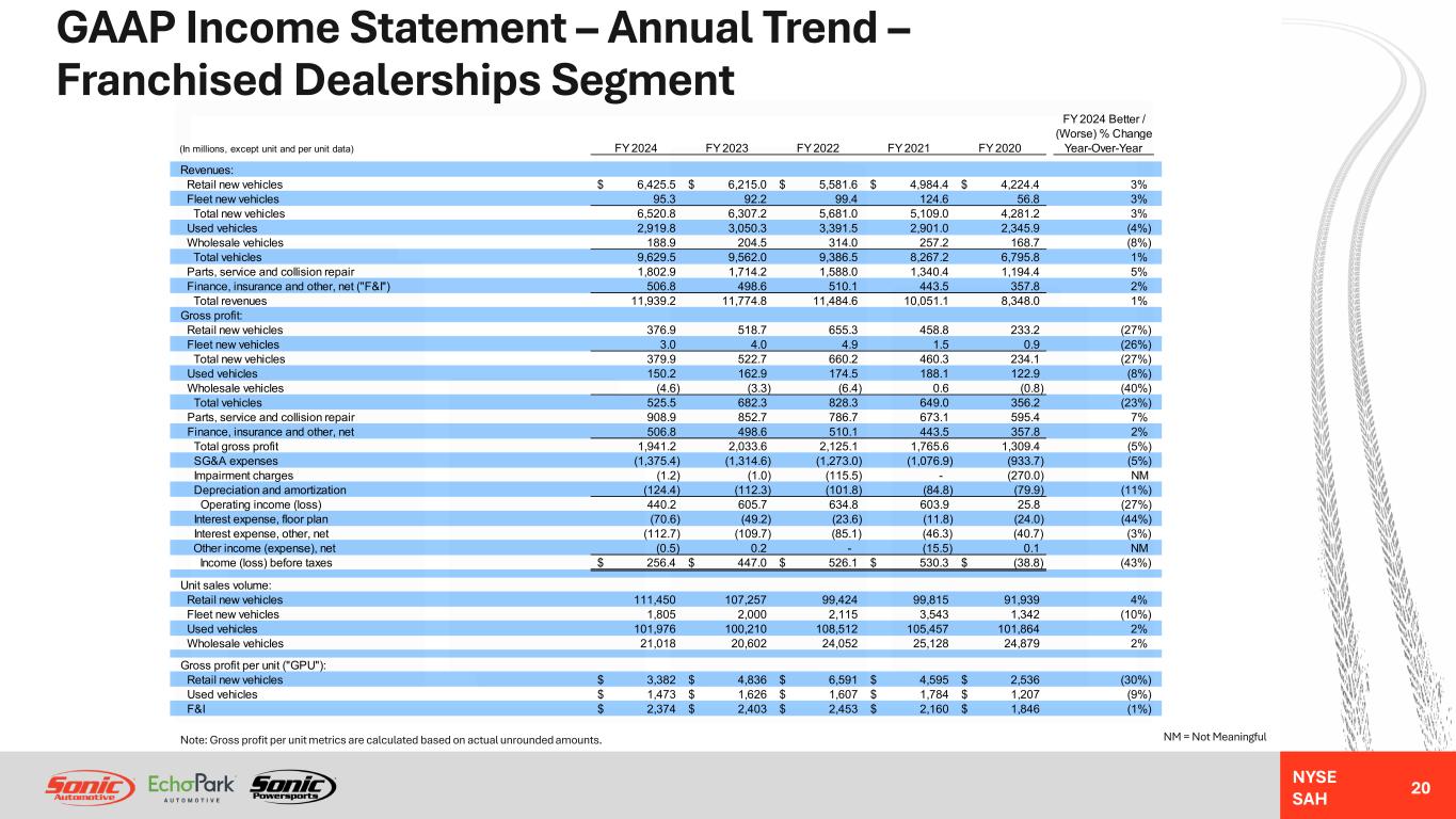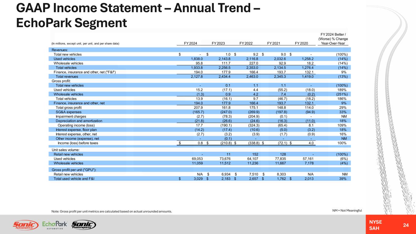NYSE SAH GAAP Income Statement – Annual Trend – EchoPark Segment 24 NM = Not MeaningfulNote: Gross profit per unit metrics are calculated based on actual unrounded amounts. FY 2024 Better / (Worse) % Change (In millions, except unit, per unit, and per share data) FY 2024 FY 2023 FY 2022 FY 2021 FY 2020 Year-Over-Year Revenues: Total new vehicles -$ 1.0$ 9.2$ 9.0$ -$ (100%) Used vehicles 1,838.0 2,143.8 2,116.8 2,032.6 1,258.2 (14%) Wholesale vehicles 95.8 111.7 227.0 92.9 18.2 (14%) Total vehicles 1,933.8 2,256.5 2,353.0 2,134.5 1,276.4 (14%) Finance, insurance and other, net ("F&I") 194.0 177.9 166.4 193.7 132.1 9% Total revenues 2,127.8 2,434.4 2,463.0 2,345.3 1,419.0 (13%) Gross profit: Total new vehicles - 0.1 1.1 1.1 - (100%) Used vehicles 15.2 (17.1) 4.4 (55.2) (18.0) 189% Wholesale vehicles (1.3) 0.9 4.2 7.4 (0.2) (251%) Total vehicles 13.9 (16.1) 9.7 (46.7) (18.2) 186% Finance, insurance and other, net 194.0 177.9 166.4 193.7 132.1 9% Total gross profit 207.9 161.8 175.1 148.8 114.0 29% SG&A expenses (165.7) (247.0) (269.9) (197.8) (94.9) 33% Impairment charges (2.7) (78.3) (204.9) (0.1) - NM Depreciation and amortization (21.8) (26.6) (24.6) (16.3) (11.0) 18% Operating income (loss) 17.7 (190.1) (324.3) (65.4) 8.1 109% Interest expense, floor plan (14.2) (17.4) (10.6) (5.0) (3.2) 18% Interest expense, other, net (2.7) (3.2) (3.9) (1.7) (0.9) 16% Other income (expense), net - (0.1) - - - NM Income (loss) before taxes 0.8$ (210.8)$ (338.8)$ (72.1)$ 4.0$ 100% Unit sales volume: Retail new vehicles - 11 152 128 - (100%) Used vehicles 69,053 73,676 64,107 77,835 57,161 (6%) Wholesale vehicles 11,059 11,512 11,236 11,667 7,178 (4%) Gross profit per unit ("GPU"): Retail new vehicles N/A 6,934$ 7,510$ 8,303$ N/A NM Total used vehicle and F&I 3,029$ 2,183$ 2,657$ 1,762$ 2,013$ 39%