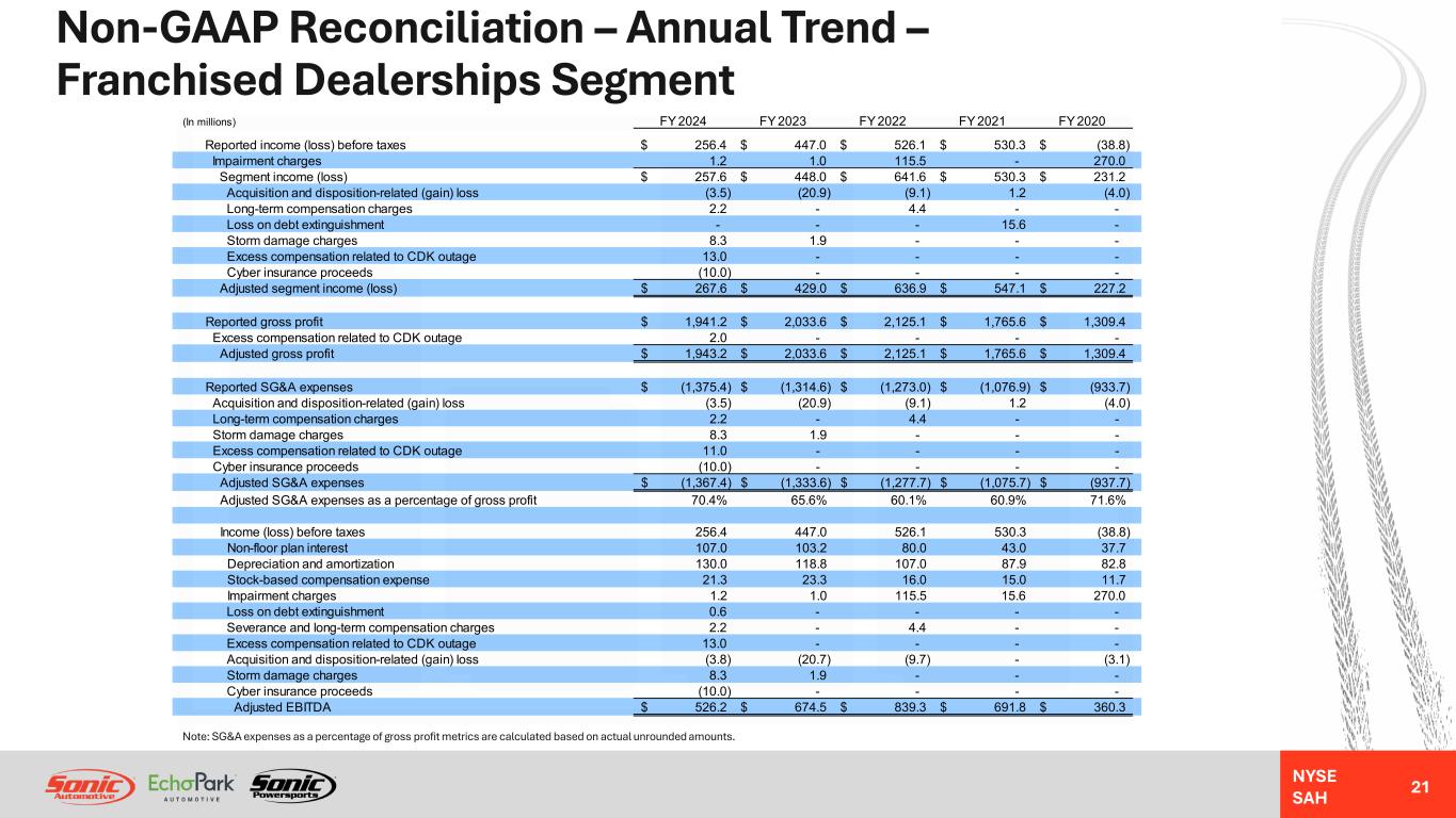 NYSE SAH GAAP Income Statement – Annual Trend – Franchised Dealerships Segment 20 NM = Not MeaningfulNote: Gross profit per unit metrics are calculated based on actual unrounded amounts. FY 2024 Better / (Worse) % Change (In millions, except unit and per unit data) FY 2024 FY 2023 FY 2022 FY 2021 FY 2020 Year-Over-Year Revenues: Retail new vehicles 6,425.5$ 6,215.0$ 5,581.6$ 4,984.4$ 4,224.4$ 3% Fleet new vehicles 95.3 92.2 99.4 124.6 56.8 3% Total new vehicles 6,520.8 6,307.2 5,681.0 5,109.0 4,281.2 3% Used vehicles 2,919.8 3,050.3 3,391.5 2,901.0 2,345.9 (4%) Wholesale vehicles 188.9 204.5 314.0 257.2 168.7 (8%) Total vehicles 9,629.5 9,562.0 9,386.5 8,267.2 6,795.8 1% Parts, service and collision repair 1,802.9 1,714.2 1,588.0 1,340.4 1,194.4 5% Finance, insurance and other, net ("F&I") 506.8 498.6 510.1 443.5 357.8 2% Total revenues 11,939.2 11,774.8 11,484.6 10,051.1 8,348.0 1% Gross profit: Retail new vehicles 376.9 518.7 655.3 458.8 233.2 (27%) Fleet new vehicles 3.0 4.0 4.9 1.5 0.9 (26%) Total new vehicles 379.9 522.7 660.2 460.3 234.1 (27%) Used vehicles 150.2 162.9 174.5 188.1 122.9 (8%) Wholesale vehicles (4.6) (3.3) (6.4) 0.6 (0.8) (40%) Total vehicles 525.5 682.3 828.3 649.0 356.2 (23%) Parts, service and collision repair 908.9 852.7 786.7 673.1 595.4 7% Finance, insurance and other, net 506.8 498.6 510.1 443.5 357.8 2% Total gross profit 1,941.2 2,033.6 2,125.1 1,765.6 1,309.4 (5%) SG&A expenses (1,375.4) (1,314.6) (1,273.0) (1,076.9) (933.7) (5%) Impairment charges (1.2) (1.0) (115.5) - (270.0) NM Depreciation and amortization (124.4) (112.3) (101.8) (84.8) (79.9) (11%) Operating income (loss) 440.2 605.7 634.8 603.9 25.8 (27%) Interest expense, floor plan (70.6) (49.2) (23.6) (11.8) (24.0) (44%) Interest expense, other, net (112.7) (109.7) (85.1) (46.3) (40.7) (3%) Other income (expense), net (0.5) 0.2 - (15.5) 0.1 NM Income (loss) before taxes 256.4$ 447.0$ 526.1$ 530.3$ (38.8)$ (43%) Unit sales volume: Retail new vehicles 111,450 107,257 99,424 99,815 91,939 4% Fleet new vehicles 1,805 2,000 2,115 3,543 1,342 (10%) Used vehicles 101,976 100,210 108,512 105,457 101,864 2% Wholesale vehicles 21,018 20,602 24,052 25,128 24,879 2% Gross profit per unit ("GPU"): Retail new vehicles 3,382$ 4,836$ 6,591$ 4,595$ 2,536$ (30%) Used vehicles 1,473$ 1,626$ 1,607$ 1,784$ 1,207$ (9%) F&I 2,374$ 2,403$ 2,453$ 2,160$ 1,846$ (1%)