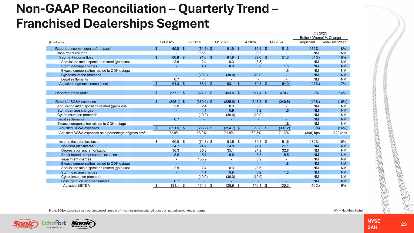 NYSE SAH GAAP Income Statement – Quarterly Trend – Franchised Dealerships Segment 22 NM = Not MeaningfulNote: Gross profit per unit metrics are calculated based on actual unrounded amounts. Q3 2025 Better / (Worse) % Change (In millions, except unit and per unit data) Q3 2025 Q2 2025 Q1 2025 Q4 2024 Q3 2024 Sequential Year-Over-Year Revenues: Retail new vehicles 1,834.0$ 1,639.1$ 1,636.9$ 1,914.8$ 1,539.9$ 12% 19% Fleet new vehicles 26.0 29.5 22.1 27.2 22.2 (12%) 17% Total new vehicles 1,860.0 1,668.6 1,659.0 1,942.0 1,562.1 11% 19% Used vehicles 796.7 744.9 745.6 757.0 701.4 7% 14% Wholesale vehicles 52.8 57.8 54.6 49.8 42.4 (8%) 25% Total vehicles 2,709.5 2,471.3 2,459.2 2,748.8 2,305.9 10% 18% Parts, service and collision repair 510.1 484.9 467.4 469.7 458.9 5% 11% Finance, insurance and other, net ("F&I") 147.6 144.3 130.6 140.5 122.4 2% 21% Total revenues 3,367.2 3,100.5 3,057.2 3,359.0 2,887.2 9% 17% Gross profit: Retail new vehicles 91.3 95.2 86.7 104.4 83.5 (4%) 9% Fleet new vehicles - 0.6 0.6 0.7 0.6 (100%) (100%) Total new vehicles 91.3 95.8 87.3 105.1 84.1 (5%) 9% Used vehicles 40.4 39.5 39.9 36.0 34.6 2% 17% Wholesale vehicles (2.9) (0.9) (1.0) (2.7) (1.1) (234%) (164%) Total vehicles 128.8 134.4 126.2 138.4 117.6 (4%) 10% Parts, service and collision repair 261.3 248.9 237.2 238.5 230.7 5% 13% Finance, insurance and other, net 147.6 144.3 130.6 140.5 122.4 2% 21% Total gross profit 537.7 527.6 494.0 517.4 470.7 2% 14% SG&A expenses (395.1) (360.2) (325.9) (348.5) (340.5) (10%) (16%) Impairment charges - (165.9) - (0.2) - NM NM Depreciation and amortization (34.6) (34.1) (33.4) (32.7) (31.5) (1%) (10%) Operating income (loss) 108.0 (32.6) 134.7 136.0 98.7 431% 9% Interest expense, floor plan (20.7) (15.3) (16.3) (18.0) (18.7) (35%) (11%) Interest expense, other, net (26.4) (26.3) (26.6) (28.6) (28.5) 0% 7% Other income (expense), net (0.1) (0.1) 0.1 - 0.1 NM NM Income (loss) before taxes 60.8$ (74.3)$ 91.9$ 89.4$ 51.6$ 182% 18% Unit sales volume: Retail new vehicles 30,415 28,084 28,082 32,250 27,391 8% 11% Fleet new vehicles 579 571 383 506 406 1% 43% Used vehicles 26,407 24,953 25,441 25,702 24,940 6% 6% Wholesale vehicles 5,649 6,213 6,195 5,692 4,973 (9%) 14% Gross profit per unit ("GPU"): Retail new vehicles 3,001$ 3,391$ 3,089$ 3,238$ 3,047$ (12%) (2%) Used vehicles 1,528$ 1,583$ 1,568$ 1,401$ 1,386$ (3%) 10% F&I 2,597$ 2,721$ 2,439$ 2,424$ 2,340$ (5%) 11%