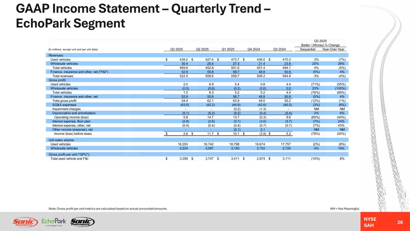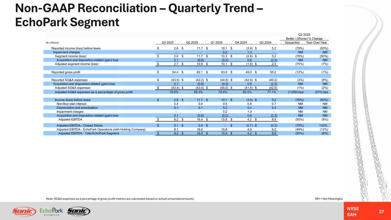 NYSE SAH GAAP Income Statement – Quarterly Trend – EchoPark Segment 26 NM = Not MeaningfulNote: Gross profit per unit metrics are calculated based on actual unrounded amounts. Q3 2025 Better / (Worse) % Change (In millions, except unit and per unit data) Q3 2025 Q2 2025 Q1 2025 Q4 2024 Q3 2024 Sequential Year-Over-Year Revenues: Used vehicles 439.2$ 427.4$ 473.7$ 436.0$ 470.3$ 3% (7%) Wholesale vehicles 30.4 25.4 27.3 21.4 23.8 20% 28% Total vehicles 469.6 452.8 501.0 457.4 494.1 4% (5%) Finance, insurance and other, net ("F&I") 52.9 55.8 58.7 48.8 50.8 (5%) 4% Total revenues 522.5 508.6 559.7 506.2 544.9 3% (4%) Gross profit: Used vehicles 2.0 6.9 5.4 0.8 4.4 (71%) (55%) Wholesale vehicles (0.5) (0.6) (0.2) (0.6) 0.0 23% (100%) Total vehicles 1.5 6.3 5.2 0.2 4.4 (76%) (66%) Finance, insurance and other, net 52.9 55.8 58.7 48.8 50.8 (5%) 4% Total gross profit 54.4 62.1 63.9 49.0 55.2 (12%) (1%) SG&A expenses (43.5) (42.2) (44.8) (42.6) (40.2) (3%) (8%) Impairment charges - - (0.2) (1.3) - NM NM Depreciation and amortization (5.1) (5.2) (5.2) (5.4) (5.4) 2% 6% Operating income (loss) 5.8 14.7 13.7 (0.3) 9.6 (60%) (40%) Interest expense, floor plan (2.8) (2.6) (3.1) (3.0) (3.7) (7%) 24% Interest expense, other, net (0.4) (0.4) (0.4) (0.7) (0.7) (7%) 43% Other income (expense), net - - (0.1) 0.1 - NM NM Income (loss) before taxes 2.6$ 11.7$ 10.1$ (3.9)$ 5.2$ (78%) (50%) Unit sales volume: Used vehicles 16,353 16,742 18,798 16,674 17,757 (2%) (8%) Wholesale vehicles 3,224 3,097 3,150 2,752 2,720 4% 19% Gross profit per unit ("GPU"): Total used vehicle and F&I 3,359$ 3,747$ 3,411$ 2,974$ 3,111$ (10%) 8%