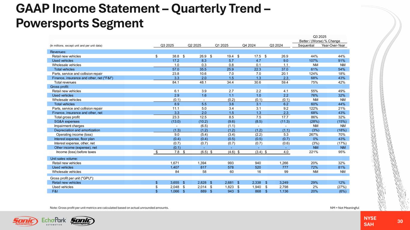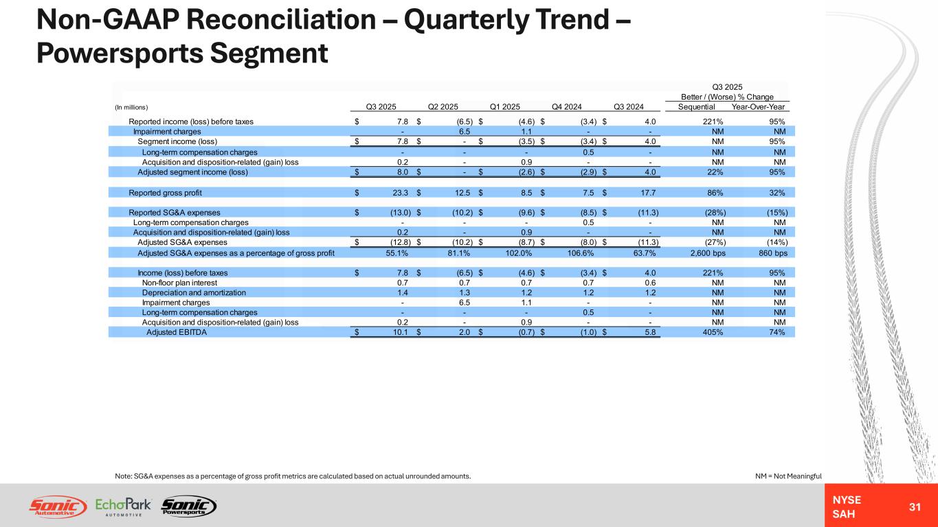 NYSE SAH GAAP Income Statement – Quarterly Trend – Powersports Segment 30 NM = Not MeaningfulNote: Gross profit per unit metrics are calculated based on actual unrounded amounts. Q3 2025 Better / (Worse) % Change (In millions, except unit and per unit data) Q3 2025 Q2 2025 Q1 2025 Q4 2024 Q3 2024 Sequential Year-Over-Year Revenues: Retail new vehicles 38.8$ 26.9$ 19.4$ 17.5$ 26.9$ 44% 44% Used vehicles 17.2 8.3 5.7 4.7 9.0 107% 91% Wholesale vehicles 1.0 0.3 0.8 0.1 1.1 NM NM Total vehicles 57.0 35.5 25.9 22.3 37.0 61% 54% Parts, service and collision repair 23.8 10.6 7.0 7.0 20.1 124% 18% Finance, insurance and other, net ("F&I") 3.3 2.0 1.5 1.3 2.3 68% 43% Total revenues 84.1 48.1 34.4 30.6 59.4 75% 42% Gross profit: Retail new vehicles 6.1 3.9 2.7 2.2 4.1 55% 49% Used vehicles 2.9 1.6 1.1 1.0 2.2 76% 32% Wholesale vehicles (0.1) - (0.2) (0.1) (0.1) NM NM Total vehicles 8.9 5.5 3.6 3.1 6.2 60% 44% Parts, service and collision repair 11.1 5.0 3.4 3.1 9.2 122% 21% Finance, insurance and other, net 3.3 2.0 1.5 1.3 2.3 68% 43% Total gross profit 23.3 12.5 8.5 7.5 17.7 86% 32% SG&A expenses (13.0) (10.2) (9.6) (8.5) (11.3) (28%) (15%) Impairment charges - (6.5) (1.1) - - NM NM Depreciation and amortization (1.3) (1.2) (1.2) (1.2) (1.1) (3%) (18%) Operating income (loss) 9.0 (5.4) (3.4) (2.2) 5.3 267% 70% Interest expense, floor plan (0.4) (0.4) (0.5) (0.5) (0.7) 0% 43% Interest expense, other, net (0.7) (0.7) (0.7) (0.7) (0.6) (3%) (17%) Other income (expense), net (0.1) - - - - NM NM Income (loss) before taxes 7.8$ (6.5)$ (4.6)$ (3.4)$ 4.0$ 221% 95% Unit sales volume: Retail new vehicles 1,671 1,394 993 940 1,266 20% 32% Used vehicles 1,407 817 578 520 777 72% 81% Wholesale vehicles 84 58 60 16 99 NM NM Gross profit per unit ("GPU"): Retail new vehicles 3,655$ 2,828$ 2,681$ 2,338$ 3,249$ 29% 12% Used vehicles 2,048$ 2,014$ 1,823$ 1,940$ 2,798$ 2% (27%) F&I 1,066$ 889$ 943$ 868$ 1,136$ 20% (6%)