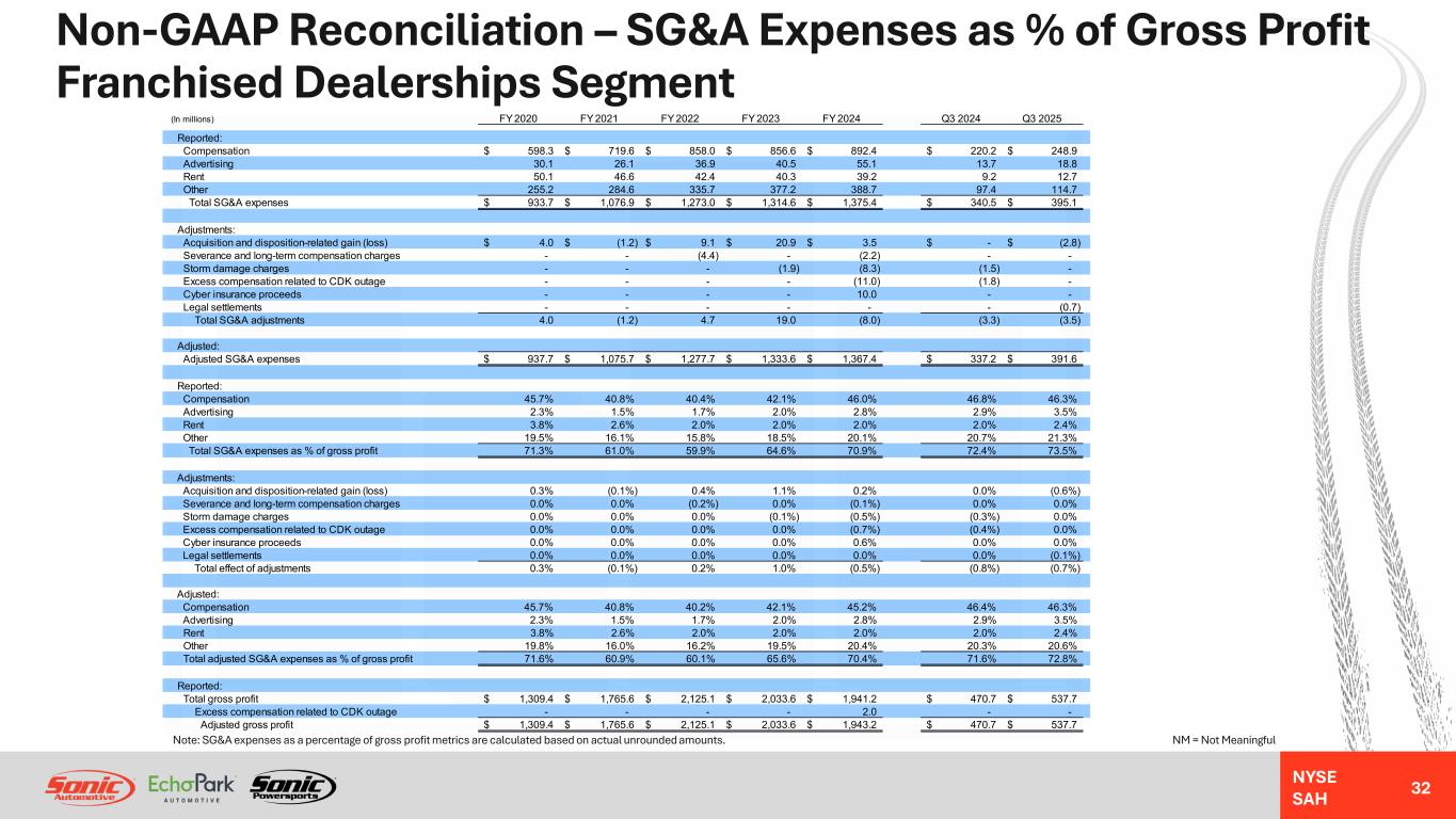 NYSE SAH Non-GAAP Reconciliation – Quarterly Trend – Powersports Segment 31 NM = Not MeaningfulNote: SG&A expenses as a percentage of gross profit metrics are calculated based on actual unrounded amounts. Q3 2025 Better / (Worse) % Change (In millions) Q3 2025 Q2 2025 Q1 2025 Q4 2024 Q3 2024 Sequential Year-Over-Year Reported income (loss) before taxes 7.8$ (6.5)$ (4.6)$ (3.4)$ 4.0$ 221% 95% Impairment charges - 6.5 1.1 - - NM NM Segment income (loss) 7.8$ -$ (3.5)$ (3.4)$ 4.0$ NM 95% Long-term compensation charges - - - 0.5 - NM NM Acquisition and disposition-related (gain) loss 0.2 - 0.9 - - NM NM Adjusted segment income (loss) 8.0$ -$ (2.6)$ (2.9)$ 4.0$ 22% 95% Reported gross profit 23.3$ 12.5$ 8.5$ 7.5$ 17.7$ 86% 32% Reported SG&A expenses (13.0)$ (10.2)$ (9.6)$ (8.5)$ (11.3)$ (28%) (15%) Long-term compensation charges - - - 0.5 - NM NM Acquisition and disposition-related (gain) loss 0.2 - 0.9 - - NM NM Adjusted SG&A expenses (12.8)$ (10.2)$ (8.7)$ (8.0)$ (11.3)$ (27%) (14%) Adjusted SG&A expenses as a percentage of gross profit 55.1% 81.1% 102.0% 106.6% 63.7% 2,600 bps 860 bps Income (loss) before taxes 7.8$ (6.5)$ (4.6)$ (3.4)$ 4.0$ 221% 95% Non-floor plan interest 0.7 0.7 0.7 0.7 0.6 NM NM Depreciation and amortization 1.4 1.3 1.2 1.2 1.2 NM NM Impairment charges - 6.5 1.1 - - NM NM Long-term compensation charges - - - 0.5 - NM NM Acquisition and disposition-related (gain) loss 0.2 - 0.9 - - NM NM Adjusted EBITDA 10.1$ 2.0$ (0.7)$ (1.0)$ 5.8$ 405% 74%