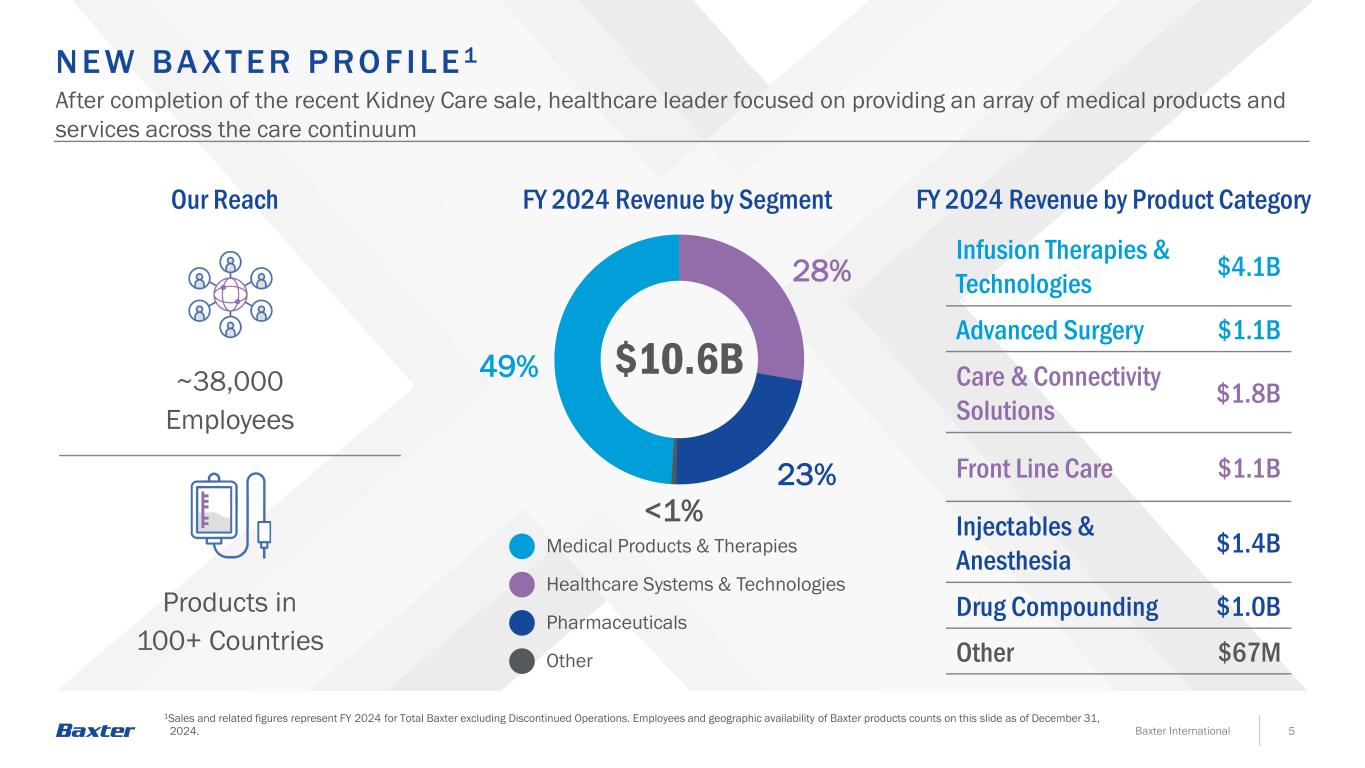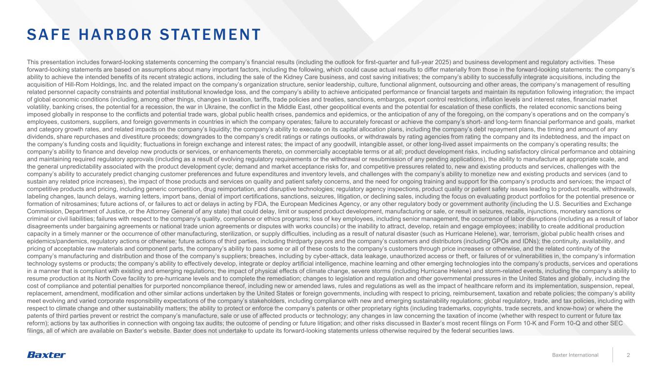 SA F E HA R BO R STAT EMENT 2Baxter International This presentation includes forward-looking statements concerning the company’s financial results (including the outlook for first-quarter and full-year 2025) and business development and regulatory activities. These forward-looking statements are based on assumptions about many important factors, including the following, which could cause actual results to differ materially from those in the forward-looking statements: the company’s ability to achieve the intended benefits of its recent strategic actions, including the sale of the Kidney Care business, and cost saving initiatives; the company’s ability to successfully integrate acquisitions, including the acquisition of Hill-Rom Holdings, Inc. and the related impact on the company’s organization structure, senior leadership, culture, functional alignment, outsourcing and other areas, the company’s management of resulting related personnel capacity constraints and potential institutional knowledge loss, and the company’s ability to achieve anticipated performance or financial targets and maintain its reputation following integration; the impact of global economic conditions (including, among other things, changes in taxation, tariffs, trade policies and treaties, sanctions, embargos, export control restrictions, inflation levels and interest rates, financial market volatility, banking crises, the potential for a recession, the war in Ukraine, the conflict in the Middle East, other geopolitical events and the potential for escalation of these conflicts, the related economic sanctions being imposed globally in response to the conflicts and potential trade wars, global public health crises, pandemics and epidemics, or the anticipation of any of the foregoing, on the company’s operations and on the company’s employees, customers, suppliers, and foreign governments in countries in which the company operates; failure to accurately forecast or achieve the company’s short- and long-term financial performance and goals, market and category growth rates, and related impacts on the company’s liquidity; the company’s ability to execute on its capital allocation plans, including the company’s debt repayment plans, the timing and amount of any dividends, share repurchases and divestiture proceeds; downgrades to the company’s credit ratings or ratings outlooks, or withdrawals by rating agencies from rating the company and its indebtedness, and the impact on the company’s funding costs and liquidity; fluctuations in foreign exchange and interest rates; the impact of any goodwill, intangible asset, or other long-lived asset impairments on the company’s operating results; the company’s ability to finance and develop new products or services, or enhancements thereto, on commercially acceptable terms or at all; product development risks, including satisfactory clinical performance and obtaining and maintaining required regulatory approvals (including as a result of evolving regulatory requirements or the withdrawal or resubmission of any pending applications), the ability to manufacture at appropriate scale, and the general unpredictability associated with the product development cycle; demand and market acceptance risks for, and competitive pressures related to, new and existing products and services, challenges with the company’s ability to accurately predict changing customer preferences and future expenditures and inventory levels, and challenges with the company’s ability to monetize new and existing products and services (and to sustain any related price increases), the impact of those products and services on quality and patient safety concerns, and the need for ongoing training and support for the company’s products and services; the impact of competitive products and pricing, including generic competition, drug reimportation, and disruptive technologies; regulatory agency inspections, product quality or patient safety issues leading to product recalls, withdrawals, labeling changes, launch delays, warning letters, import bans, denial of import certifications, sanctions, seizures, litigation, or declining sales, including the focus on evaluating product portfolios for the potential presence or formation of nitrosamines; future actions of, or failures to act or delays in acting by FDA, the European Medicines Agency, or any other regulatory body or government authority (including the U.S. Securities and Exchange Commission, Department of Justice, or the Attorney General of any state) that could delay, limit or suspend product development, manufacturing or sale, or result in seizures, recalls, injunctions, monetary sanctions or criminal or civil liabilities; failures with respect to the company’s quality, compliance or ethics programs; loss of key employees, including senior management, the occurrence of labor disruptions (including as a result of labor disagreements under bargaining agreements or national trade union agreements or disputes with works councils) or the inability to attract, develop, retain and engage employees; inability to create additional production capacity in a timely manner or the occurrence of other manufacturing, sterilization, or supply difficulties, including as a result of natural disaster (such as Hurricane Helene), war, terrorism, global public health crises and epidemics/pandemics, regulatory actions or otherwise; future actions of third parties, including thirdparty payors and the company’s customers and distributors (including GPOs and IDNs); the continuity, availability, and pricing of acceptable raw materials and component parts, the company’s ability to pass some or all of these costs to the company’s customers through price increases or otherwise, and the related continuity of the company’s manufacturing and distribution and those of the company’s suppliers; breaches, including by cyber-attack, data leakage, unauthorize