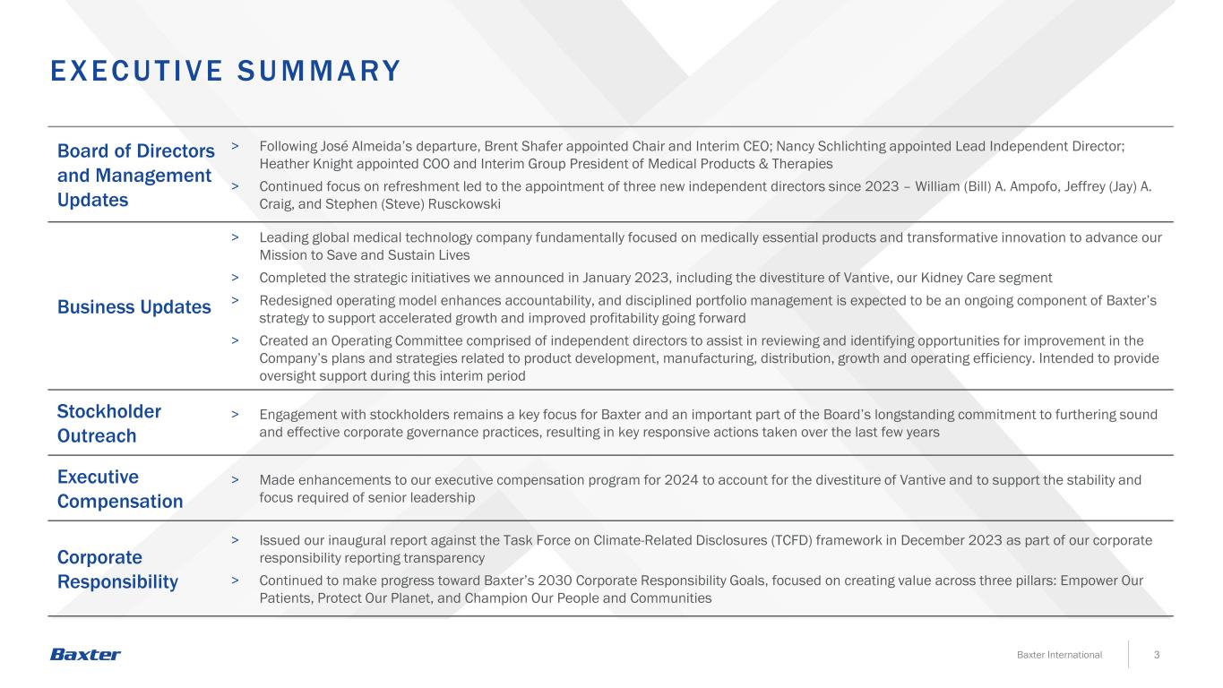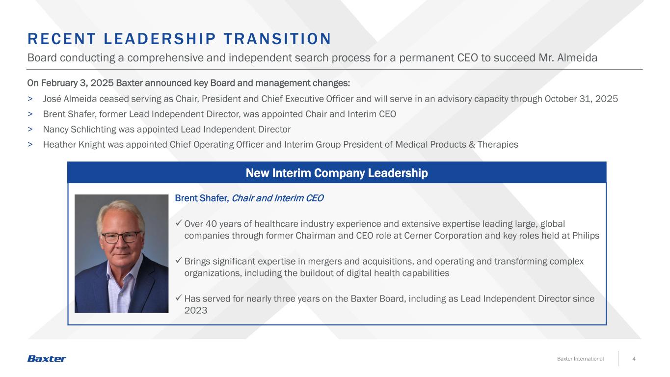 3 Board of Directors and Management Updates > Following José Almeida’s departure, Brent Shafer appointed Chair and Interim CEO; Nancy Schlichting appointed Lead Independent Director; Heather Knight appointed COO and Interim Group President of Medical Products & Therapies > Continued focus on refreshment led to the appointment of three new independent directors since 2023 – William (Bill) A. Ampofo, Jeffrey (Jay) A. Craig, and Stephen (Steve) Rusckowski Business Updates > Leading global medical technology company fundamentally focused on medically essential products and transformative innovation to advance our Mission to Save and Sustain Lives > Completed the strategic initiatives we announced in January 2023, including the divestiture of Vantive, our Kidney Care segment > Redesigned operating model enhances accountability, and disciplined portfolio management is expected to be an ongoing component of Baxter’s strategy to support accelerated growth and improved profitability going forward > Created an Operating Committee comprised of independent directors to assist in reviewing and identifying opportunities for improvement in the Company’s plans and strategies related to product development, manufacturing, distribution, growth and operating efficiency. Intended to provide oversight support during this interim period Stockholder Outreach > Engagement with stockholders remains a key focus for Baxter and an important part of the Board’s longstanding commitment to furthering sound and effective corporate governance practices, resulting in key responsive actions taken over the last few years Executive Compensation > Made enhancements to our executive compensation program for 2024 to account for the divestiture of Vantive and to support the stability and focus required of senior leadership Corporate Responsibility > Issued our inaugural report against the Task Force on Climate-Related Disclosures (TCFD) framework in December 2023 as part of our corporate responsibility reporting transparency > Continued to make progress toward Baxter’s 2030 Corporate Responsibility Goals, focused on creating value across three pillars: Empower Our Patients, Protect Our Planet, and Champion Our People and Communities EXEC UT IVE SUMMA RY Baxter International