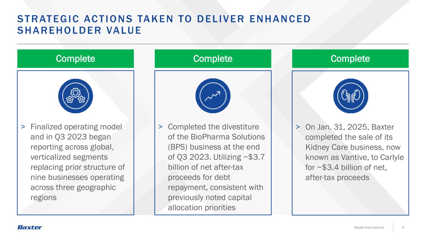 After completion of the recent Kidney Care sale, healthcare leader focused on providing an array of medical products and services across the care continuum FY 2024 Revenue by Segment Other Pharmaceuticals Medical Products & Therapies Healthcare Systems & Technologies $10.6B 23% 49% 28% <1% NEW BA XT ER P RO F IL E 1 FY 2024 Revenue by Product Category ~38,000 Employees Products in 100+ Countries Our Reach 1Sales and related figures represent FY 2024 for Total Baxter excluding Discontinued Operations. Employees and geographic availability of Baxter products counts on this slide as of December 31, 2024. Infusion Therapies & Technologies $4.1B Advanced Surgery $1.1B Care & Connectivity Solutions $1.8B Front Line Care $1.1B Injectables & Anesthesia $1.4B Drug Compounding $1.0B Other $67M Baxter International 5