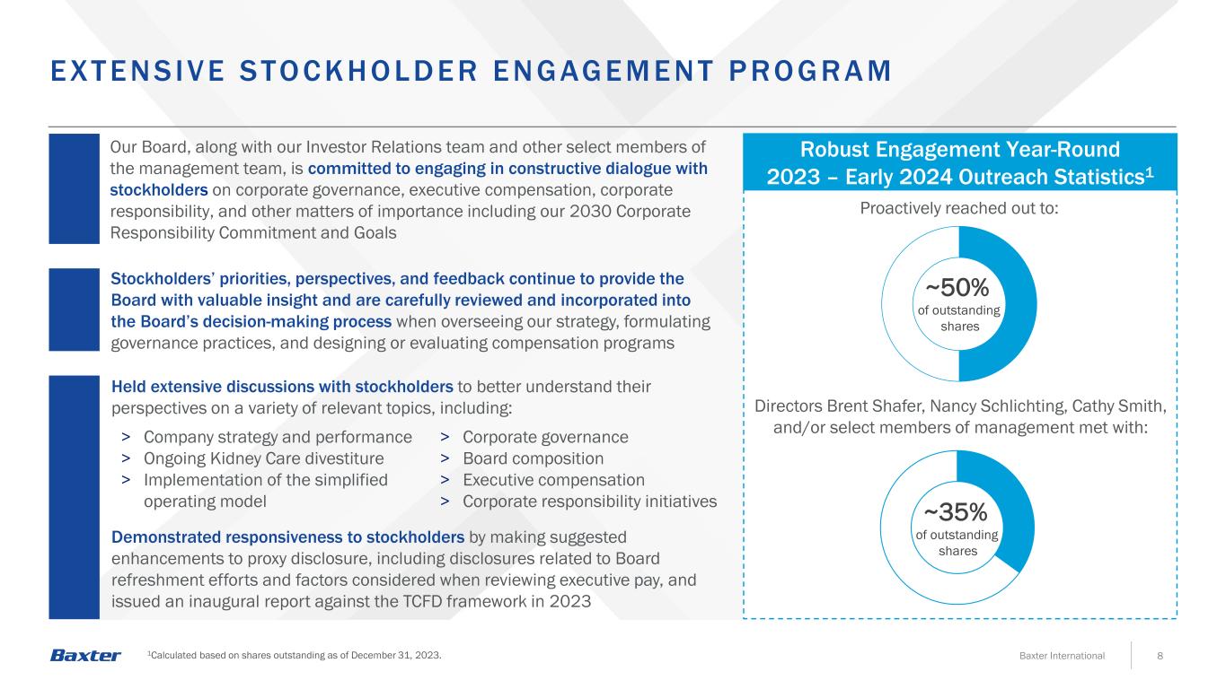 Jeffrey (Jay) A. Craig Former Chair and CEO, Meritor Committee: AC* 7Baxter International 9 out of 10 Independent Directors ~4 Years of Average Tenure Board’s Independence and Refreshment AC = Audit Committee; CHC = Compensation and Human Capital Committee; NCGPP = Nominating, Corporate Governance and Public Policy Committee; OC = Operating Committee; QRC = Quality and Regulatory Compliance Committee; * denotes committee chair Key Joined in 2024 Nancy M. Schlichting Lead Independent Director Former President and CEO, Henry Ford Health System Committees: CHC*, QRC William (Bill) A. Ampofo VP, Parts & Distribution Services and Supply Chain, Boeing Committee: OC, QRC Joined in 2023 As of February 10, 2025. 1Anticipated start date in March 2025. HIGHLY EXP ER IENC ED A ND Q UA L IF IED BOA R D Since 2023, three new world-class independent directors have joined our Board Stephen N. Oesterle, M.D. Healthcare Industry Consultant, Former SVP, Medicine & Technology, Medtronic Committees: NCGPP, QRC* Cathy R. Smith Chief Financial Officer, Starbucks1 Committees: AC, NCGPP* David S. Wilkes, M.D. Dean Emeritus of the University of Virginia School of Medicine Committees: NCGPP, QRC Brent Shafer Chair and Interim CEO Former Chairman and CEO, Cerner Corporation Patricia B. Morrison Former Executive VP, Customer Support Services & CIO, Cardinal Health Committees: AC, NCGPP, OC Stephen (Steve) Rusckowski Former Chairman, President and CEO, Quest Diagnostics Committees: CHC, OC*, QRC Joined in 2023 Amy A. Wendell Former SVP, Strategy and Business Development and Licensing, Covidien Committees: CHC, OC, QRC