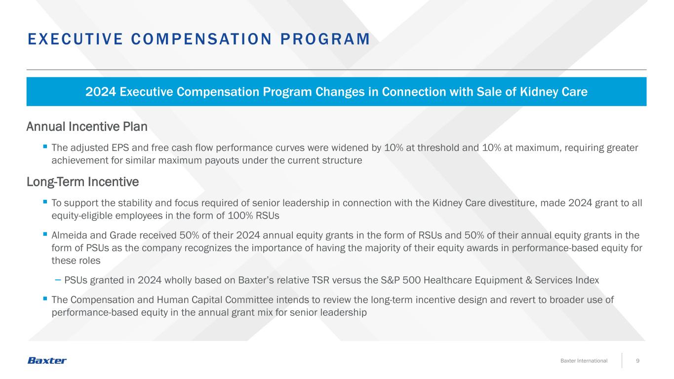 8Baxter International Robust Engagement Year-Round 2023 – Early 2024 Outreach Statistics1 Our Board, along with our Investor Relations team and other select members of the management team, is committed to engaging in constructive dialogue with stockholders on corporate governance, executive compensation, corporate responsibility, and other matters of importance including our 2030 Corporate Responsibility Commitment and Goals Stockholders’ priorities, perspectives, and feedback continue to provide the Board with valuable insight and are carefully reviewed and incorporated into the Board’s decision-making process when overseeing our strategy, formulating governance practices, and designing or evaluating compensation programs Proactively reached out to: ~50% of outstanding shares Directors Brent Shafer, Nancy Schlichting, Cathy Smith, and/or select members of management met with: ~35% of outstanding shares Held extensive discussions with stockholders to better understand their perspectives on a variety of relevant topics, including: > Company strategy and performance > Ongoing Kidney Care divestiture > Implementation of the simplified operating model > Corporate governance > Board composition > Executive compensation > Corporate responsibility initiatives Demonstrated responsiveness to stockholders by making suggested enhancements to proxy disclosure, including disclosures related to Board refreshment efforts and factors considered when reviewing executive pay, and issued an inaugural report against the TCFD framework in 2023 EXT ENSIVE STO C K HO L DER ENG AGEMENT P RO GR A M 1Calculated based on shares outstanding as of December 31, 2023.
