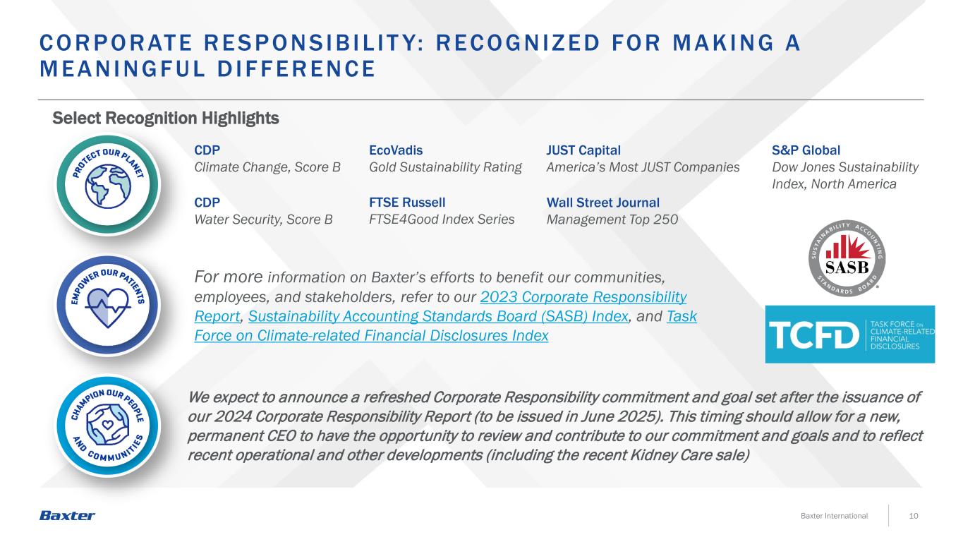 10Baxter International C O R P O R AT E R ESP O NSIB IL IT Y: R EC O GNIZ ED FO R MA K IN G A MEA NINGF UL D IF F ER ENC E Select Recognition Highlights For more information on Baxter’s efforts to benefit our communities, employees, and stakeholders, refer to our 2023 Corporate Responsibility Report, Sustainability Accounting Standards Board (SASB) Index, and Task Force on Climate-related Financial Disclosures Index EcoVadis Gold Sustainability Rating CDP Climate Change, Score B CDP Water Security, Score B S&P Global Dow Jones Sustainability Index, North America Wall Street Journal Management Top 250 FTSE Russell FTSE4Good Index Series JUST Capital America’s Most JUST Companies We expect to announce a refreshed Corporate Responsibility commitment and goal set after the issuance of our 2024 Corporate Responsibility Report (to be issued in June 2025). This timing should allow for a new, permanent CEO to have the opportunity to review and contribute to our commitment and goals and to reflect recent operational and other developments (including the recent Kidney Care sale)