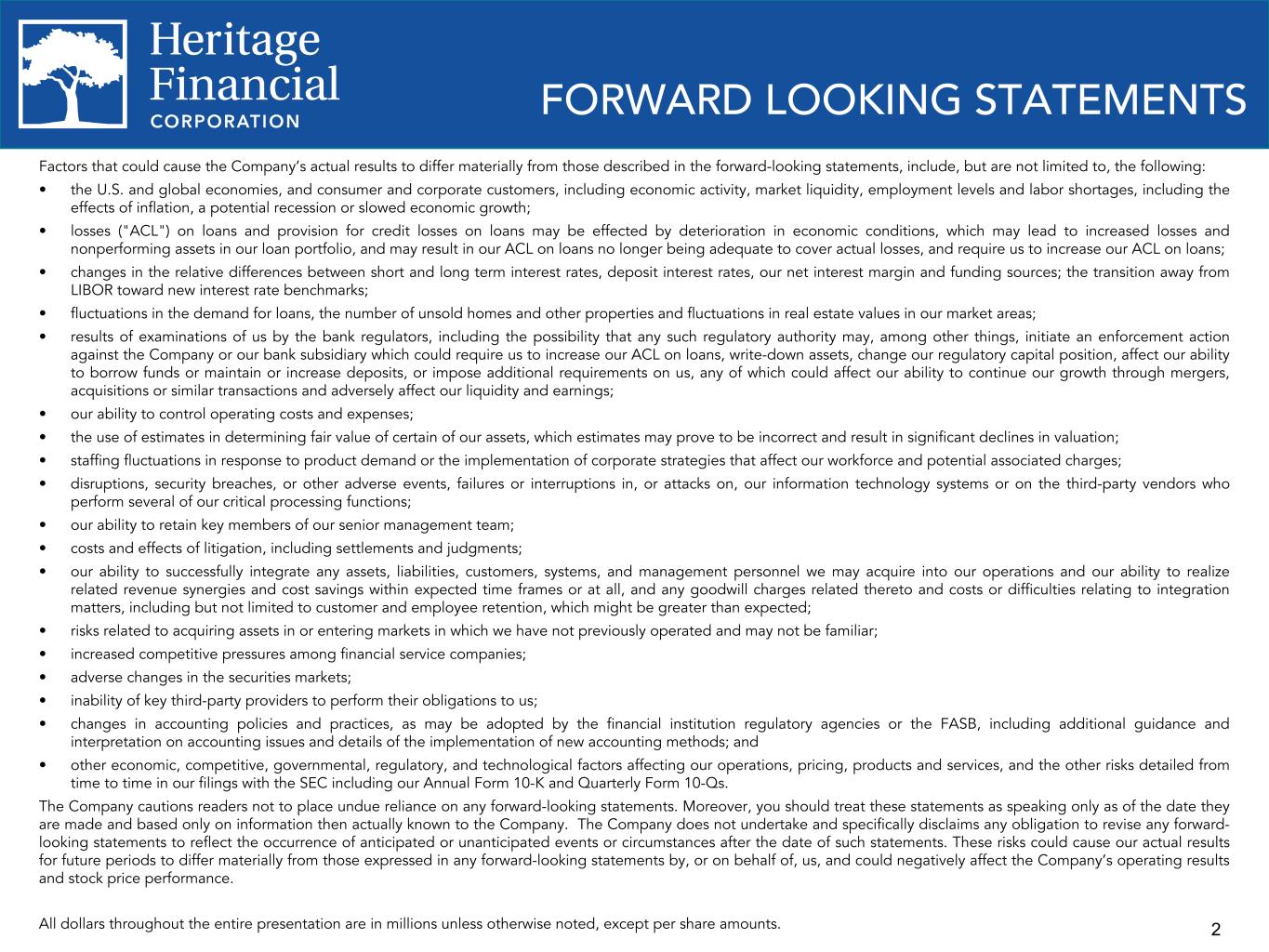 2 Factors that could cause the Company’s actual results to differ materially from those described in the forward-looking statements, include, but are not limited to, the following: • the U.S. and global economies, and consumer and corporate customers, including economic activity, market liquidity, employment levels and labor shortages, including the effects of inflation, a potential recession or slowed economic growth; • losses ("ACL") on loans and provision for credit losses on loans may be effected by deterioration in economic conditions, which may lead to increased losses and nonperforming assets in our loan portfolio, and may result in our ACL on loans no longer being adequate to cover actual losses, and require us to increase our ACL on loans; • changes in the relative differences between short and long term interest rates, deposit interest rates, our net interest margin and funding sources; the transition away from LIBOR toward new interest rate benchmarks; • fluctuations in the demand for loans, the number of unsold homes and other properties and fluctuations in real estate values in our market areas; • results of examinations of us by the bank regulators, including the possibility that any such regulatory authority may, among other things, initiate an enforcement action against the Company or our bank subsidiary which could require us to increase our ACL on loans, write-down assets, change our regulatory capital position, affect our ability to borrow funds or maintain or increase deposits, or impose additional requirements on us, any of which could affect our ability to continue our growth through mergers, acquisitions or similar transactions and adversely affect our liquidity and earnings; • our ability to control operating costs and expenses; • the use of estimates in determining fair value of certain of our assets, which estimates may prove to be incorrect and result in significant declines in valuation; • staffing fluctuations in response to product demand or the implementation of corporate strategies that affect our workforce and potential associated charges; • disruptions, security breaches, or other adverse events, failures or interruptions in, or attacks on, our information technology systems or on the third-party vendors who perform several of our critical processing functions; • our ability to retain key members of our senior management team; • costs and effects of litigation, including settlements and judgments; • our ability to successfully integrate any assets, liabilities, customers, systems, and management personnel we may acquire into our operations and our ability to realize related revenue synergies and cost savings within expected time frames or at all, and any goodwill charges related thereto and costs or difficulties relating to integration matters, including but not limited to customer and employee retention, which might be greater than expected; • risks related to acquiring assets in or entering markets in which we have not previously operated and may not be familiar; • increased competitive pressures among financial service companies; • adverse changes in the securities markets; • inability of key third-party providers to perform their obligations to us; • changes in accounting policies and practices, as may be adopted by the financial institution regulatory agencies or the FASB, including additional guidance and interpretation on accounting issues and details of the implementation of new accounting methods; and • other economic, competitive, governmental, regulatory, and technological factors affecting our operations, pricing, products and services, and the other risks detailed from time to time in our filings with the SEC including our Annual Form 10-K and Quarterly Form 10-Qs. The Company cautions readers not to place undue reliance on any forward-looking statements. Moreover, you should treat these statements as speaking only as of the date they are made and based only on information then actually known to the Company. The Company does not undertake and specifically disclaims any obligation to revise any forward- looking statements to reflect the occurrence of anticipated or unanticipated events or circumstances after the date of such statements. These risks could cause our actual results for future periods to differ materially from those expressed in any forward-looking statements by, or on behalf of, us, and could negatively affect the Company’s operating results and stock price performance. All dollars throughout the entire presentation are in millions unless otherwise noted, except per share amounts. FORWARD LOOKING STATEMENTS