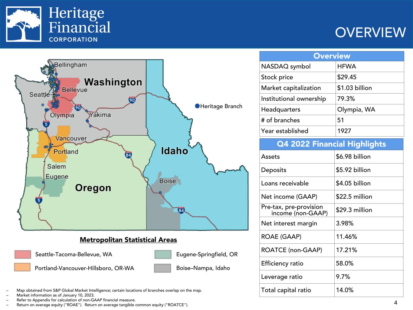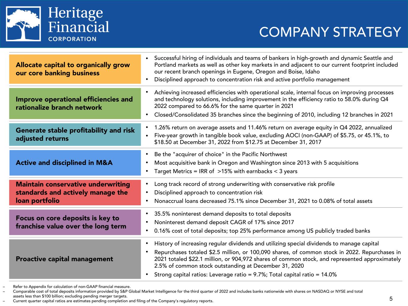 4 OVERVIEW Overview NASDAQ symbol HFWA Stock price $29.45 Market capitalization $1.03 billion Institutional ownership 79.3% Headquarters Olympia, WA # of branches 51 Year established 1927 Q4 2022 Financial Highlights Assets $6.98 billion Deposits $5.92 billion Loans receivable $4.05 billion Net income (GAAP) $22.5 million Pre-tax, pre-provision income (non-GAAP) $29.3 million Net interest margin 3.98% ROAE (GAAP) 11.46% ROATCE (non-GAAP) 17.21% Efficiency ratio 58.0% Leverage ratio 9.7% Total capital ratio 14.0%– Map obtained from S&P Global Market Intelligence; certain locations of branches overlap on the map. – Market information as of January 10, 2023. – Refer to Appendix for calculation of non-GAAP financial measure. – Return on average equity ("ROAE"). Return on average tangible common equity ("ROATCE"). Metropolitan Statistical Areas Seattle-Tacoma-Bellevue, WA Portland-Vancouver-Hillsboro, OR-WA Eugene-Springfield, OR Boise–Nampa, Idaho Heritage Branch