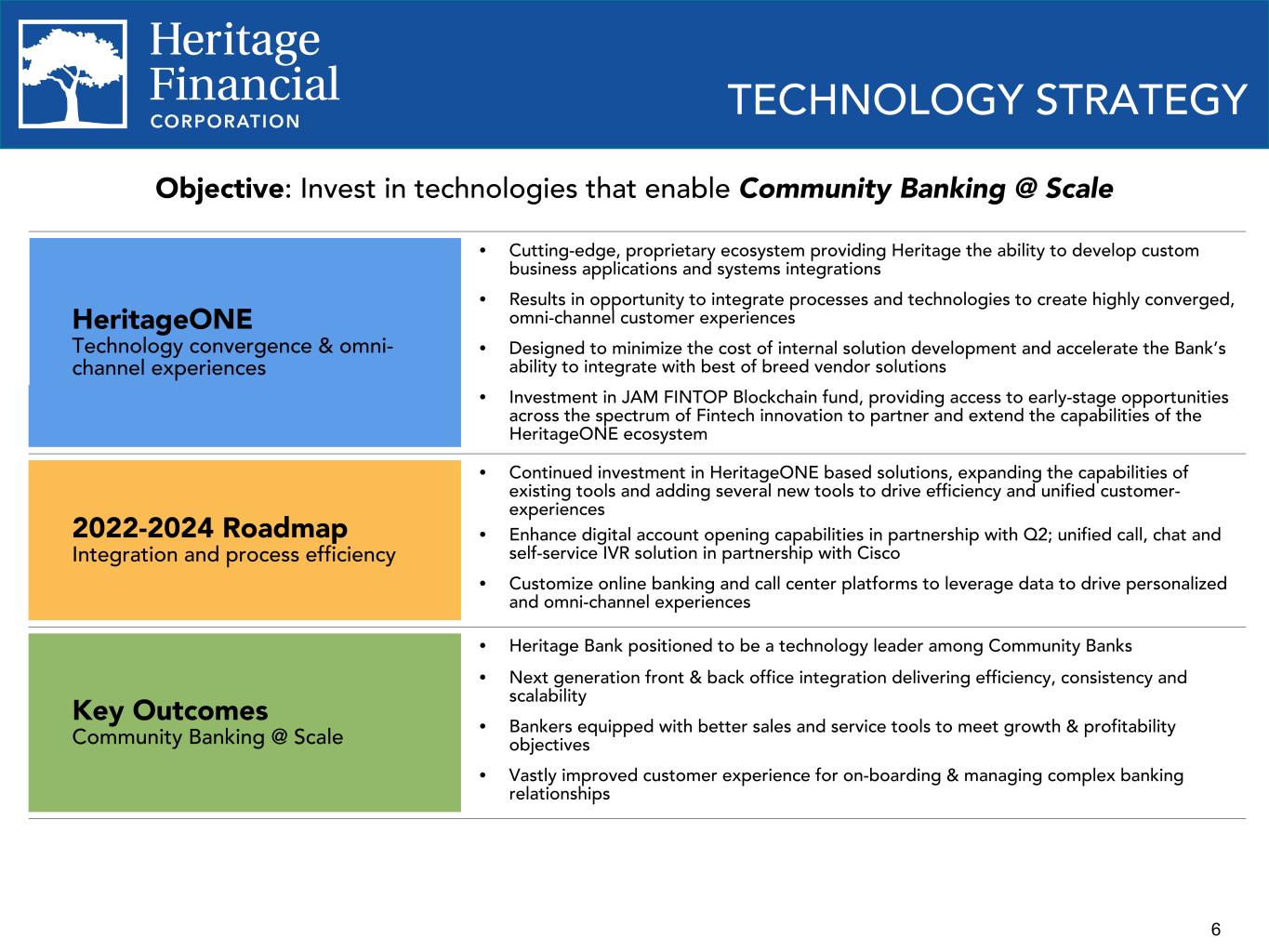 7 HeritageONE Proprietary technology ecosystem for converging product and service solutions to enable Community Banking @ Scale TECHNOLOGY INNOVATION Build Our proprietary HeritageONE platform provides an API-based framework and set of tools for selective in-house development of applications and integrations to fill the gap in available solutions that create efficient, scalable, and well orchestrated business processes for Commercial Community Banks. HeritageONE business application development is focused on opportunities to create differentiated and value-added service experiences for our core customers: Commercial Loans 360 (CL360) • Streamlines Commercial Lending processes • Single platform for all credit actions Heritage 360 (H360) • “Single pain of glass” for relationship mgmt. • Keeps service and decisions close to the customer • Automates immediate service needs • 99% reduction in time to fill some service requests Treasury Management 360 (TM360) • Single platform for onboarding all TM services • Automates setup tasks • Customer gets immediate access to key services Partner Investment in the HeritageONE ecosystem frees us from sole dependency on our core provider, enabling the bank to pursue relationships with other third-party innovators. This in turn will allow us to bring to market new and creative solutions that ensure that our customers have access to the best options for when, where and how they want to bank with Heritage. Integrate Leveraging our proprietary HeritageONE middleware capabilities to create API-level integrations to maximize the value and effectiveness of in-house and third-party solutions and enable true omni-channel customer experiences.