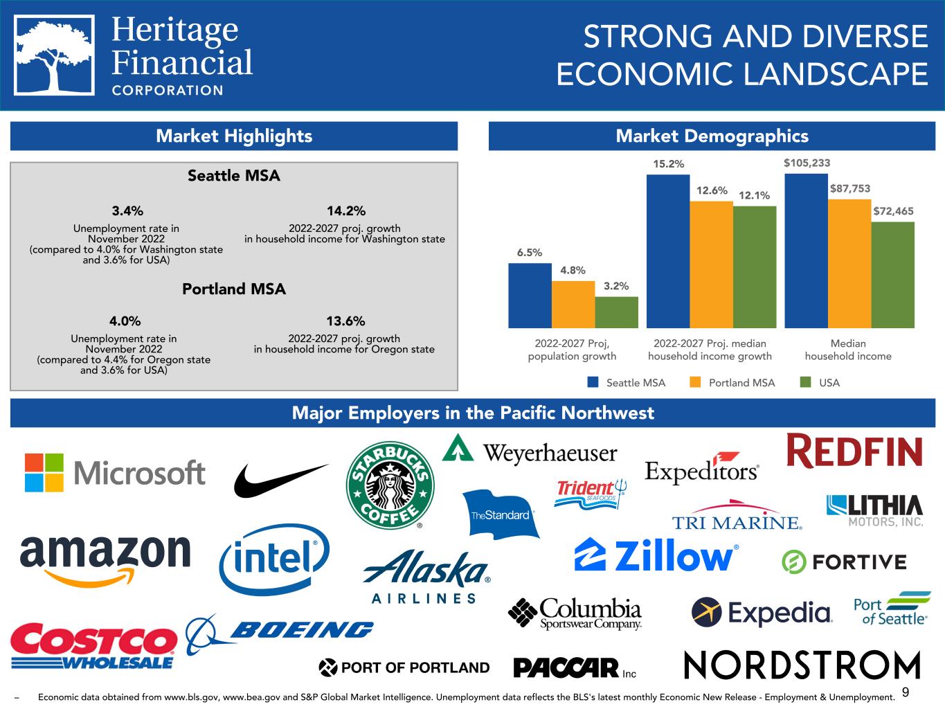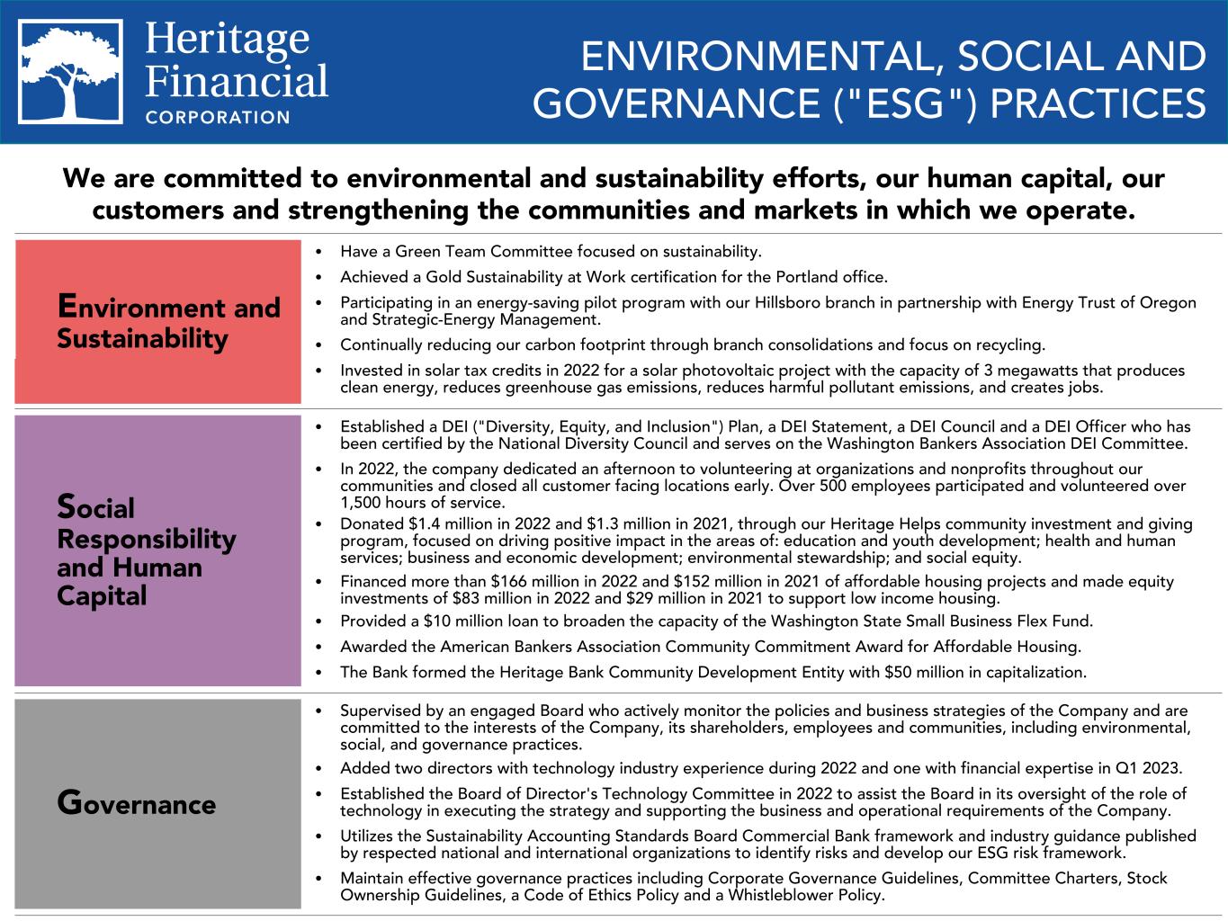 8 ENVIRONMENTAL, SOCIAL AND GOVERNANCE ("ESG") PRACTICES We are committed to environmental and sustainability efforts, our human capital, our customers and strengthening the communities and markets in which we operate. Environment and Sustainability Ÿ Have a Green Team Committee focused on sustainability. Ÿ Achieved a Gold Sustainability at Work certification for the Portland office. Ÿ Participating in an energy-saving pilot program with our Hillsboro branch in partnership with Energy Trust of Oregon and Strategic-Energy Management. Ÿ Continually reducing our carbon footprint through branch consolidations and focus on recycling. Ÿ Invested in solar tax credits in 2022 for a solar photovoltaic project with the capacity of 3 megawatts that produces clean energy, reduces greenhouse gas emissions, reduces harmful pollutant emissions, and creates jobs. Social Responsibility and Human Capital Ÿ Established a DEI ("Diversity, Equity, and Inclusion") Plan, a DEI Statement, a DEI Council and a DEI Officer who has been certified by the National Diversity Council and serves on the Washington Bankers Association DEI Committee. Ÿ In 2022, the company dedicated an afternoon to volunteering at organizations and nonprofits throughout our communities and closed all customer facing locations early. Over 500 employees participated and volunteered over 1,500 hours of service. Ÿ Donated $1.4 million in 2022 and $1.3 million in 2021, through our Heritage Helps community investment and giving program, focused on driving positive impact in the areas of: education and youth development; health and human services; business and economic development; environmental stewardship; and social equity. Ÿ Financed more than $166 million in 2022 and $152 million in 2021 of affordable housing projects and made equity investments of $83 million in 2022 and $29 million in 2021 to support low income housing. Ÿ Provided a $10 million loan to broaden the capacity of the Washington State Small Business Flex Fund. Ÿ Awarded the American Bankers Association Community Commitment Award for Affordable Housing. Ÿ The Bank formed the Heritage Bank Community Development Entity with $50 million in capitalization. Governance Ÿ Supervised by an engaged Board who actively monitor the policies and business strategies of the Company and are committed to the interests of the Company, its shareholders, employees and communities, including environmental, social, and governance practices. Ÿ Added two directors with technology industry experience during 2022 and one with financial expertise in Q1 2023. Ÿ Established the Board of Director's Technology Committee in 2022 to assist the Board in its oversight of the role of technology in executing the strategy and supporting the business and operational requirements of the Company. Ÿ Utilizes the Sustainability Accounting Standards Board Commercial Bank framework and industry guidance published by respected national and international organizations to identify risks and develop our ESG risk framework. Ÿ Maintain effective governance practices including Corporate Governance Guidelines, Committee Charters, Stock Ownership Guidelines, a Code of Ethics Policy and a Whistleblower Policy.