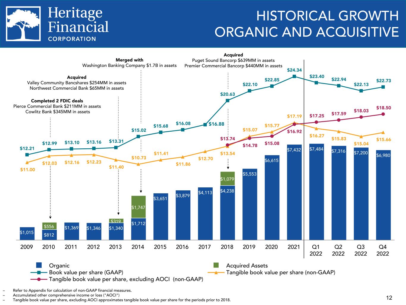 11 POTENTIAL GROWTH OPPORTUNITIES – Map obtained from S&P Global Market Intelligence. – Certain locations of bank headquarters overlap on the map. – Financial information as of the most recent quarter publicly available. • Long-term goal to build a PNW regional commercial community bank; potential opportunities for M&A and production team lift-outs in OR and ID in addition to WA. • HFWA positioned to be the acquiror of choice in the Pacific Northwest. • Significant number of banks remaining in HFWA footprint; further consolidation is expected. – 11 banks between $200 million and $500 million in assets – 20 banks between $500 million and $1.0 billion in assets – 15 banks between $1.0 billion and $3.5 billion in assets • Financial parameters include 15% IRR and earnback of < 3 years. Bank headquarters