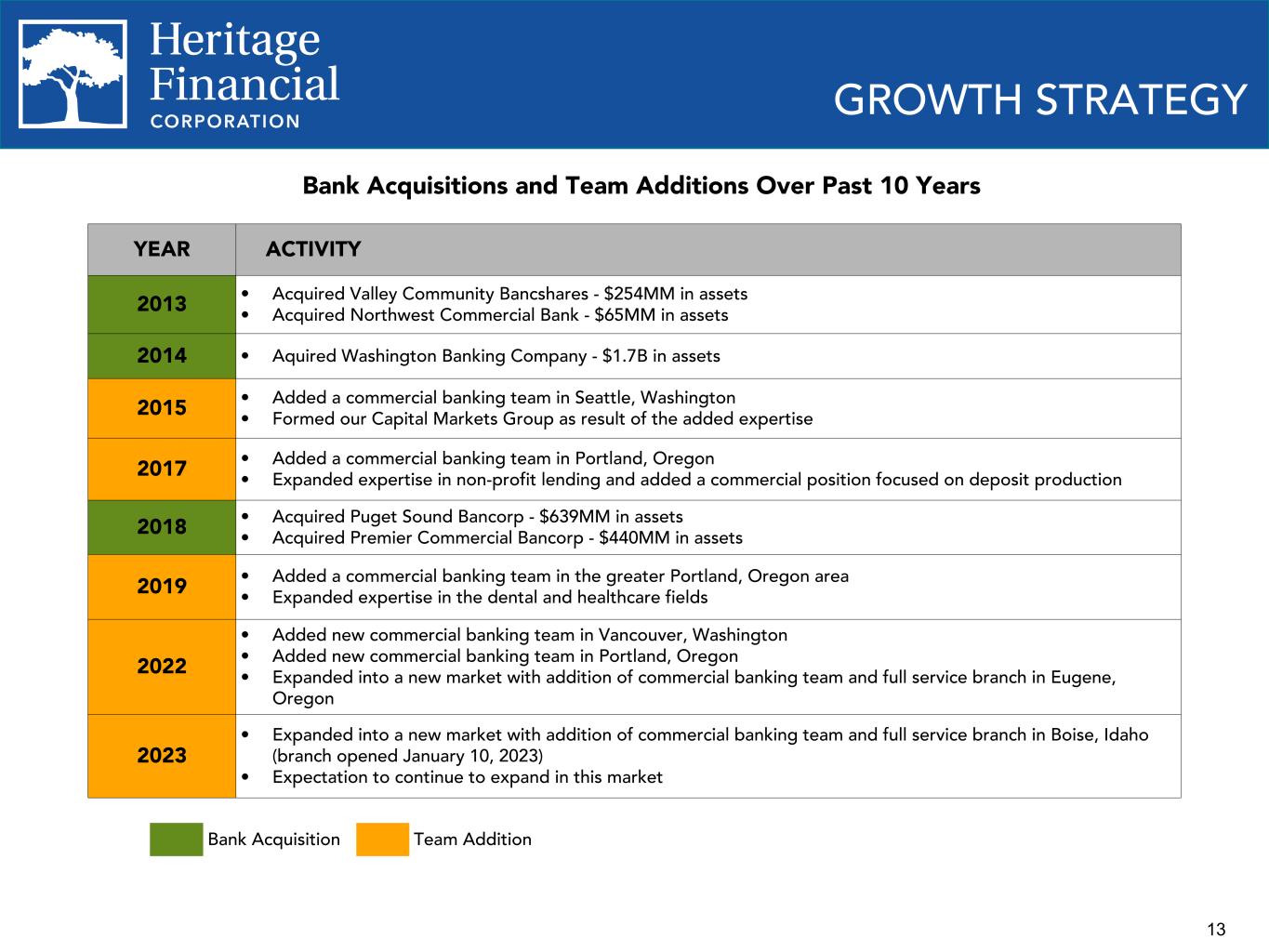 12 Completed 2 FDIC deals Pierce Commercial Bank $211MM in assets Cowlitz Bank $345MM in assets Acquired Puget Sound Bancorp $639MM in assets Premier Commercial Bancorp $440MM in assets $1,015 $812 $1,369 $1,346 $1,340 $1,712 $3,651 $3,879 $4,113 $4,238 $5,553 $6,615 $7,432 $7,484 $7,316 $7,200 $6,980 $556 $319 $1,747 $1,079 $12.21 $12.99 $13.10 $13.16 $13.31 $15.02 $15.68 $16.08 $20.63 $22.10 $22.85 $24.34 $23.40 $22.94 $22.13 $22.73 $11.00 $12.03 $12.16 $12.23 $11.40 $10.73 $11.41 $11.86 $12.70 $13.54 $15.07 $15.77 $17.19 $16.27 $15.83 $15.04 $15.66$13.74 $14.78 $15.08 $16.92 $17.25 $17.59 $18.03 $18.50 Organic Acquired Assets Book value per share (GAAP) Tangible book value per share (non-GAAP) Tangible book value per share, excluding AOCI (non-GAAP) 2009 2010 2011 2012 2013 2014 2015 2016 2017 2018 2019 2020 2021 Q1 2022 Q2 2022 Q3 2022 Q4 2022 HISTORICAL GROWTH ORGANIC AND ACQUISITIVE Merged with Washington Banking Company $1.7B in assets Acquired Valley Community Bancshares $254MM in assets Northwest Commercial Bank $65MM in assets – Refer to Appendix for calculation of non-GAAP financial measures. – Accumulated other comprehensive income or loss ("AOCI") – Tangible book value per share, excluding AOCI approximates tangible book value per share for the periods prior to 2018. $16.88