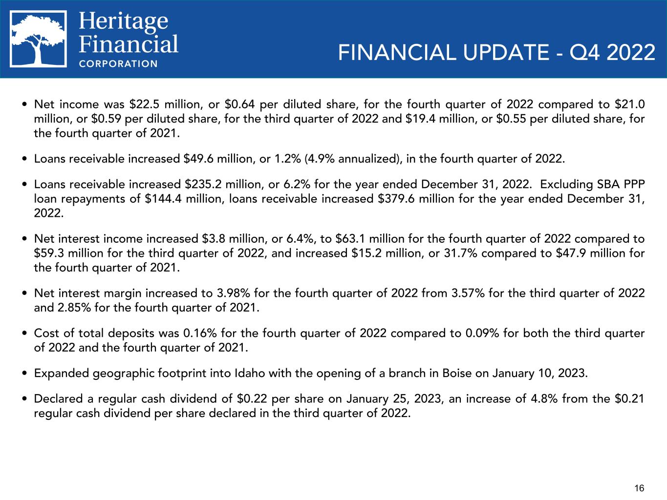 16 FINANCIAL UPDATE - Q4 2022 • Net income was $22.5 million, or $0.64 per diluted share, for the fourth quarter of 2022 compared to $21.0 million, or $0.59 per diluted share, for the third quarter of 2022 and $19.4 million, or $0.55 per diluted share, for the fourth quarter of 2021. • Loans receivable increased $49.6 million, or 1.2% (4.9% annualized), in the fourth quarter of 2022. • Loans receivable increased $235.2 million, or 6.2% for the year ended December 31, 2022. Excluding SBA PPP loan repayments of $144.4 million, loans receivable increased $379.6 million for the year ended December 31, 2022. • Net interest income increased $3.8 million, or 6.4%, to $63.1 million for the fourth quarter of 2022 compared to $59.3 million for the third quarter of 2022, and increased $15.2 million, or 31.7% compared to $47.9 million for the fourth quarter of 2021. • Net interest margin increased to 3.98% for the fourth quarter of 2022 from 3.57% for the third quarter of 2022 and 2.85% for the fourth quarter of 2021. • Cost of total deposits was 0.16% for the fourth quarter of 2022 compared to 0.09% for both the third quarter of 2022 and the fourth quarter of 2021. • Expanded geographic footprint into Idaho with the opening of a branch in Boise on January 10, 2023. • Declared a regular cash dividend of $0.22 per share on January 25, 2023, an increase of 4.8% from the $0.21 regular cash dividend per share declared in the third quarter of 2022.