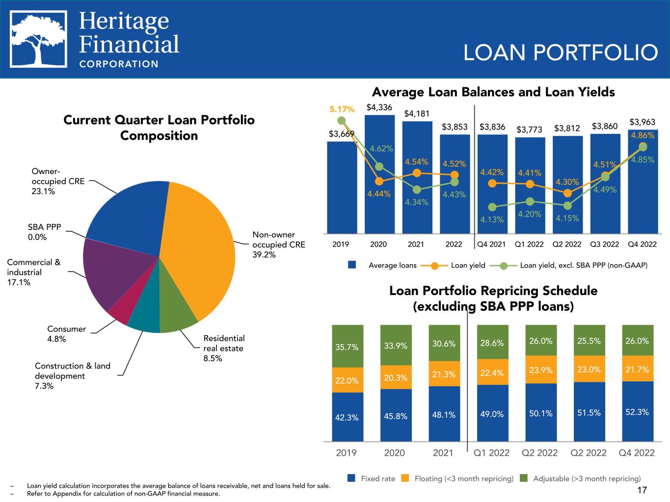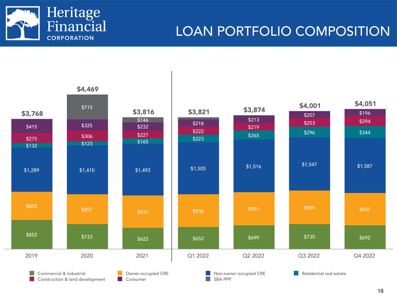 17 $3,669 $4,336 $4,181 $3,853 $3,836 $3,773 $3,812 $3,860 $3,963 5.17% 4.44% 4.54% 4.52% 4.34% 4.43% 4.42% 4.41% 4.30% 4.51% 4.86% 4.13% 4.20% 4.15% 4.49% 4.85% Average loans Loan yield Loan yield, excl. SBA PPP (non-GAAP) 2019 2020 2021 2022 Q4 2021 Q1 2022 Q2 2022 Q3 2022 Q4 2022 Average Loan Balances and Loan Yields Commercial & industrial 17.1% SBA PPP 0.0% Owner- occupied CRE 23.1% Non-owner occupied CRE 39.2% Residential real estate 8.5% Construction & land development 7.3% Consumer 4.8% LOAN PORTFOLIO Current Quarter Loan Portfolio Composition Loan Portfolio Repricing Schedule (excluding SBA PPP loans) 35.7% 33.9% 30.6% 28.6% 26.0% 25.5% 26.0% 22.0% 20.3% 21.3% 22.4% 23.9% 23.0% 21.7% 42.3% 45.8% 48.1% 49.0% 50.1% 51.5% 52.3% Fixed rate Floating (<3 month repricing) Adjustable (>3 month repricing) 2019 2020 2021 Q1 2022 Q2 2022 Q2 2022 Q4 2022 – Loan yield calculation incorporates the average balance of loans receivable, net and loans held for sale. – Refer to Appendix for calculation of non-GAAP financial measure. 4.62%