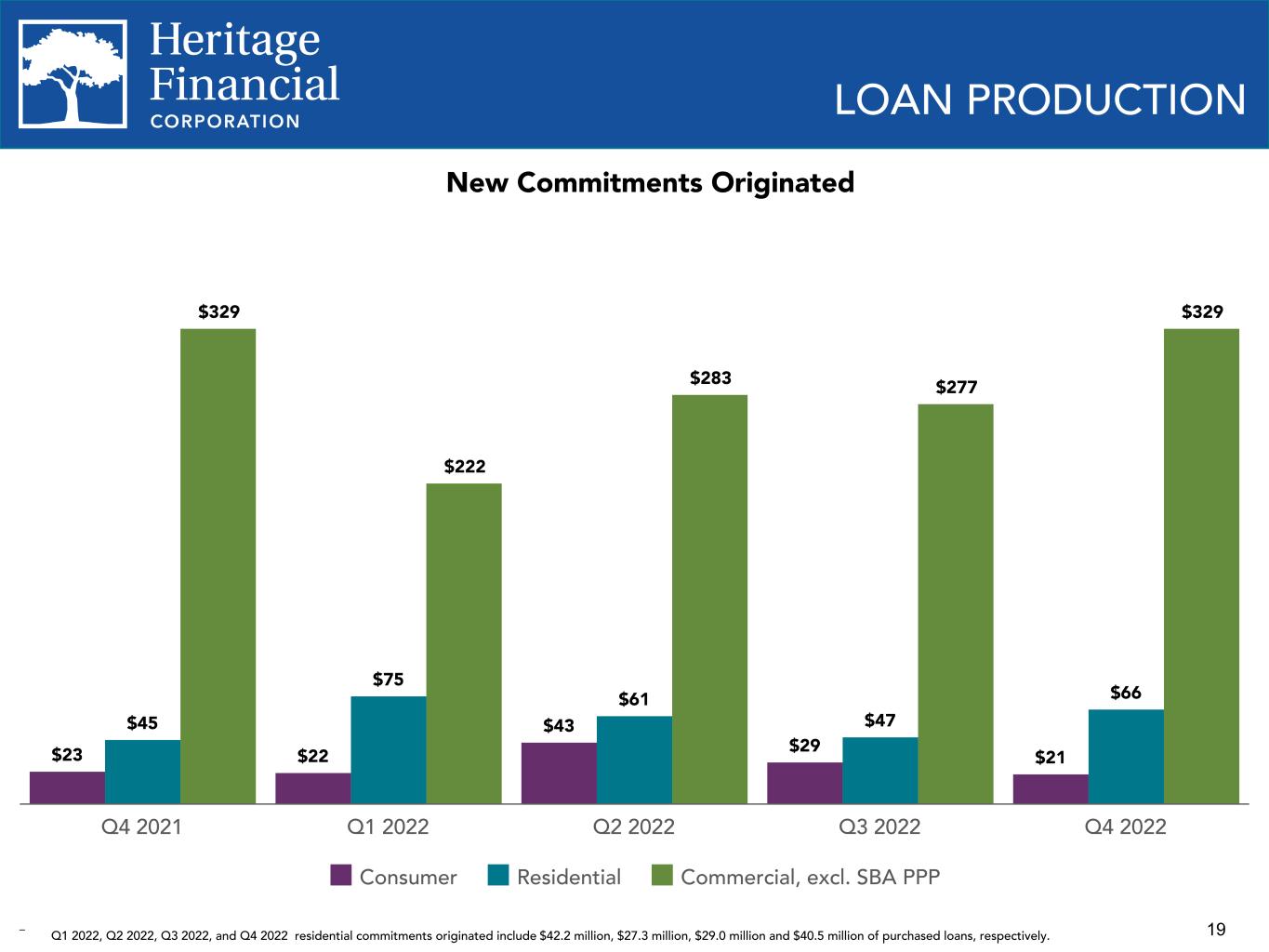 18 LOAN PORTFOLIO COMPOSITION $3,768 $4,469 $3,816 $3,821 $3,874 $4,001 $4,051 $852 $733 $622 $652 $699 $735 $692 $805 $857 $931 $936 $951 $959 $937 $1,289 $1,410 $1,493 $1,505 $1,516 $1,547 $1,587 $132 $123 $165 $223 $265 $296 $344 $275 $306 $227 $222 $219 $253 $294 $415 $325 $232 $218 $213 $207 $196 $715 $146 Commercial & industrial Owner-occupied CRE Non-owner occupied CRE Residential real estate Construction & land development Consumer SBA PPP 2019 2020 2021 Q1 2022 Q2 2022 Q3 2022 Q4 2022