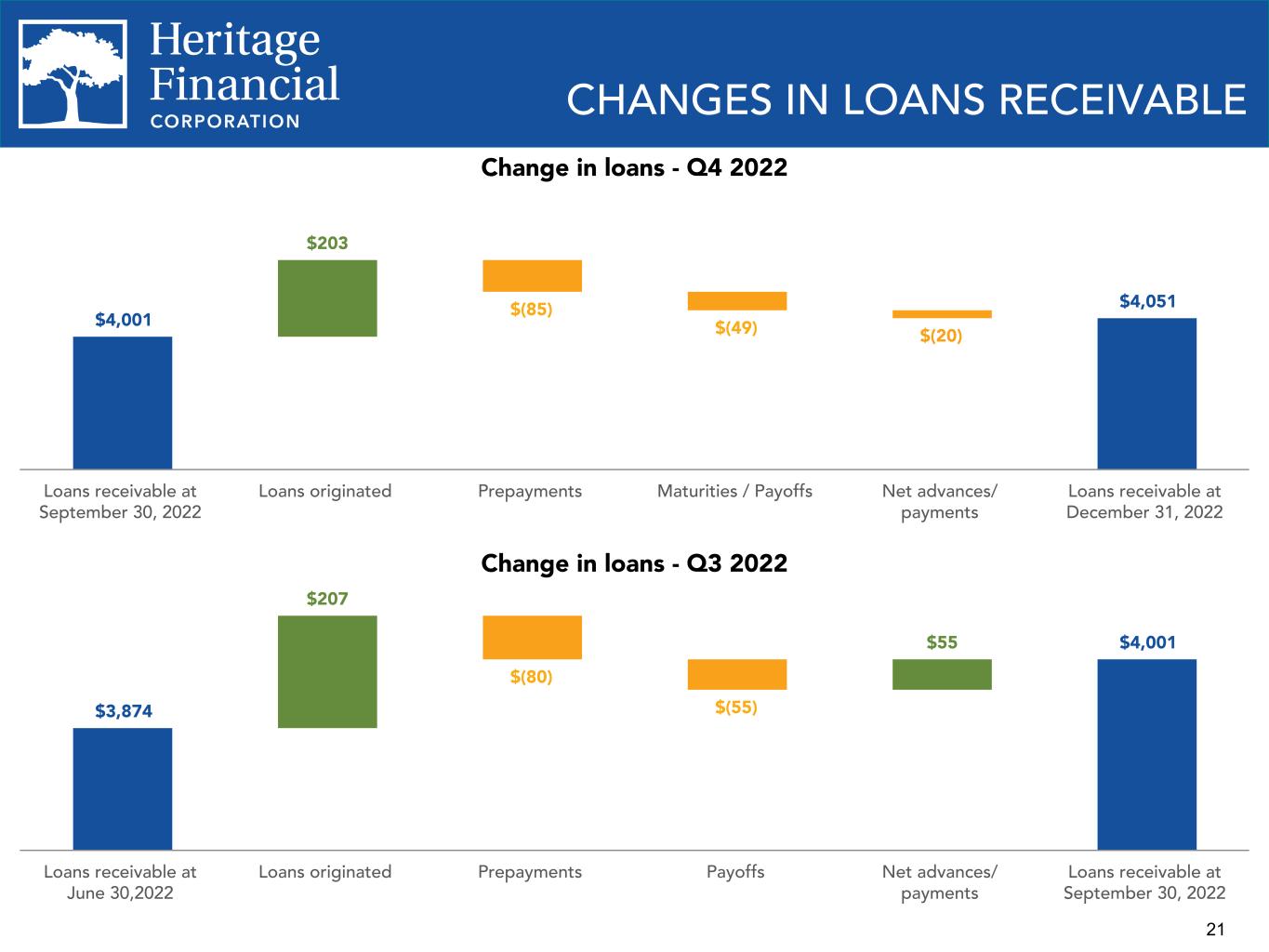 21 CHANGES IN LOANS RECEIVABLE $4,001 $203 $(85) $(49) $(20) $4,051 Loans receivable at September 30, 2022 Loans originated Prepayments Maturities / Payoffs Net advances/ payments Loans receivable at December 31, 2022 $3,874 $207 $(80) $(55) $55 $4,001 Loans receivable at June 30,2022 Loans originated Prepayments Payoffs Net advances/ payments Loans receivable at September 30, 2022 Change in loans - Q4 2022 Change in loans - Q3 2022