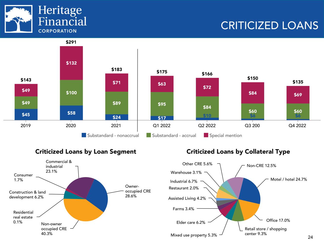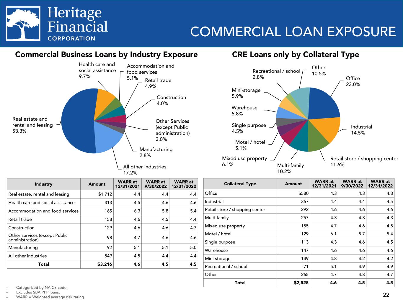 22 COMMERCIAL LOAN EXPOSURE Commercial Business Loans by Industry Exposure Industry Amount WARR at 12/31/2021 WARR at 9/30/2022 WARR at 12/31/2022 Real estate, rental and leasing $1,712 4.4 4.4 4.4 Health care and social assistance 313 4.5 4.6 4.6 Accommodation and food services 165 6.3 5.8 5.4 Retail trade 158 4.6 4.5 4.4 Construction 129 4.6 4.6 4.7 Other services (except Public administration) 98 4.7 4.6 4.6 Manufacturing 92 5.1 5.1 5.0 All other industries 549 4.5 4.4 4.4 Total $3,216 4.6 4.5 4.5 CRE Loans only by Collateral Type Collateral Type Amount WARR at 12/31/2021 WARR at 9/30/2022 WARR at 12/31/2022 Office $580 4.3 4.3 4.3 Industrial 367 4.4 4.4 4.5 Retail store / shopping center 292 4.6 4.6 4.6 Multi-family 257 4.3 4.3 4.3 Mixed use property 155 4.7 4.6 4.5 Motel / hotel 129 6.1 5.7 5.4 Single purpose 113 4.3 4.6 4.5 Warehouse 147 4.6 4.6 4.6 Mini-storage 149 4.8 4.2 4.2 Recreational / school 71 5.1 4.9 4.9 Other 265 4.7 4.8 4.7 Total $2,525 4.6 4.5 4.5 – Categorized by NAICS code. – Excludes SBA PPP loans. – WARR = Weighted average risk rating. Office 23.0% Industrial 14.5% Retail store / shopping center 11.6%Multi-family 10.2% Mixed use property 6.1% Motel / hotel 5.1% Single purpose 4.5% Warehouse 5.8% Mini-storage 5.9% Recreational / school 2.8% Other 10.5% Real estate and rental and leasing 53.3% Health care and social assistance 9.7% Accommodation and food services 5.1% Retail trade 4.9% Construction 4.0% Other Services (except Public administration) 3.0% Manufacturing 2.8% All other industries 17.2%